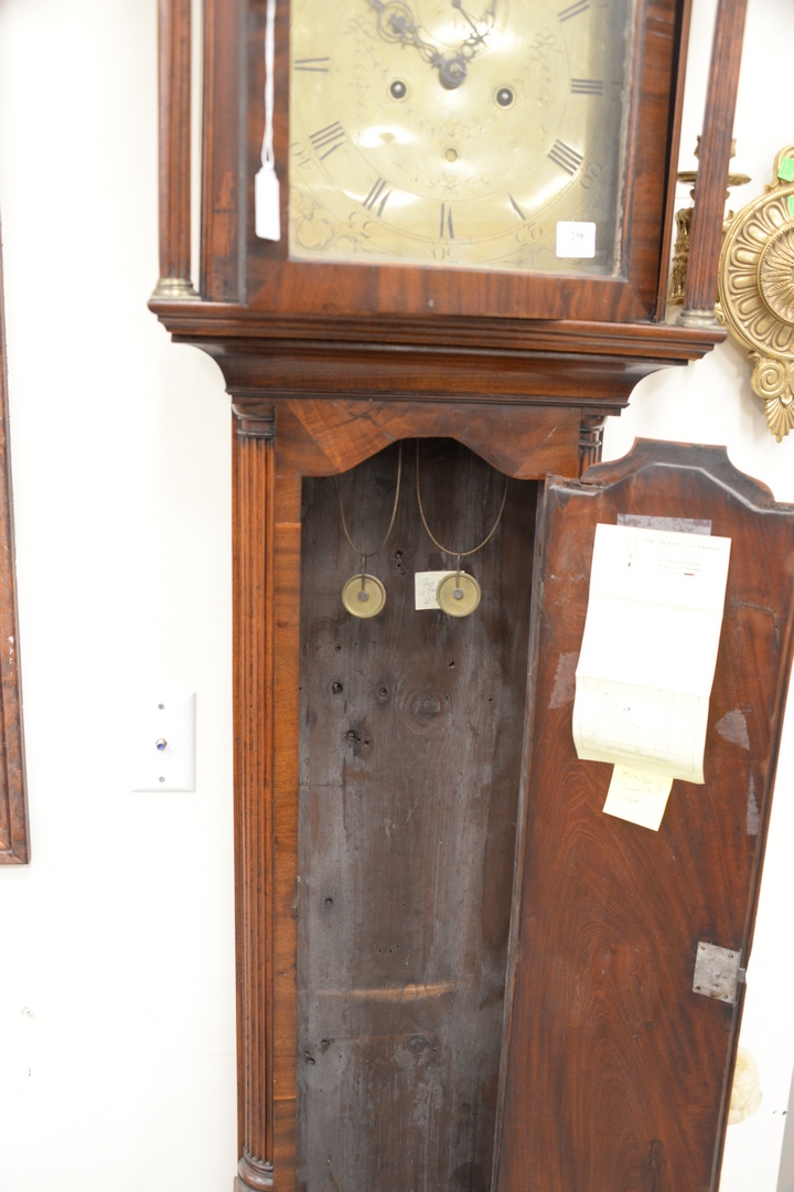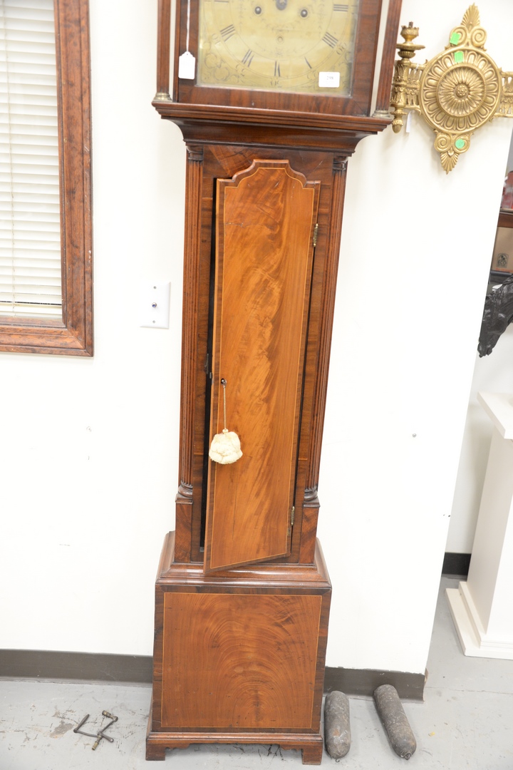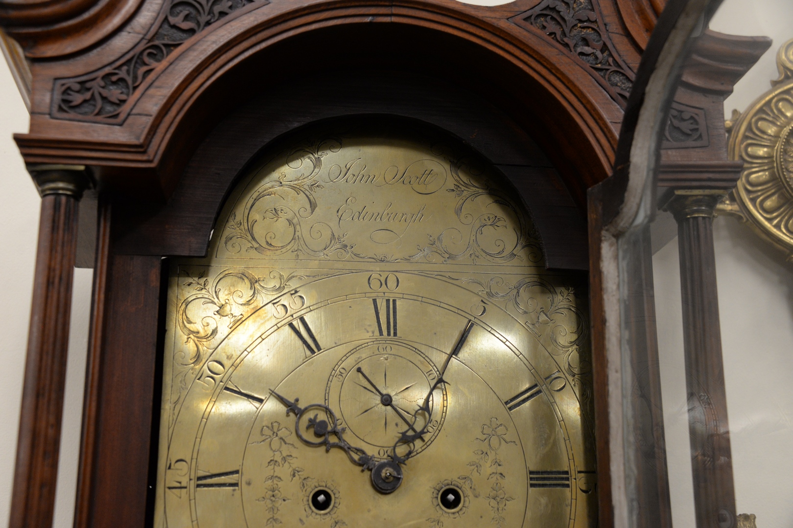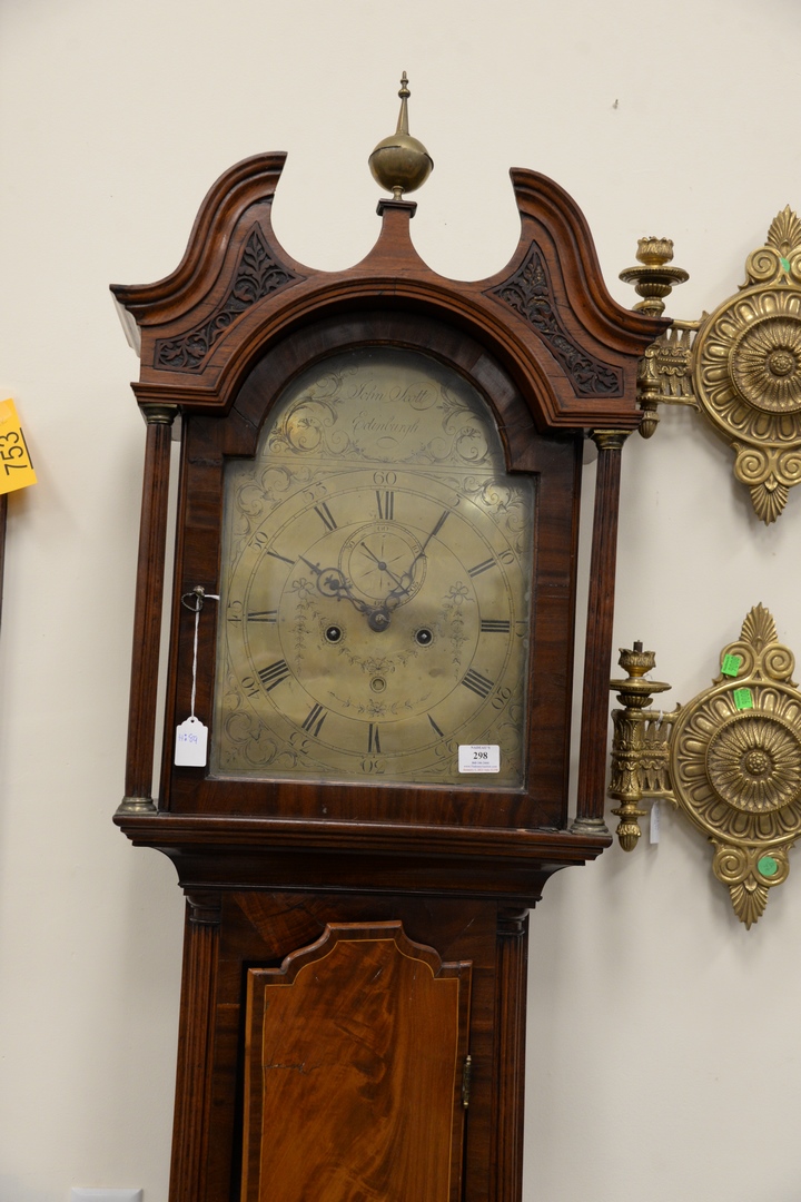 Lot 298: John Scott Edinburgh Tall Case Clock with brass dial, carved broken arch pediment, mahogany inlaid case height 89 inches