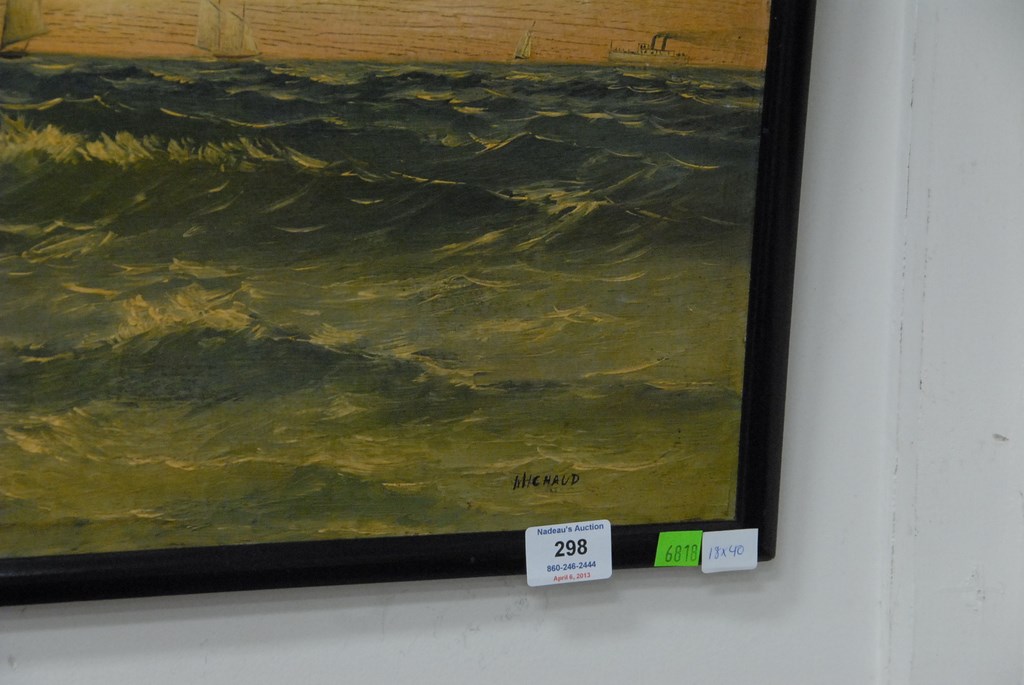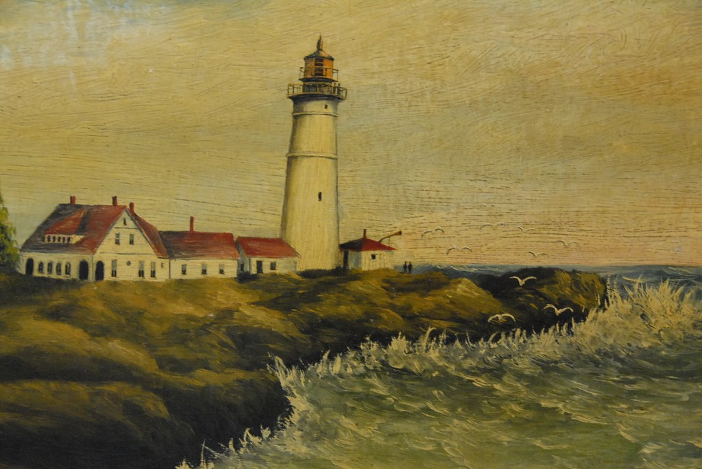 Michaud MAIN COAST LIGHTHOUSE oil on board signed lower right Michaud 20th century 18 x 40