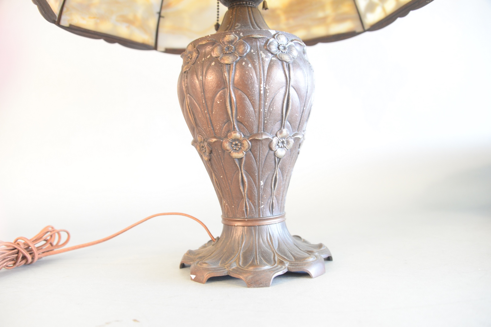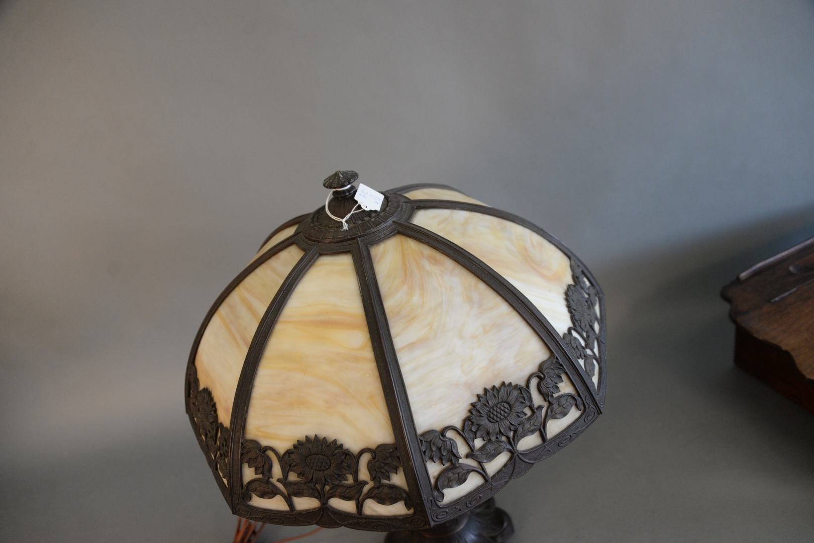 Miller Slag glass panel shade table lamp and base with flower motif, height 22 inches, diameter 19 inches