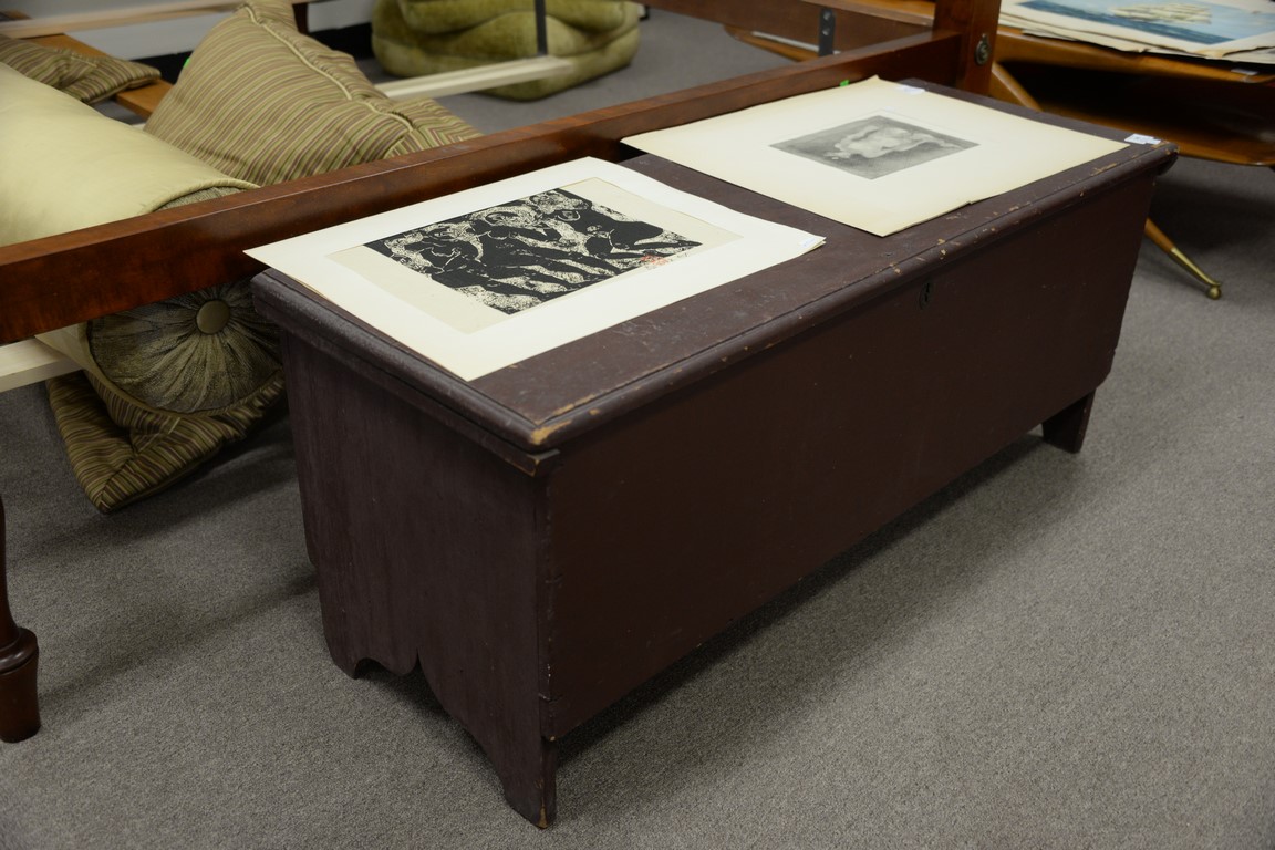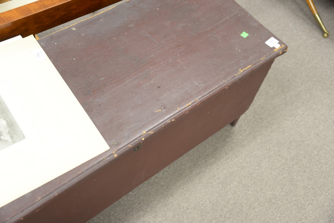 Lot 298: Primitive red painted blanket lift top chest with boot jack ends. ht. 18in., wd. 44in., dp. 16in.