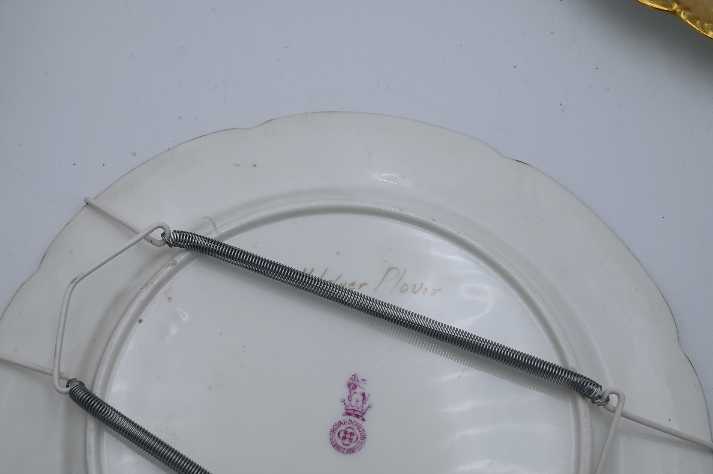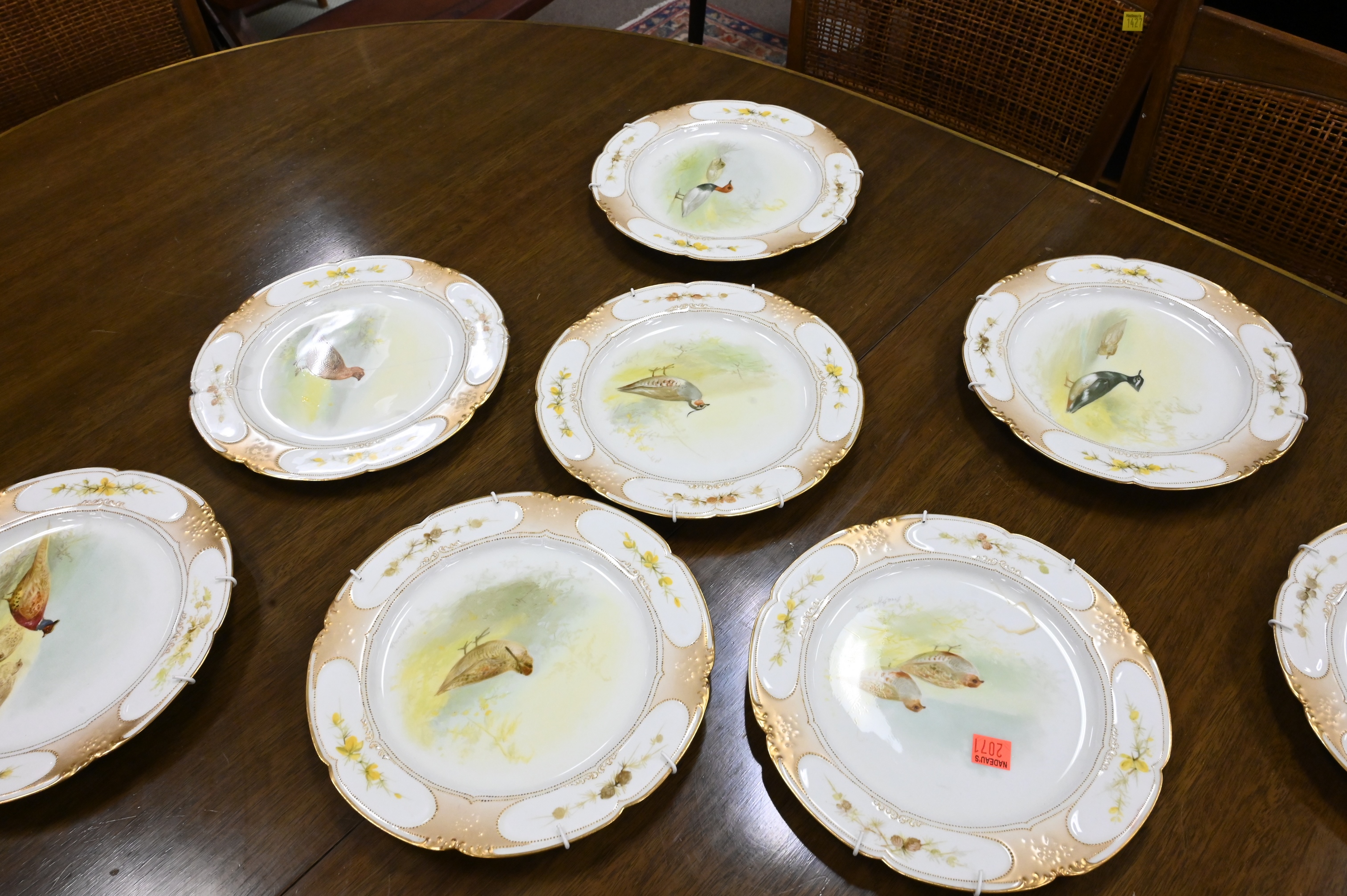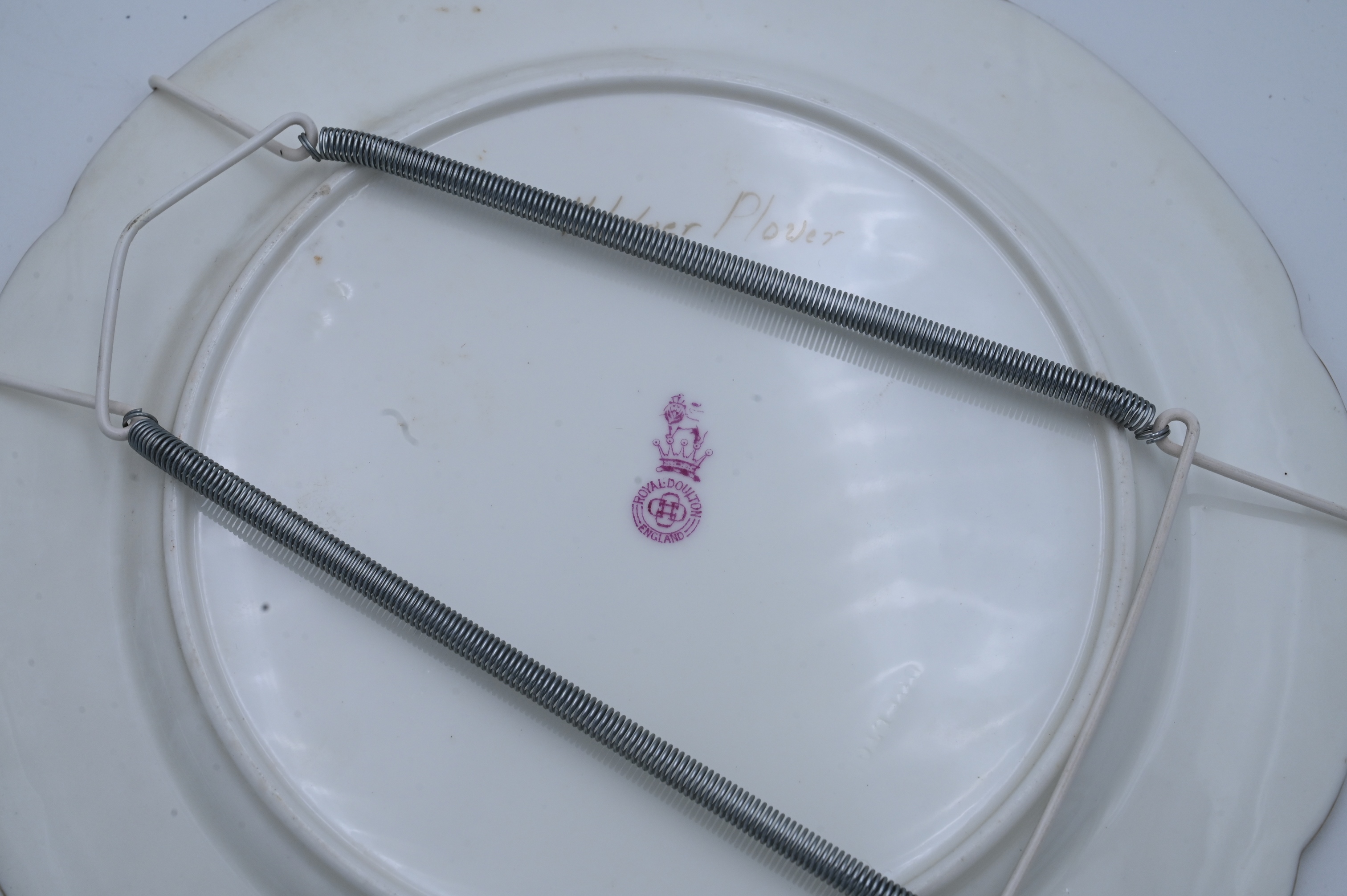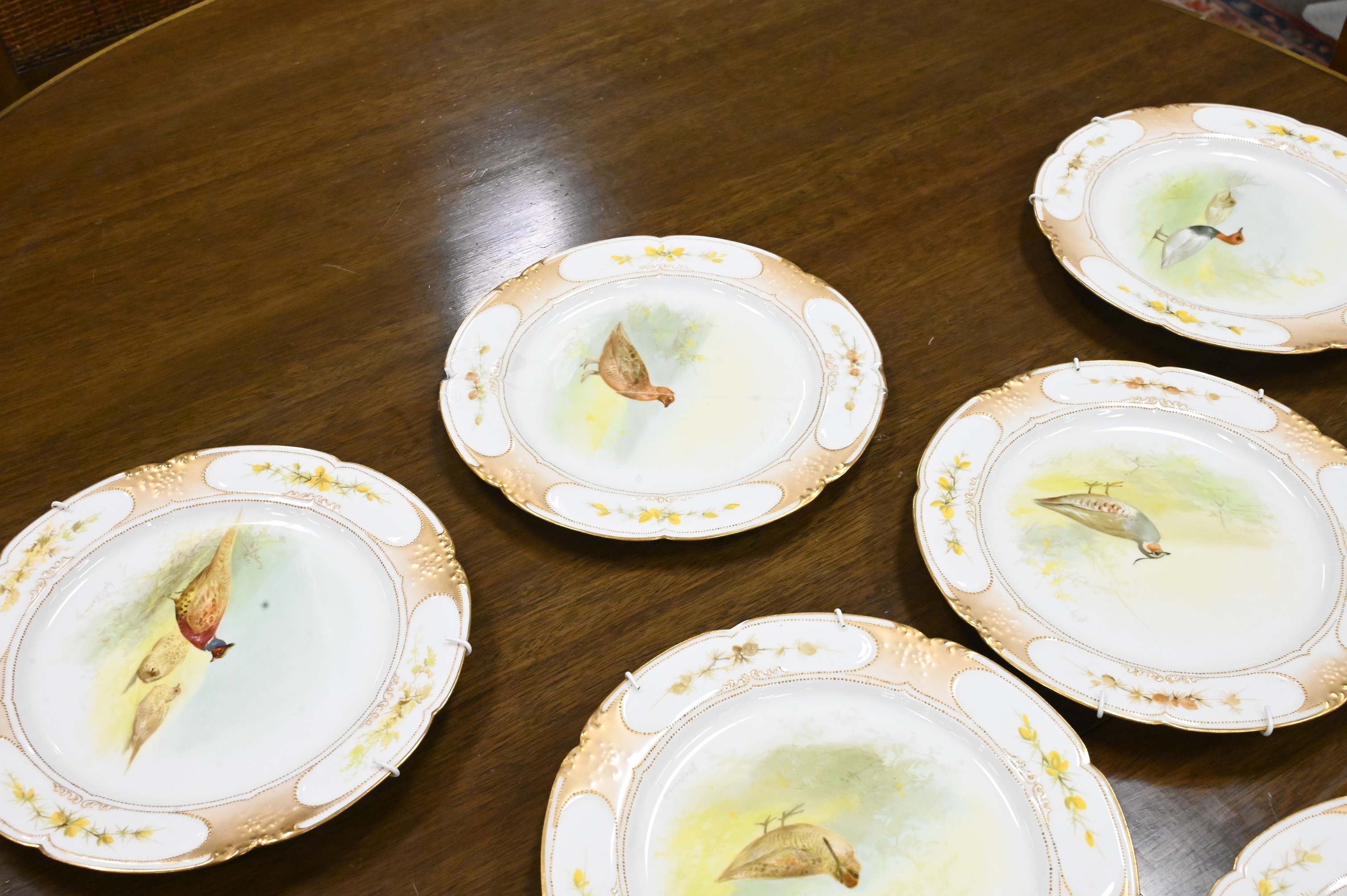 Set of 12 Royal Doulton Game Bird Plates, having hand painted birds, signed Fred Hancock, two plates repaired, diameter 9 inches.