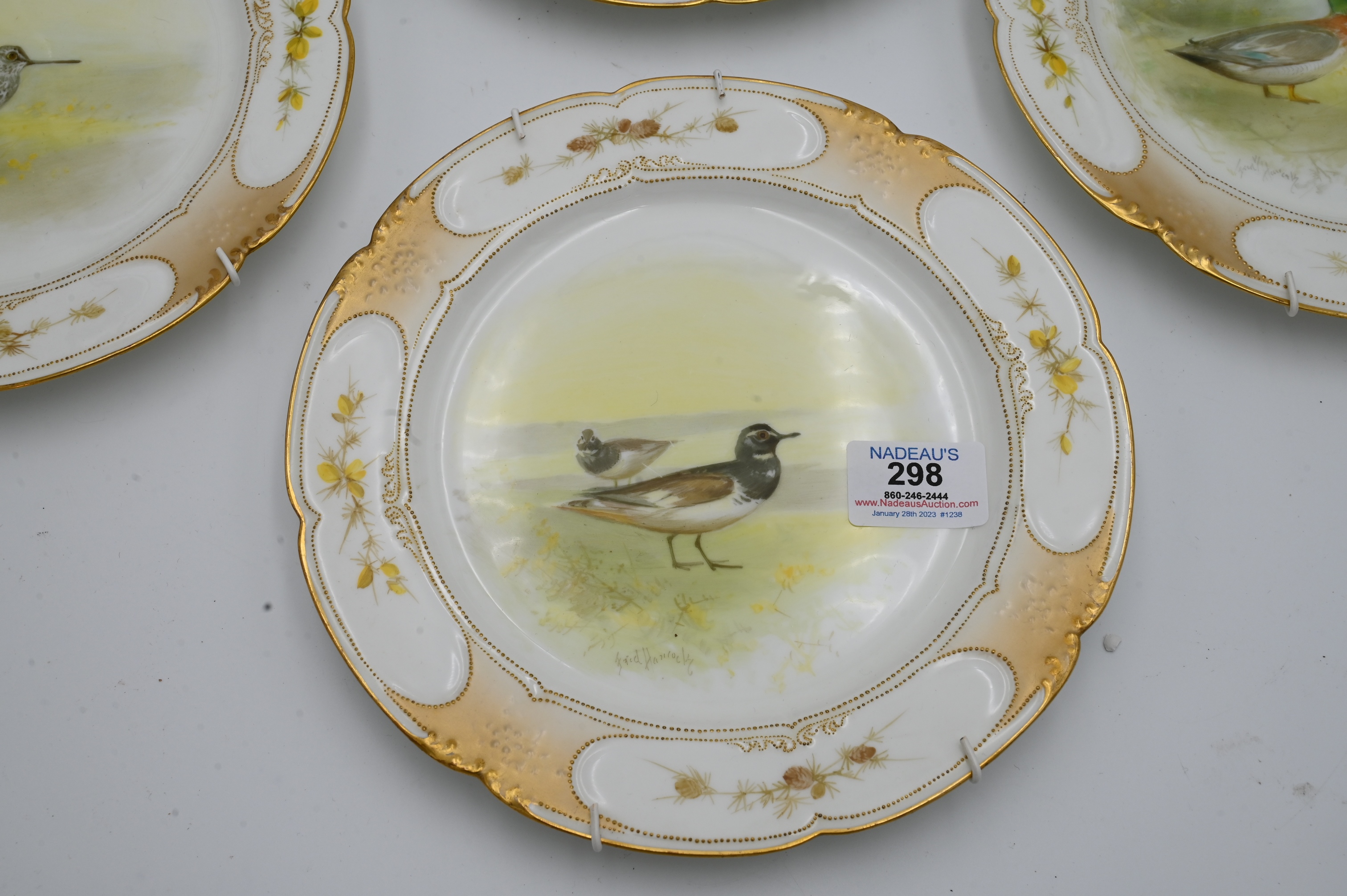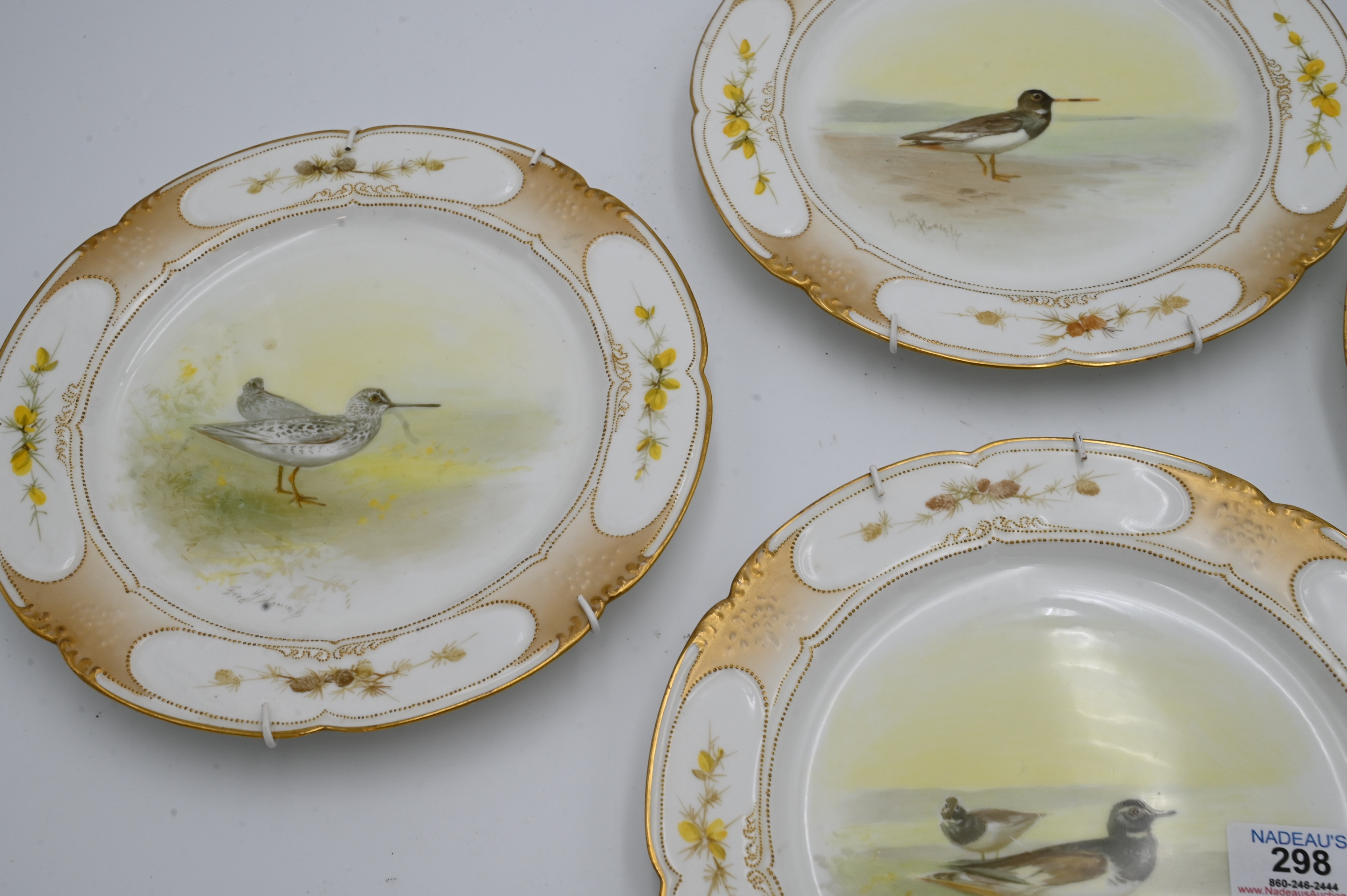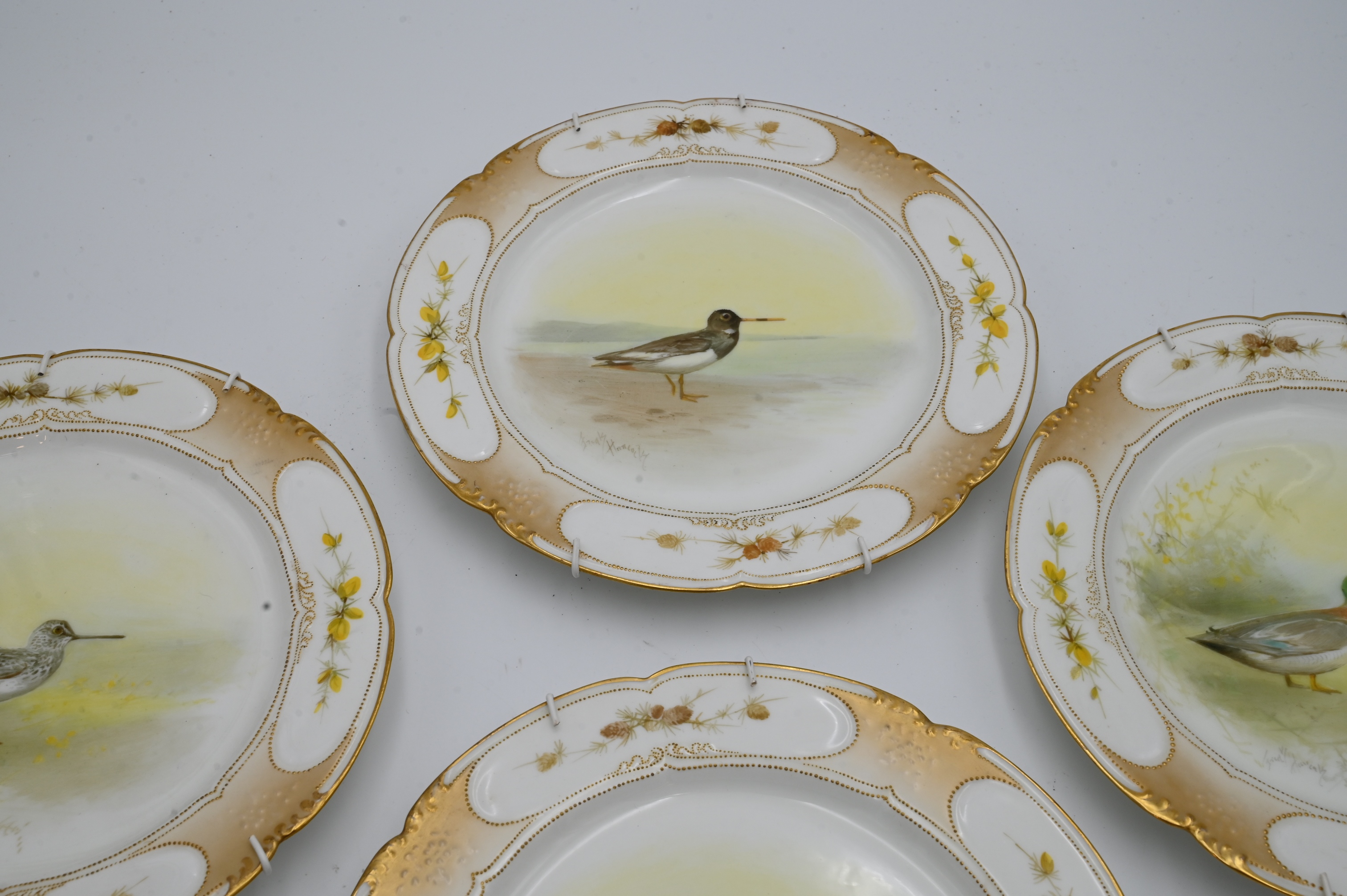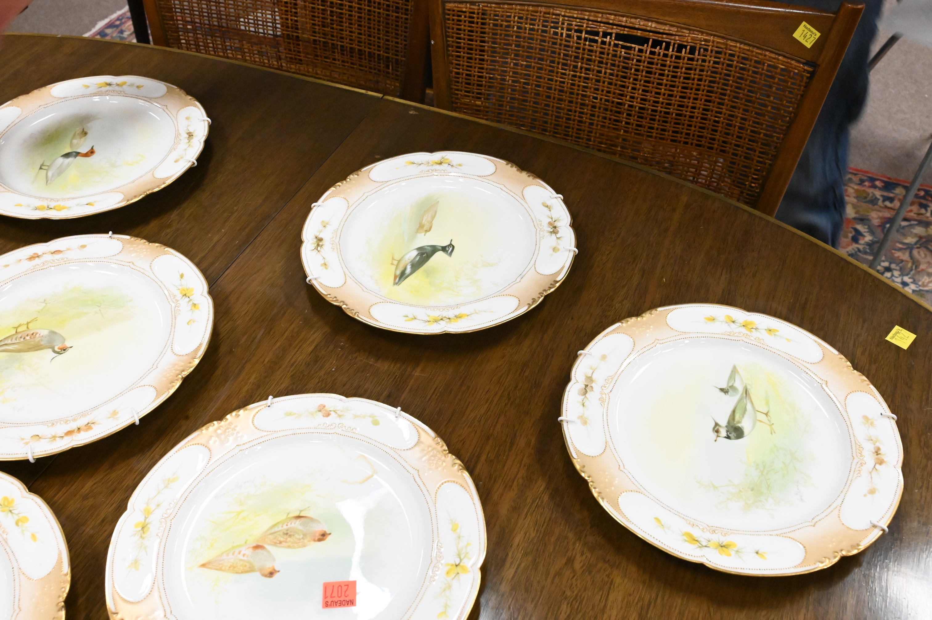 Set of 12 Royal Doulton Game Bird Plates, having hand painted birds, signed Fred Hancock, two plates repaired, diameter 9 inches.