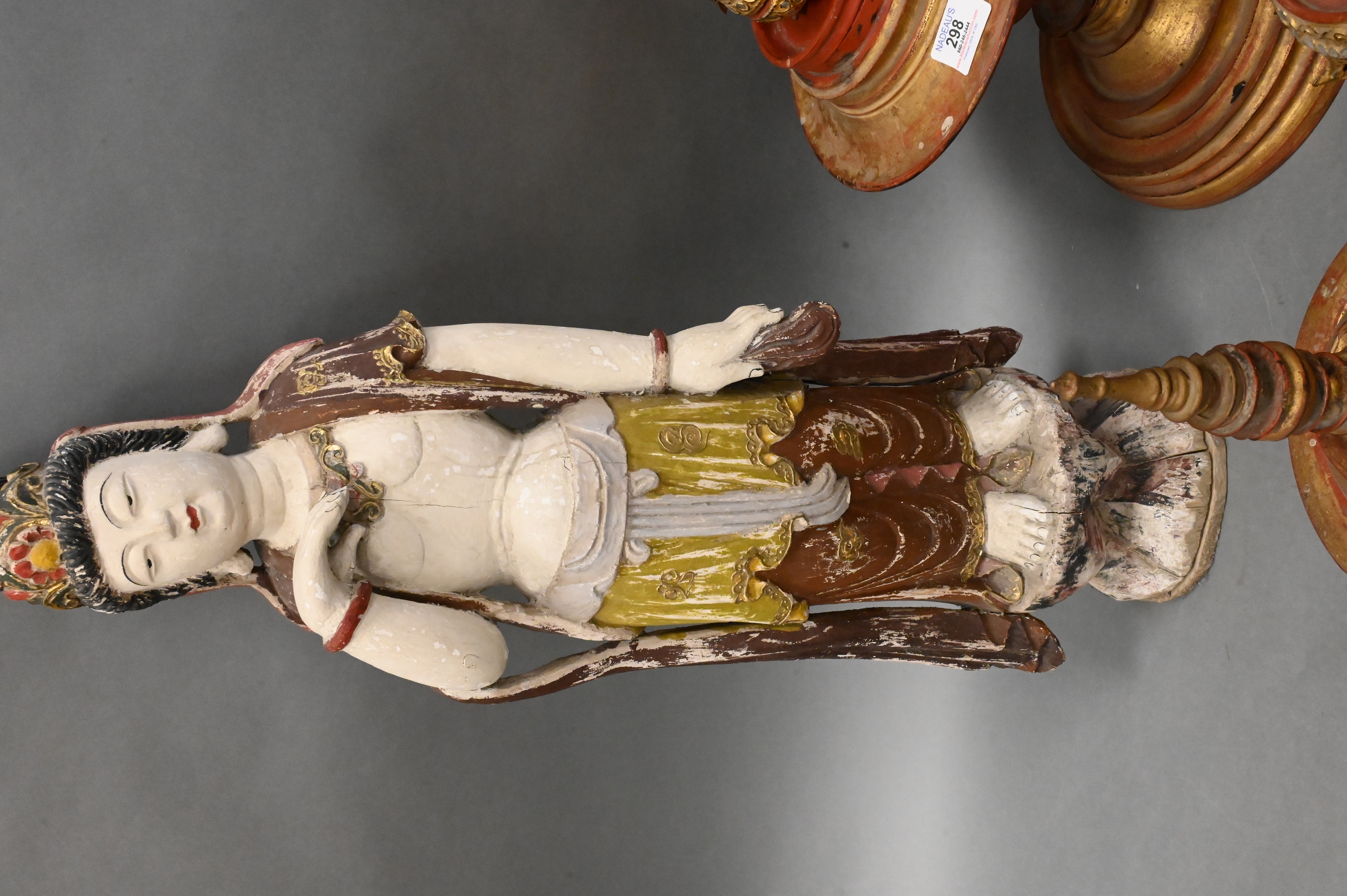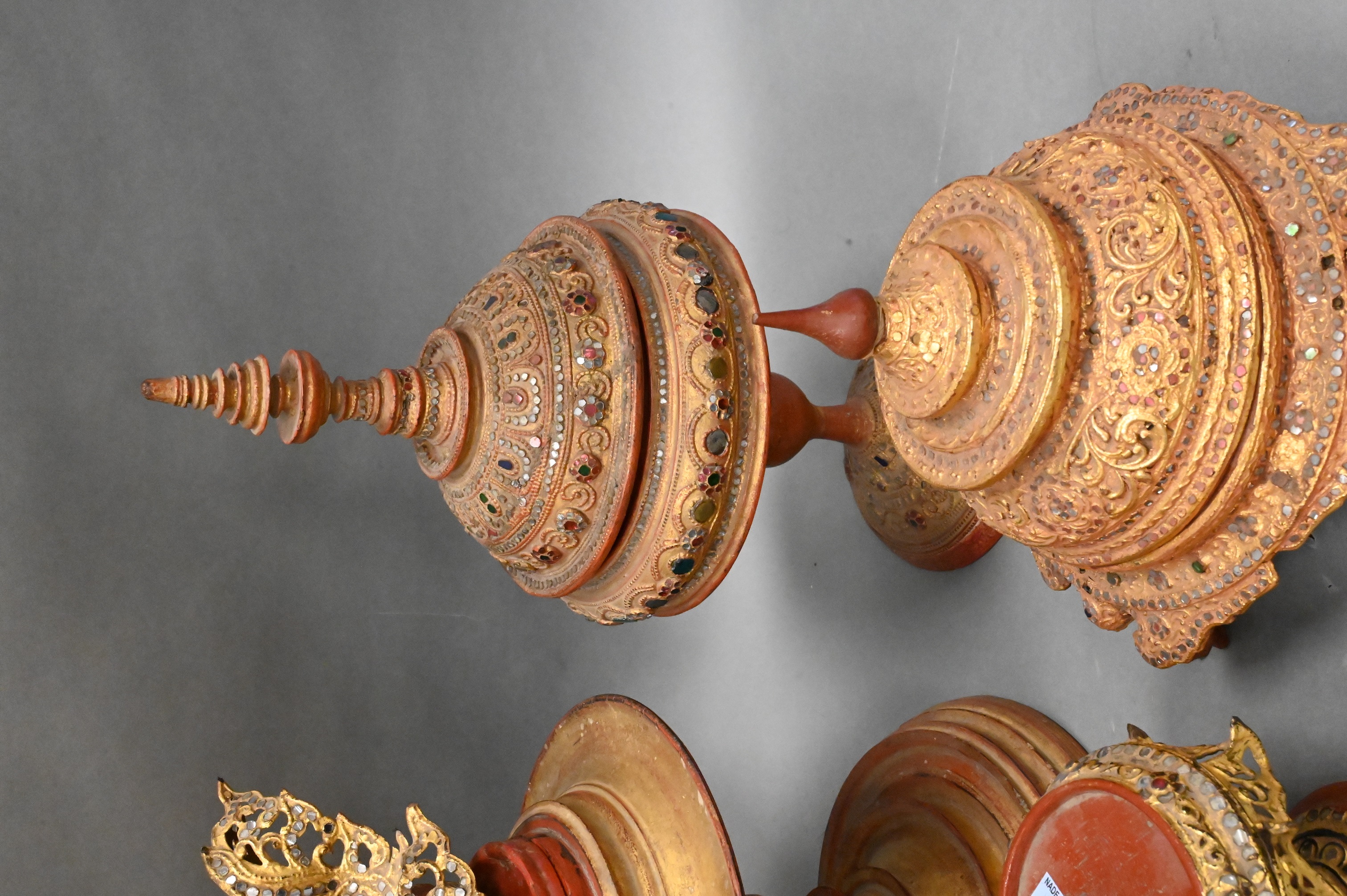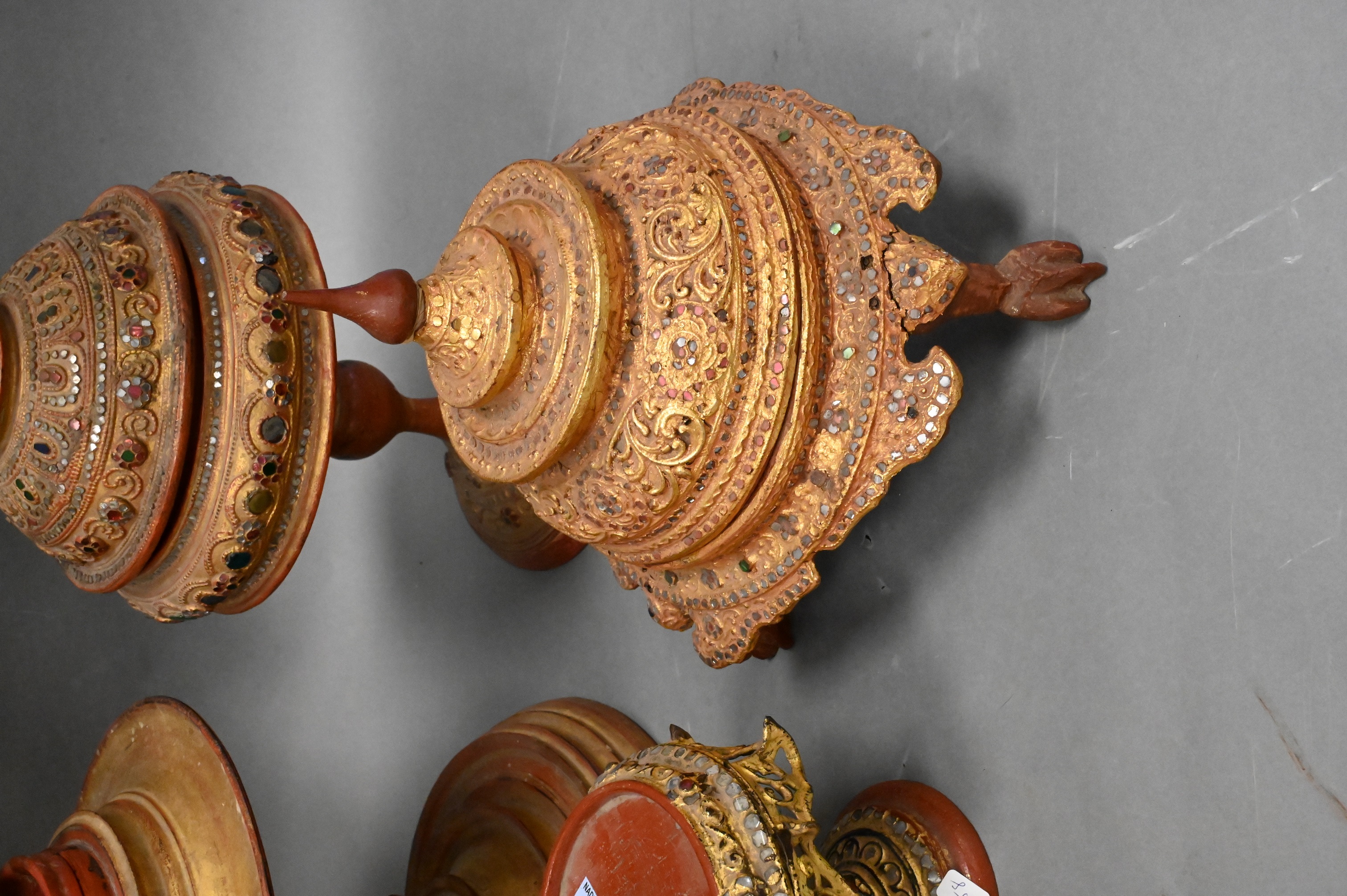 to include a red and gilt lacquered vessel in the shape of a Buddhist Stupa, two gold gilt and bejeweled vessels, one squat on a tripod base, the other onion shaped, a gilt wood and bejeweled Hintha Betel box on stand, along with a carved red and gilt Guanyin having floral crown and open robe to reveal necklace