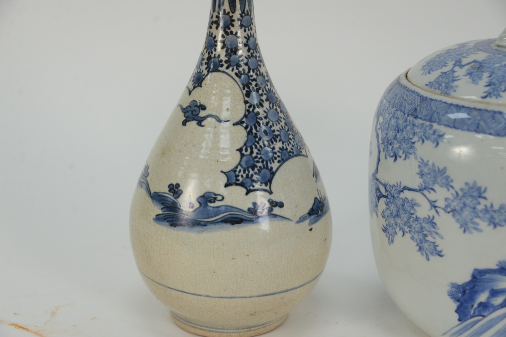Lot 298: Three Japanese Porcelain Blue and White Pieces to include a pear shaped vase with painted landscape, a bottle vase with painted flowers, possibly Edo period, along with a covered jar having foo dog finial on cover, painted with tree and birds, talles
