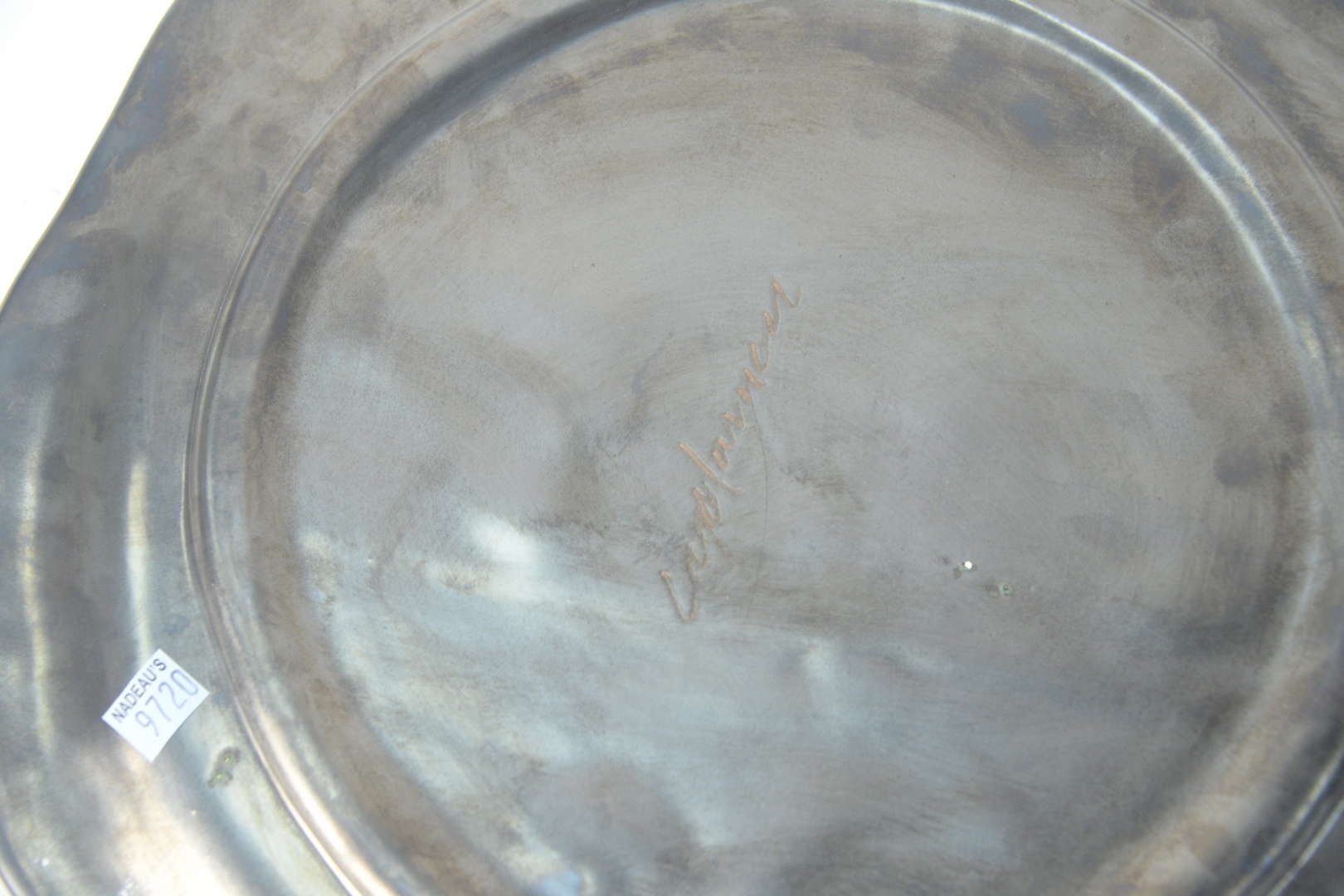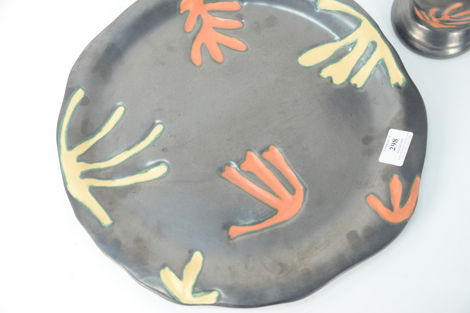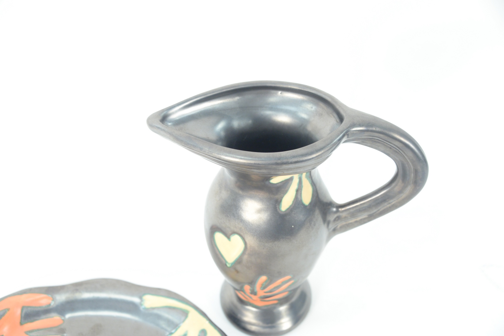 Lot 298: Two Julie Sanders Cyclamen Pottery pieces, to include one pitcher, and one charger, each marked to the underside, pitcher 10 3/4 inches, charger diameter 15 1/2 inches.