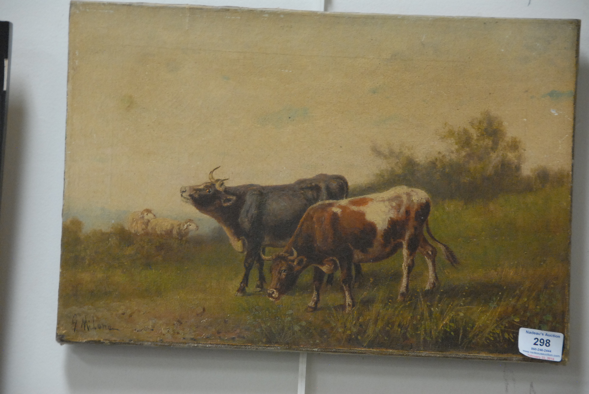 Lot 298: Two piece lot to include Giuseppe Milone 19th Century oil on canvas grazing animals signed lower left G. Milone 12 x 18, restret…