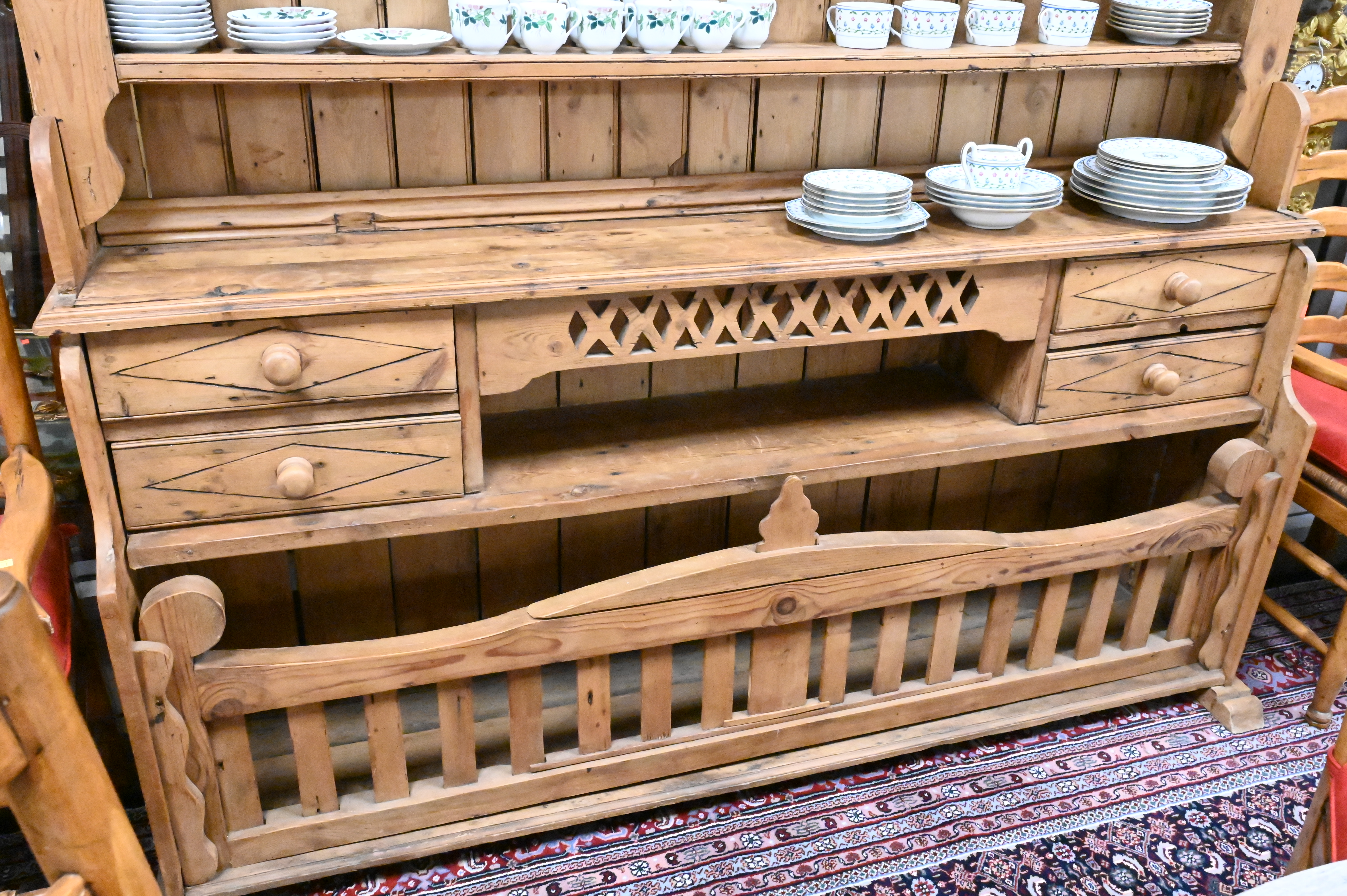 Two Piece Pine Stepback Cupboard/Hutch, having four drawers along with an unusual bottom rail, convenient for storage, height 84 inches, width 74 inches, depth 12 1/4 inches.