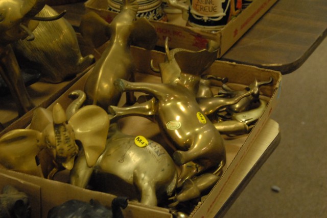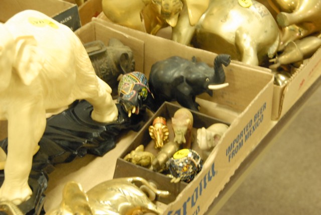 2 box lots of various elephants, mostly brass, one bank and one bronze