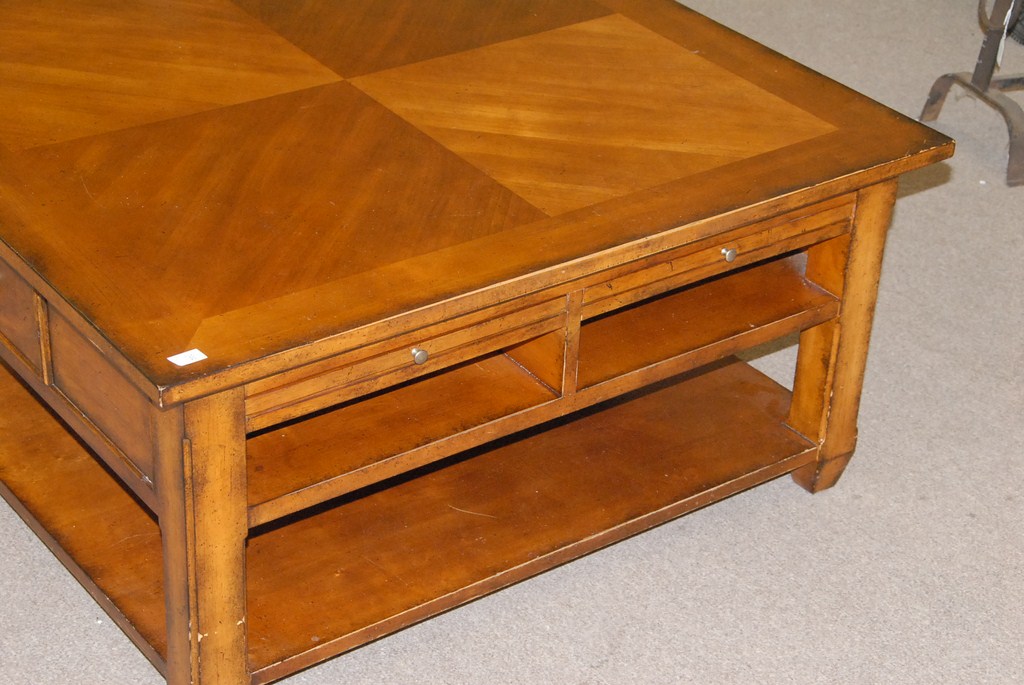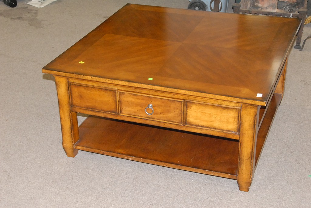 Contemporary square coffee table with drawers and pull out slides.