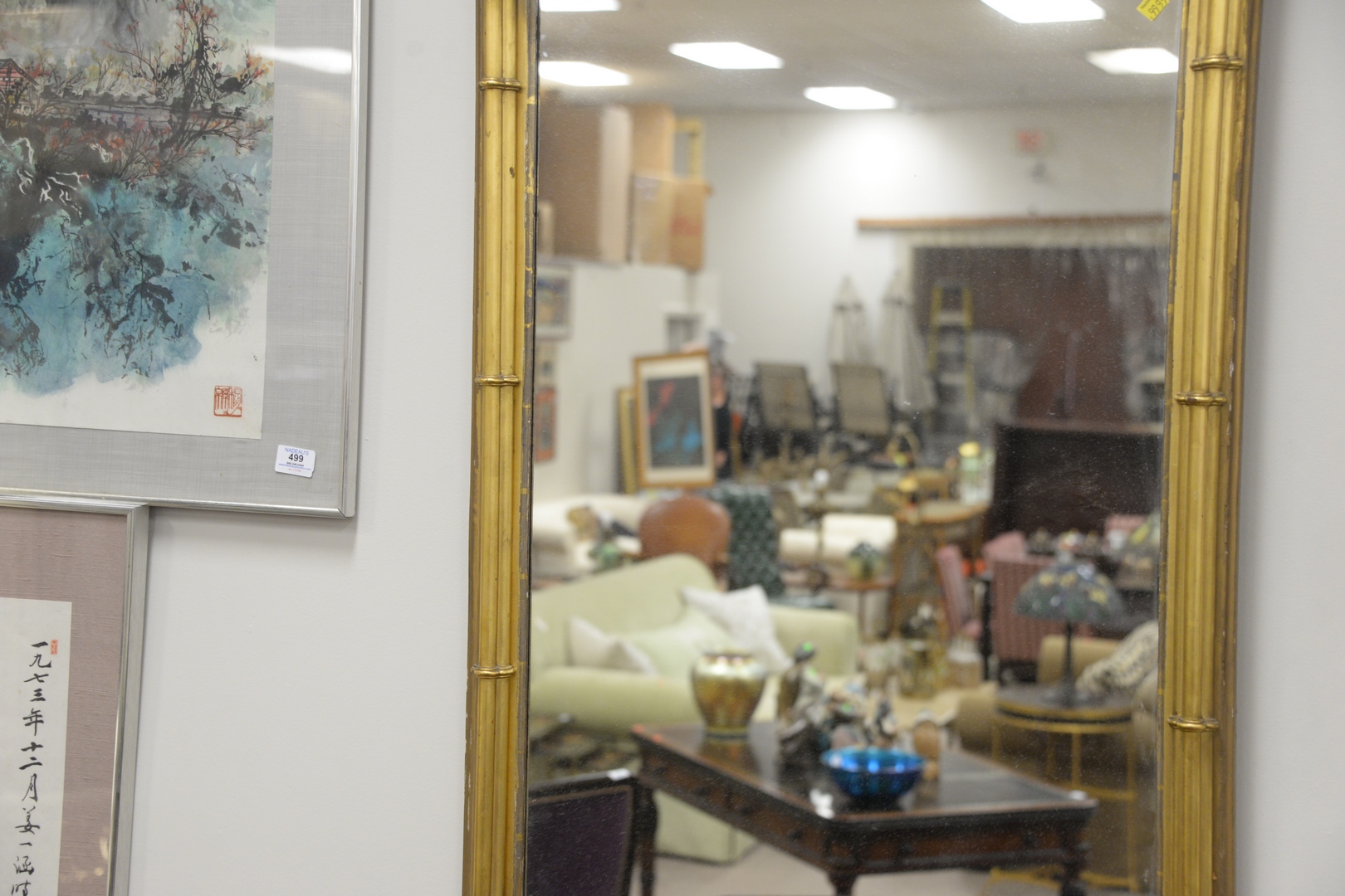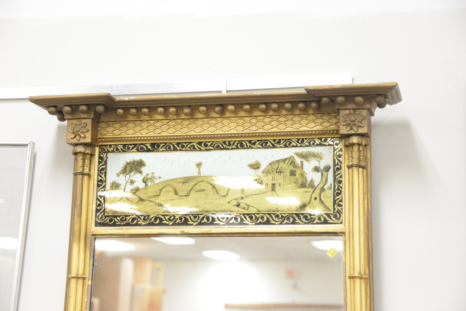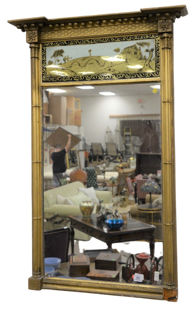 Lot 299: Federal Mirror, having eglomised panel over rectangular mirror having gilt frame, height 49 inches, width 27 inches.