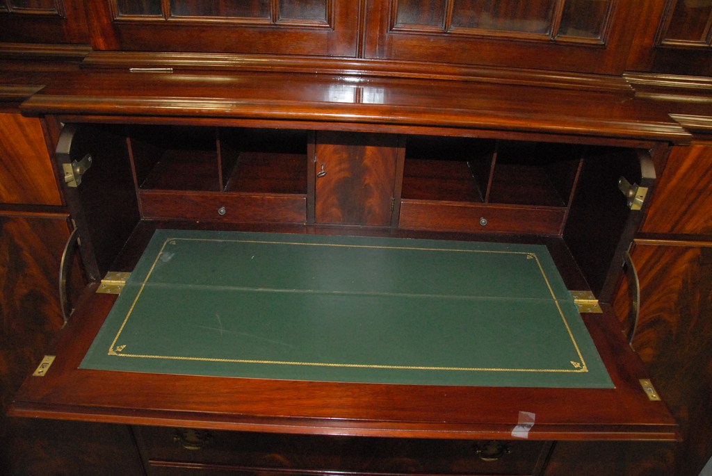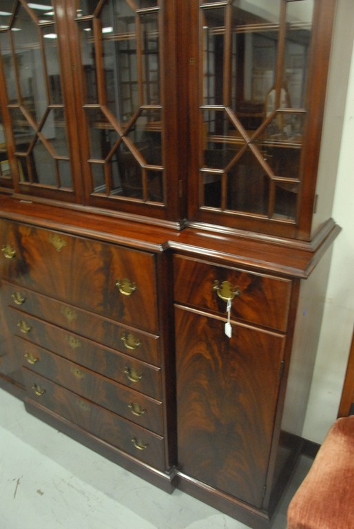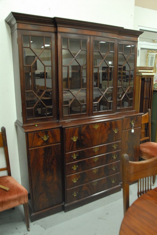Lot 299: Fineberg mahogany breakfront in two parts, upper section with four glazed doors on lower section with center pull down writing surfa…