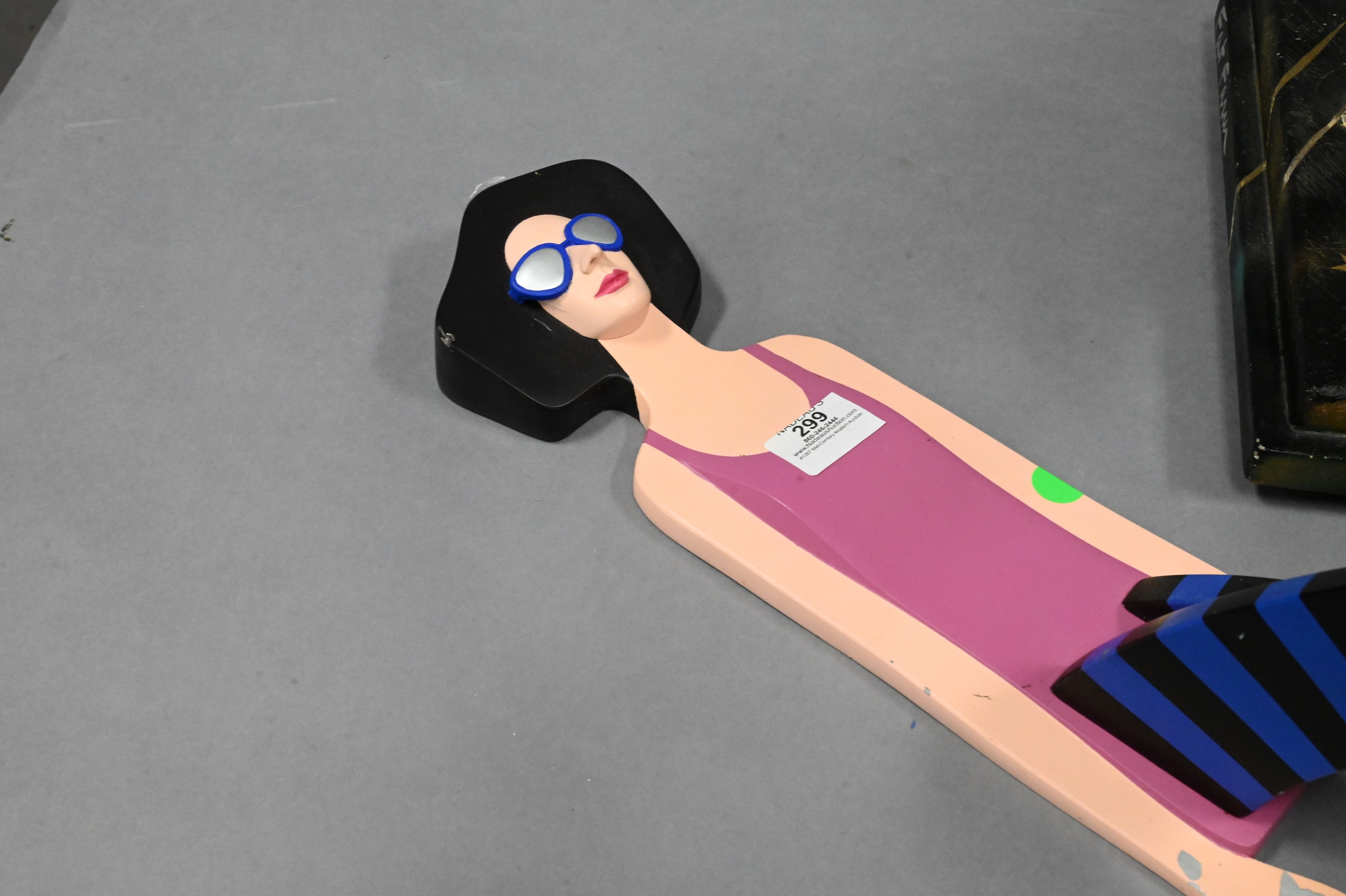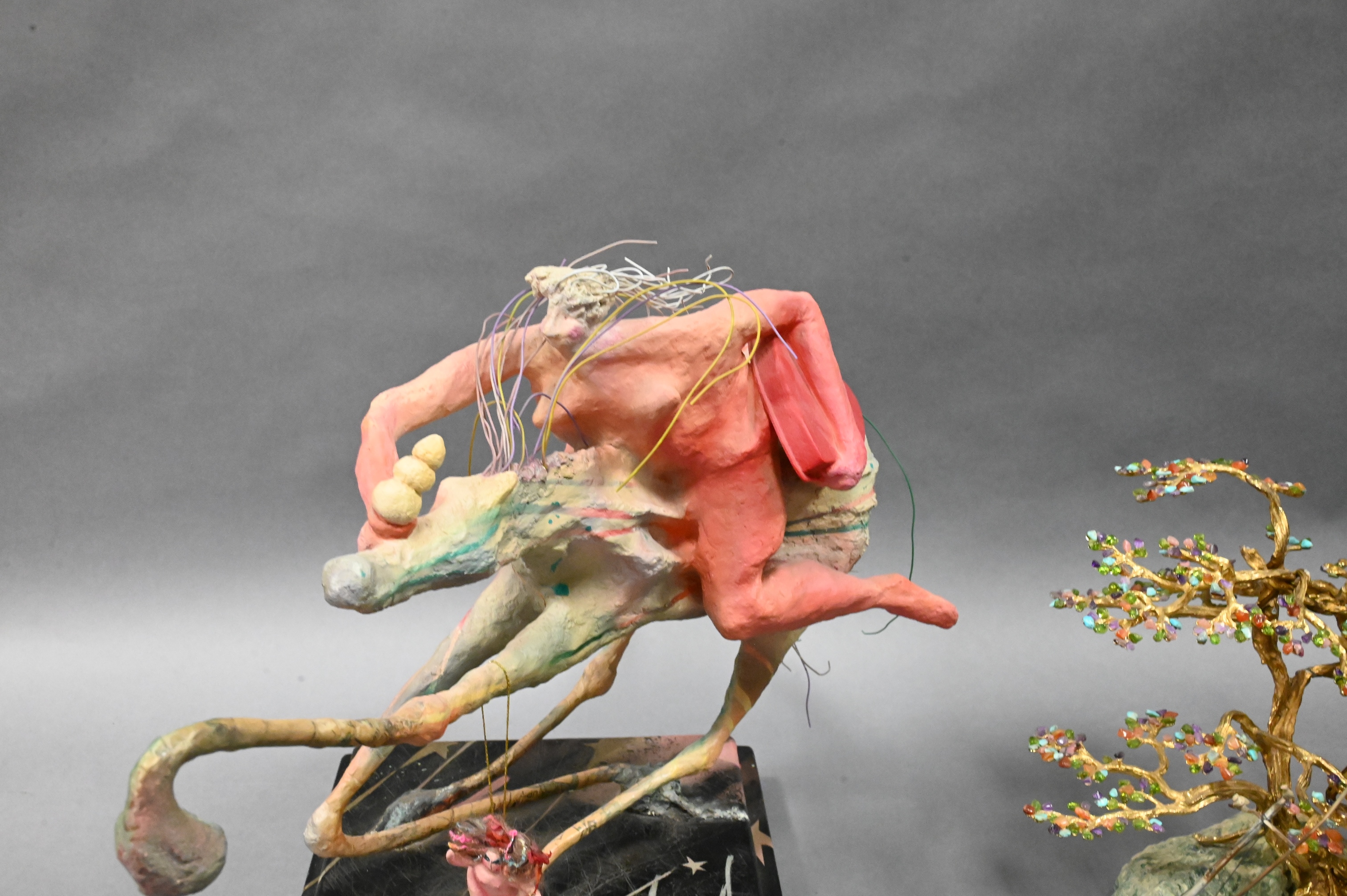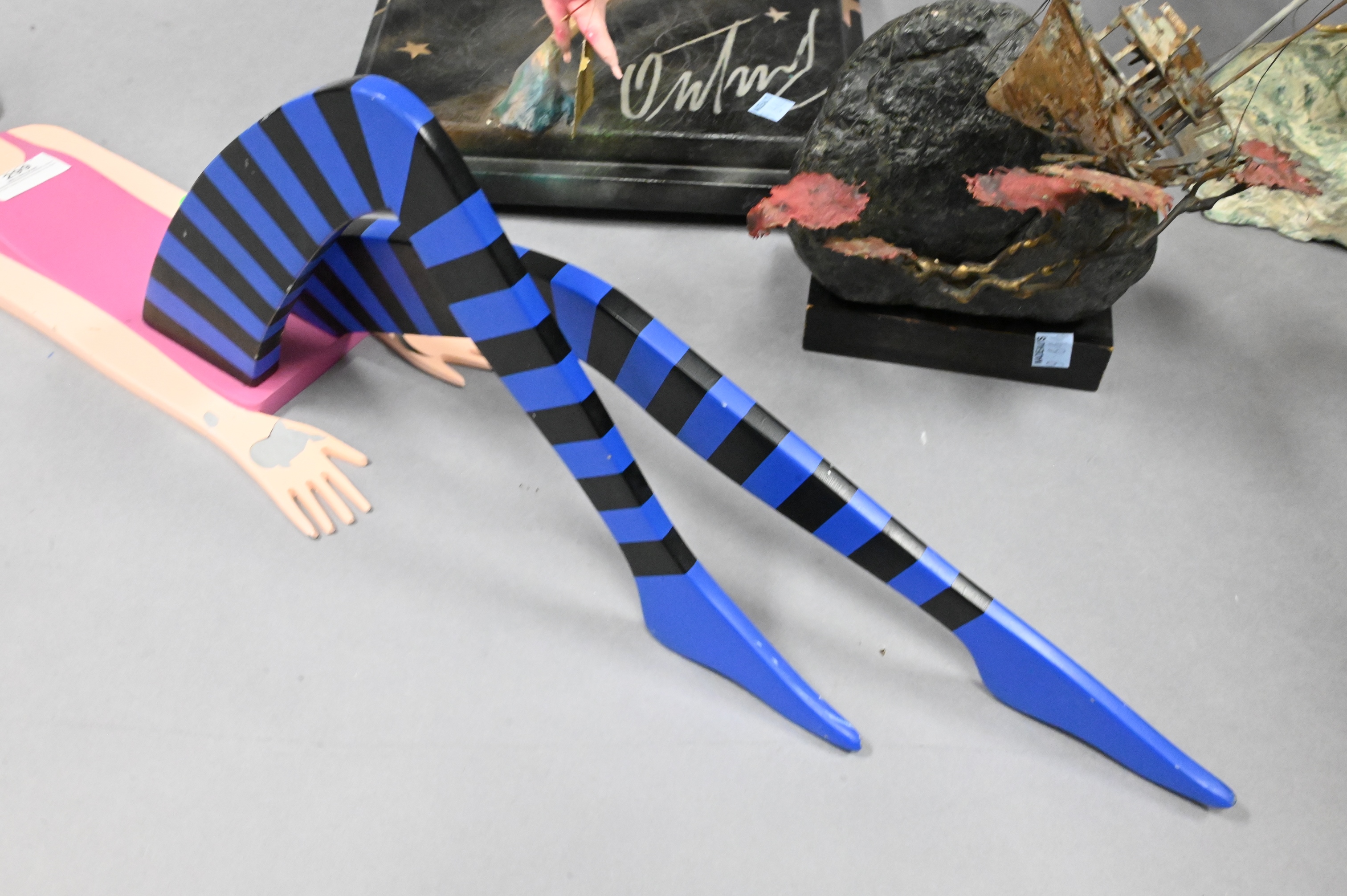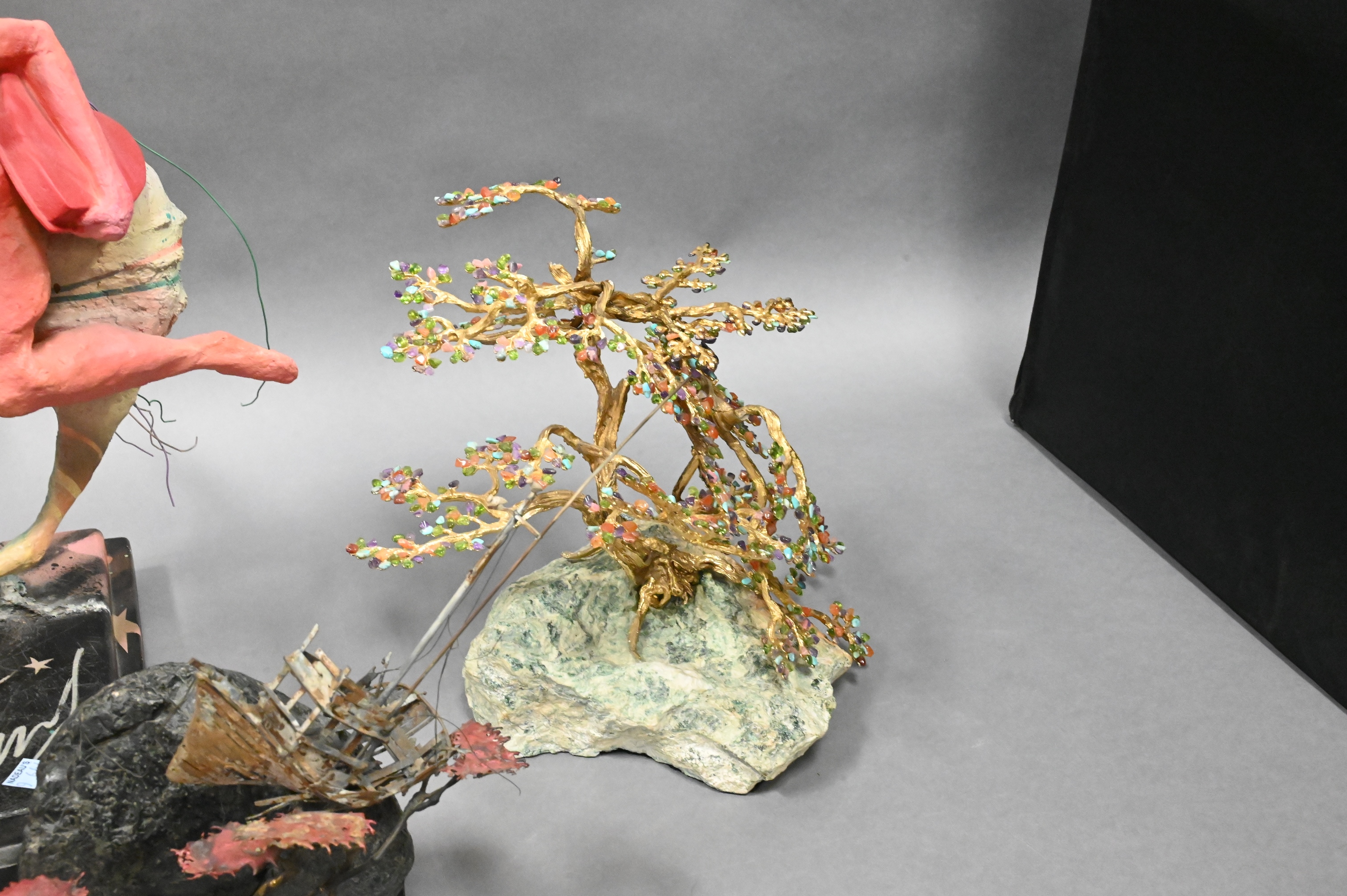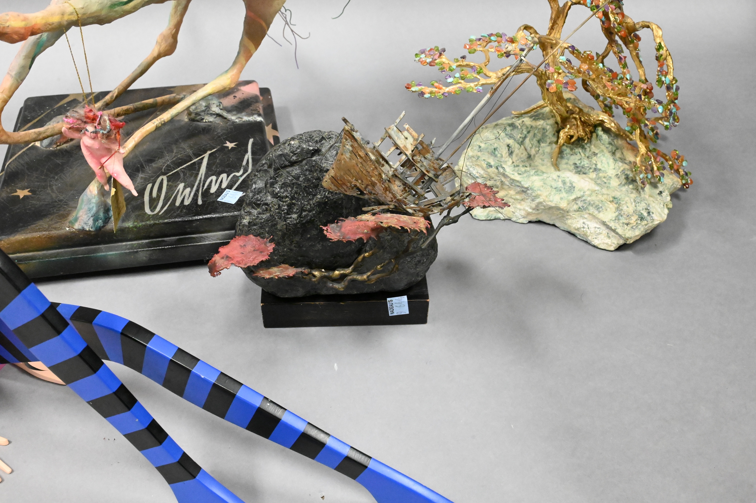 to include “Fat Chick” ceramic / papier mache rotating figure of a pink woman on a horse dated 1987, Donald Purdy rock and metal ship sculpture signed and dated on underside D. Purdy ’70, Edward Swoboda style gem bonsai tree on rock base, along with James W. Eaten “Bather” painted metal signed J.W. Eaton ’91 #64