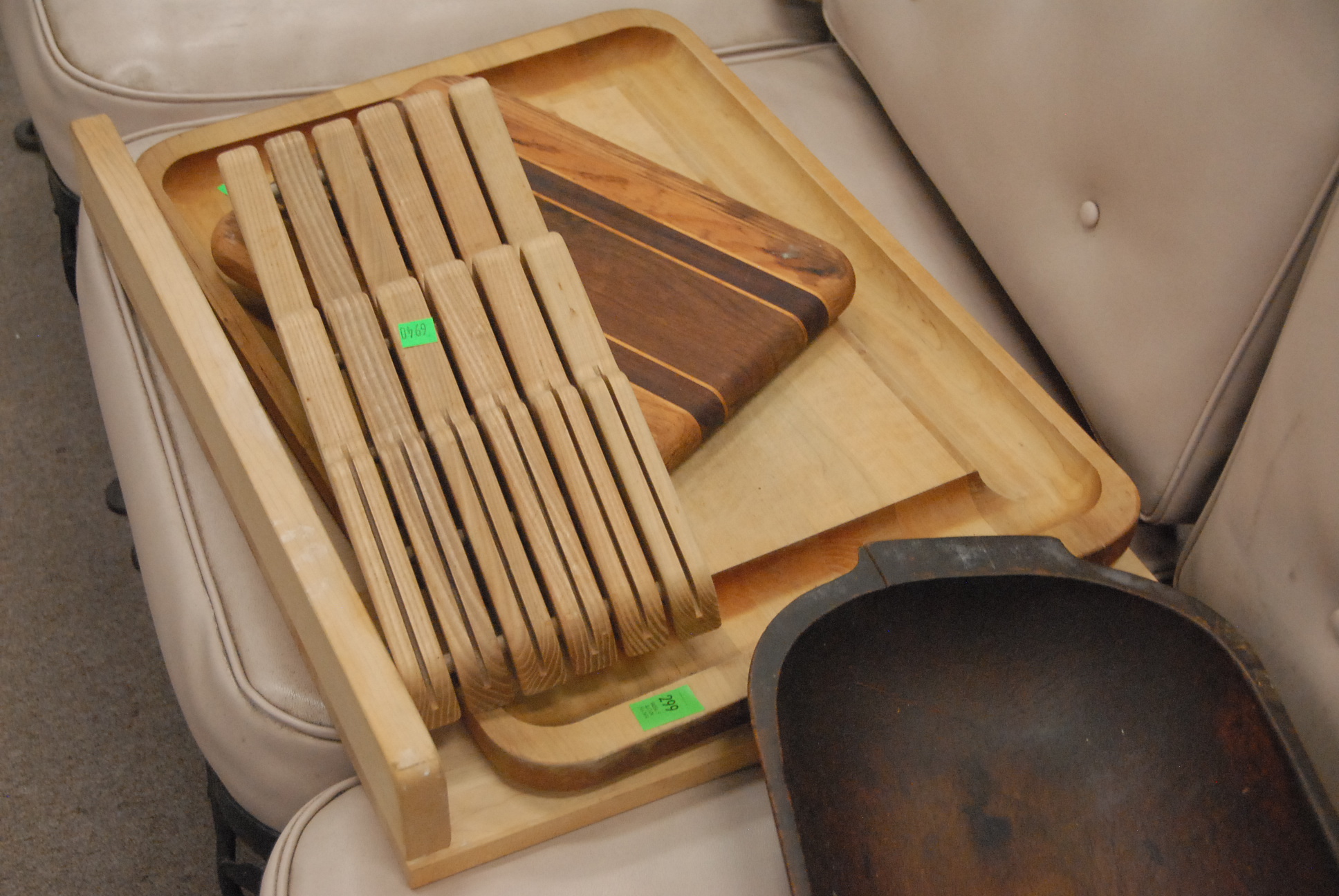 Group of wooden items to include knife rack, cutting boards, and bowl.