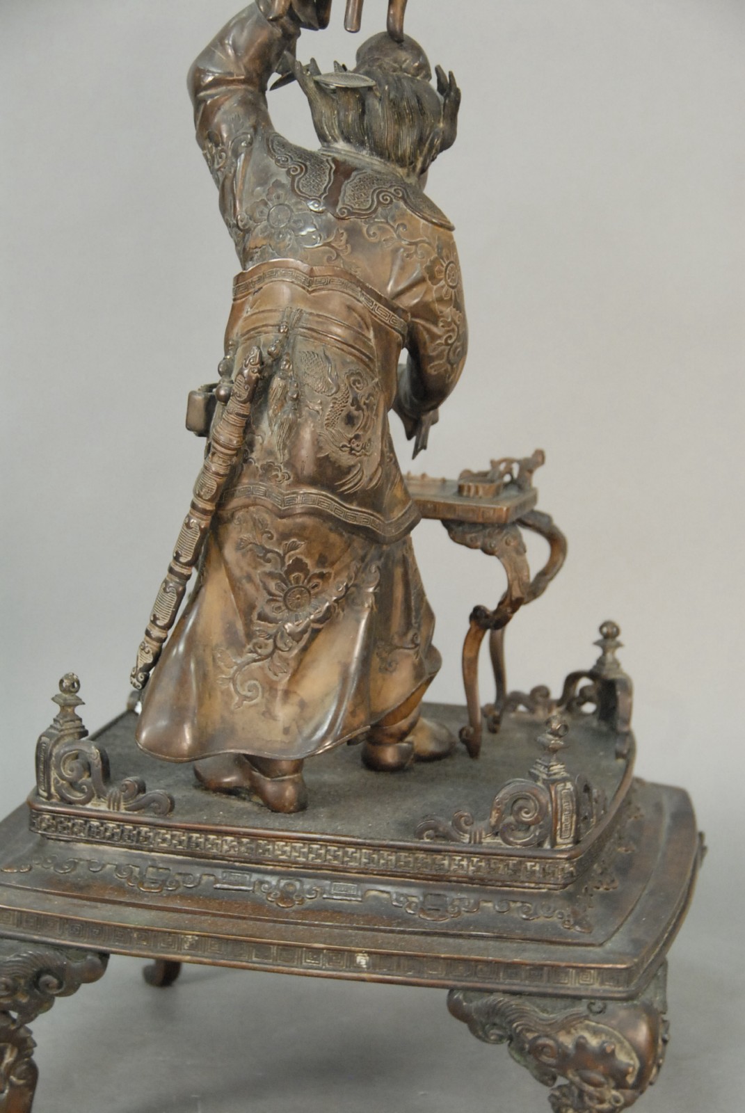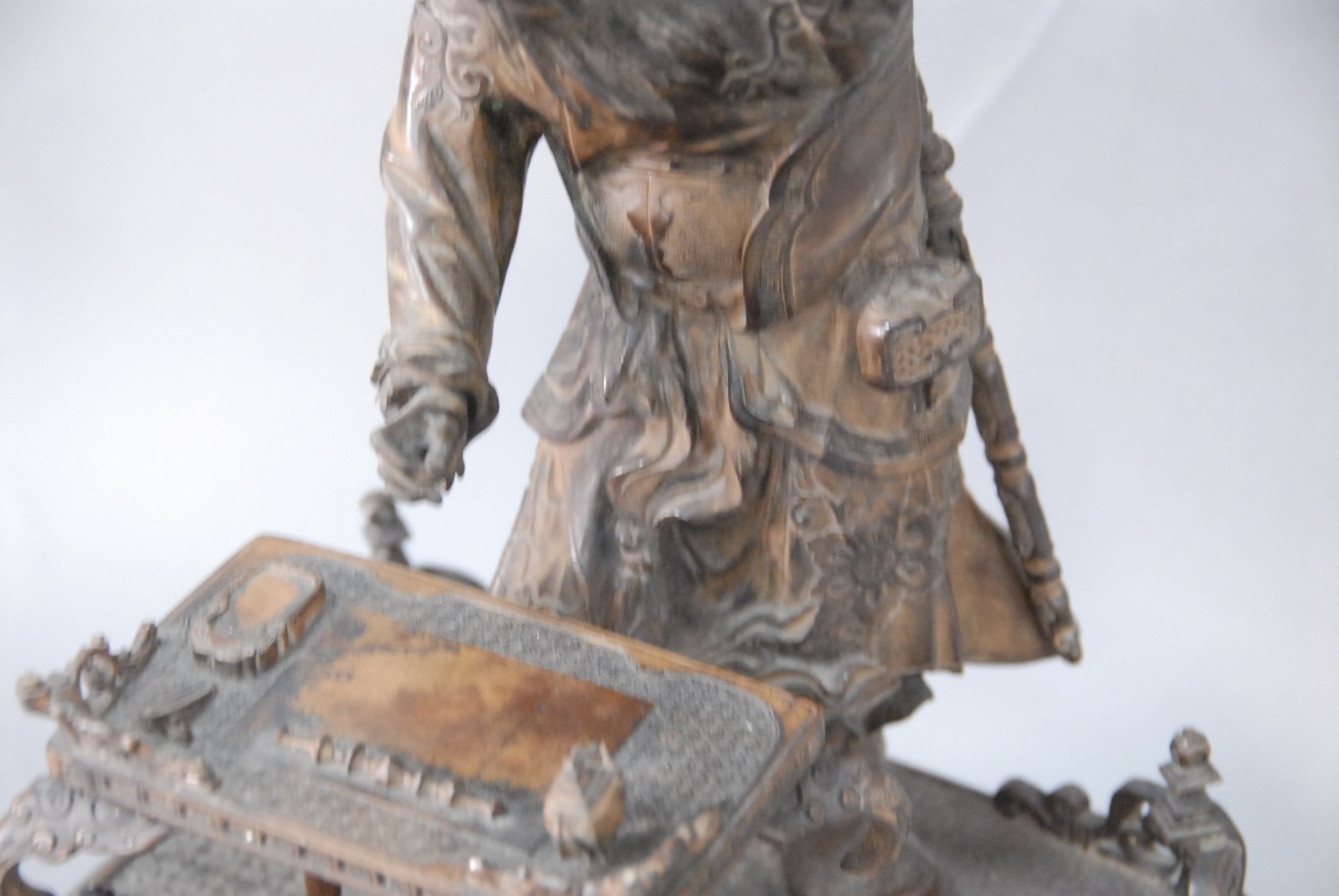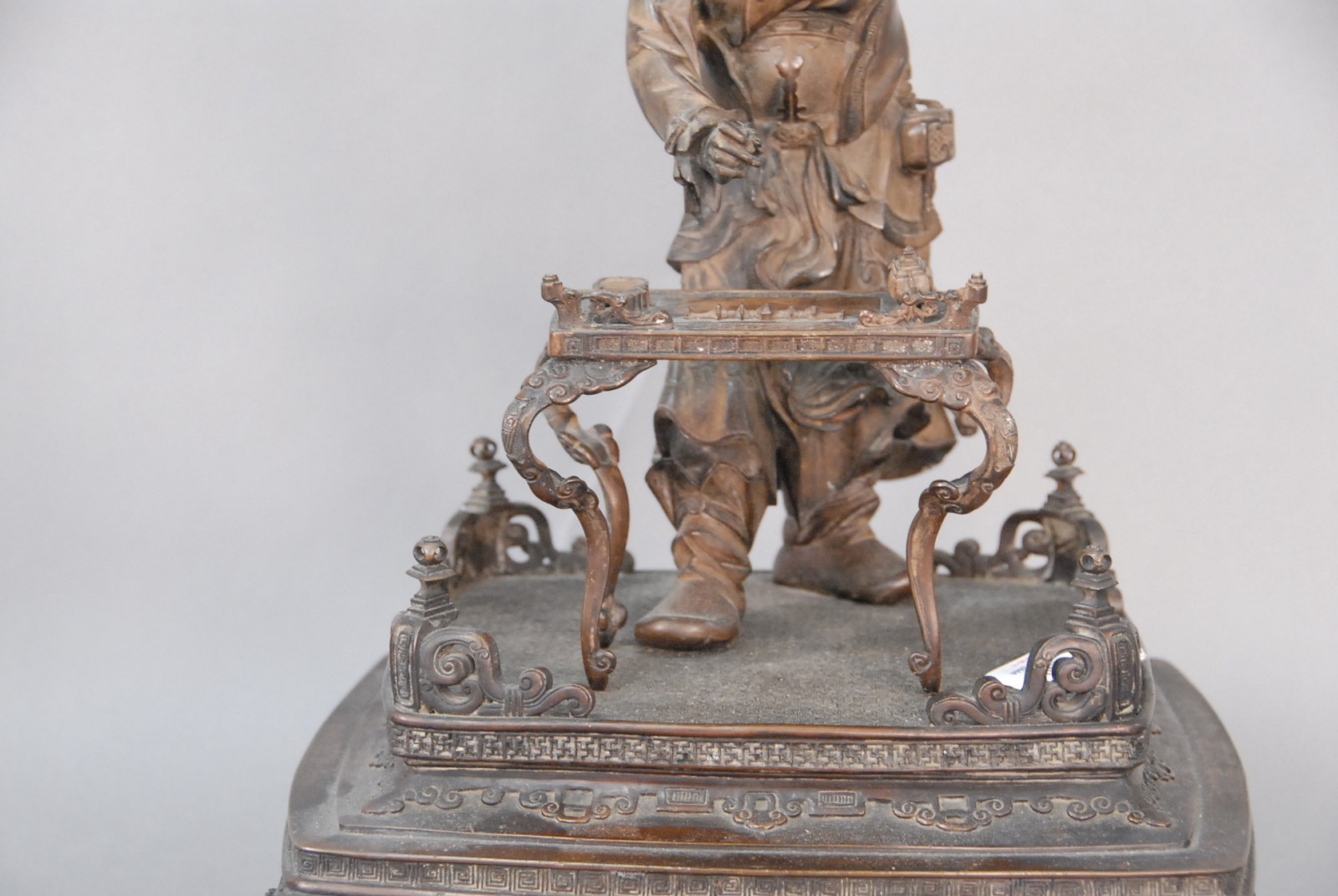 Large fine Japanese bronze figure of man holding an archaic censer ding over his head and standing before a writing table upon which are a brush, ink stone, and rest, table detached, one leg missing, one handle missing on censer and stylus/brush missing, 19th century – 20th century.