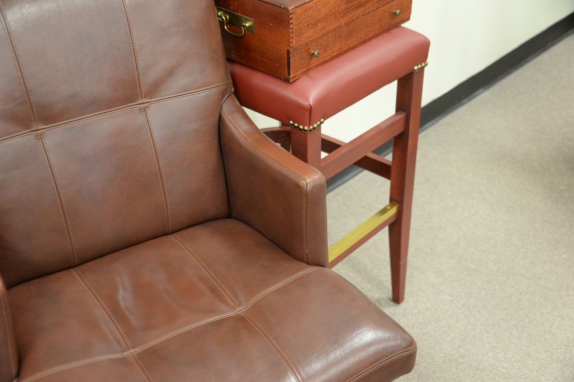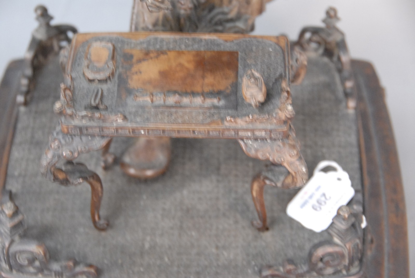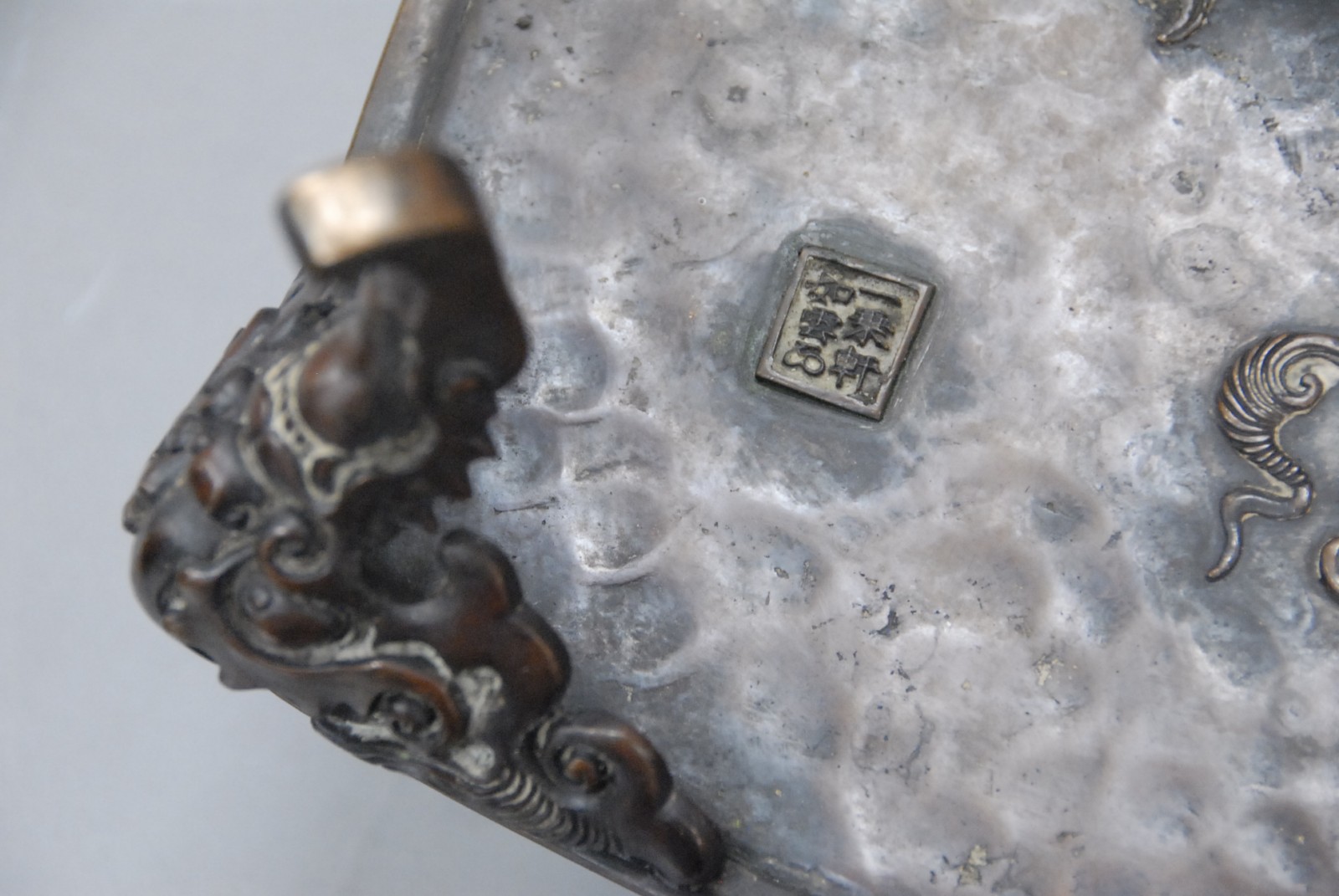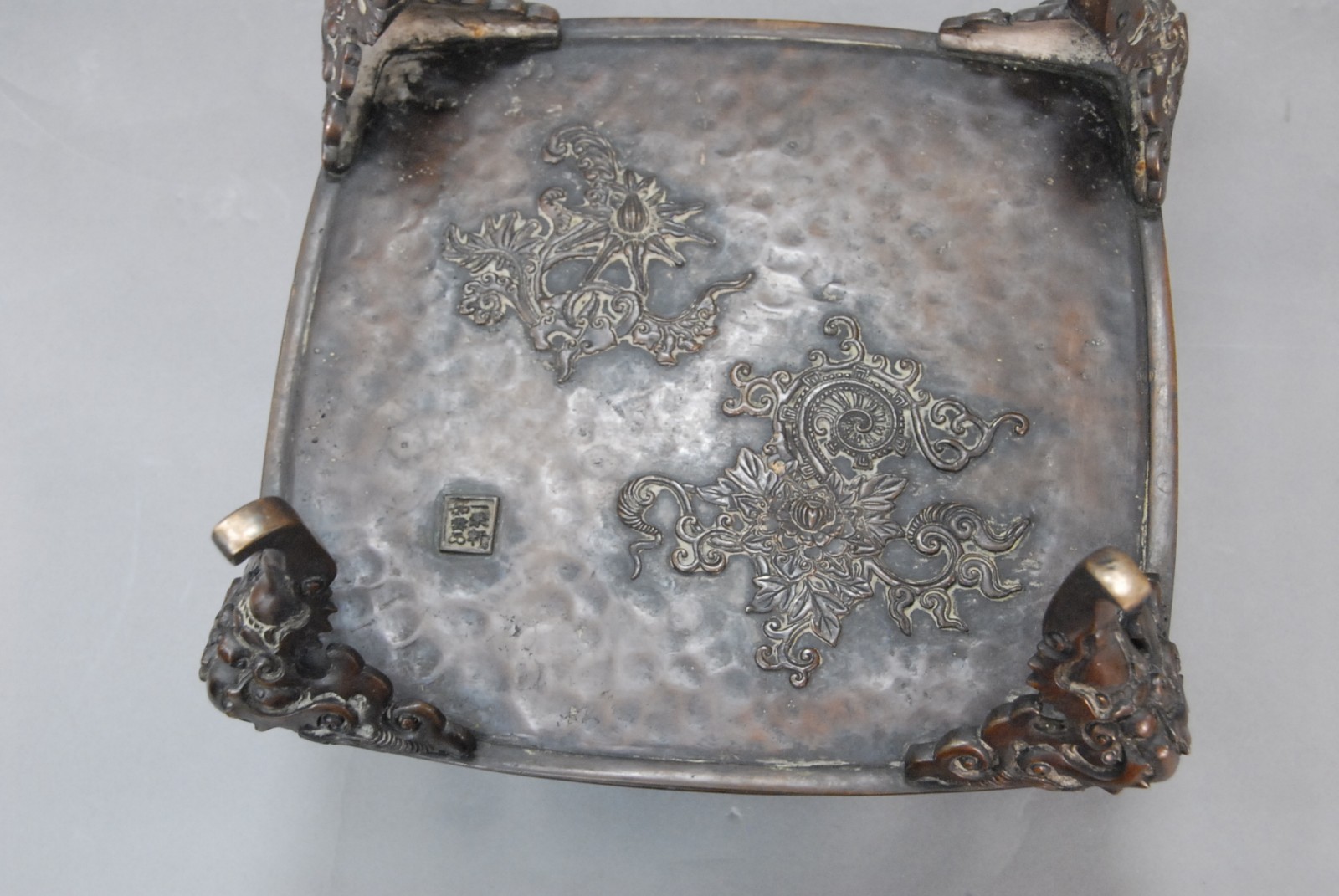 Large fine Japanese bronze figure of man holding an archaic censer ding over his head and standing before a writing table upon which are a brush, ink stone, and rest, table detached, one leg missing, one handle missing on censer and stylus/brush missing, 19th century – 20th century.