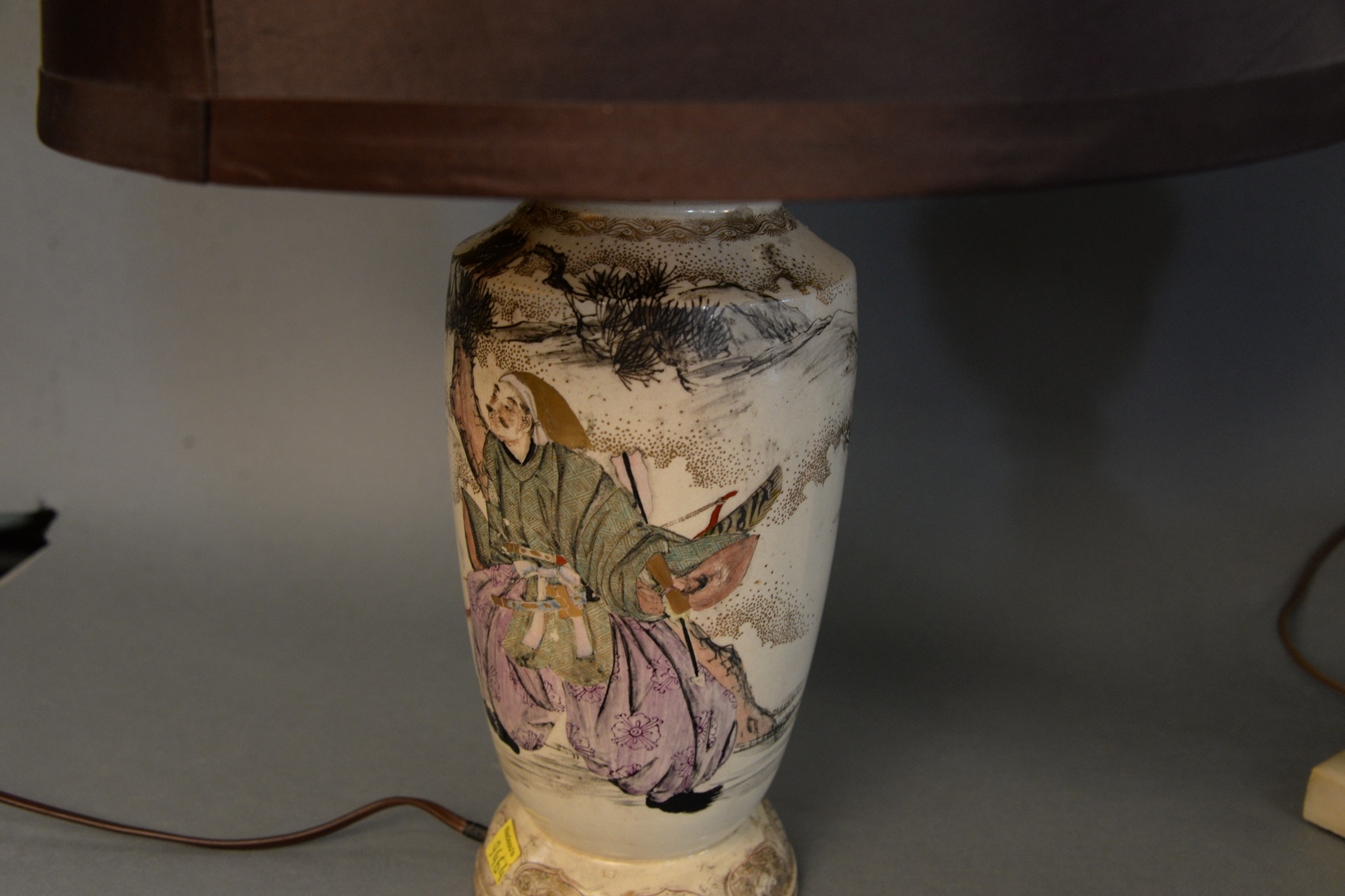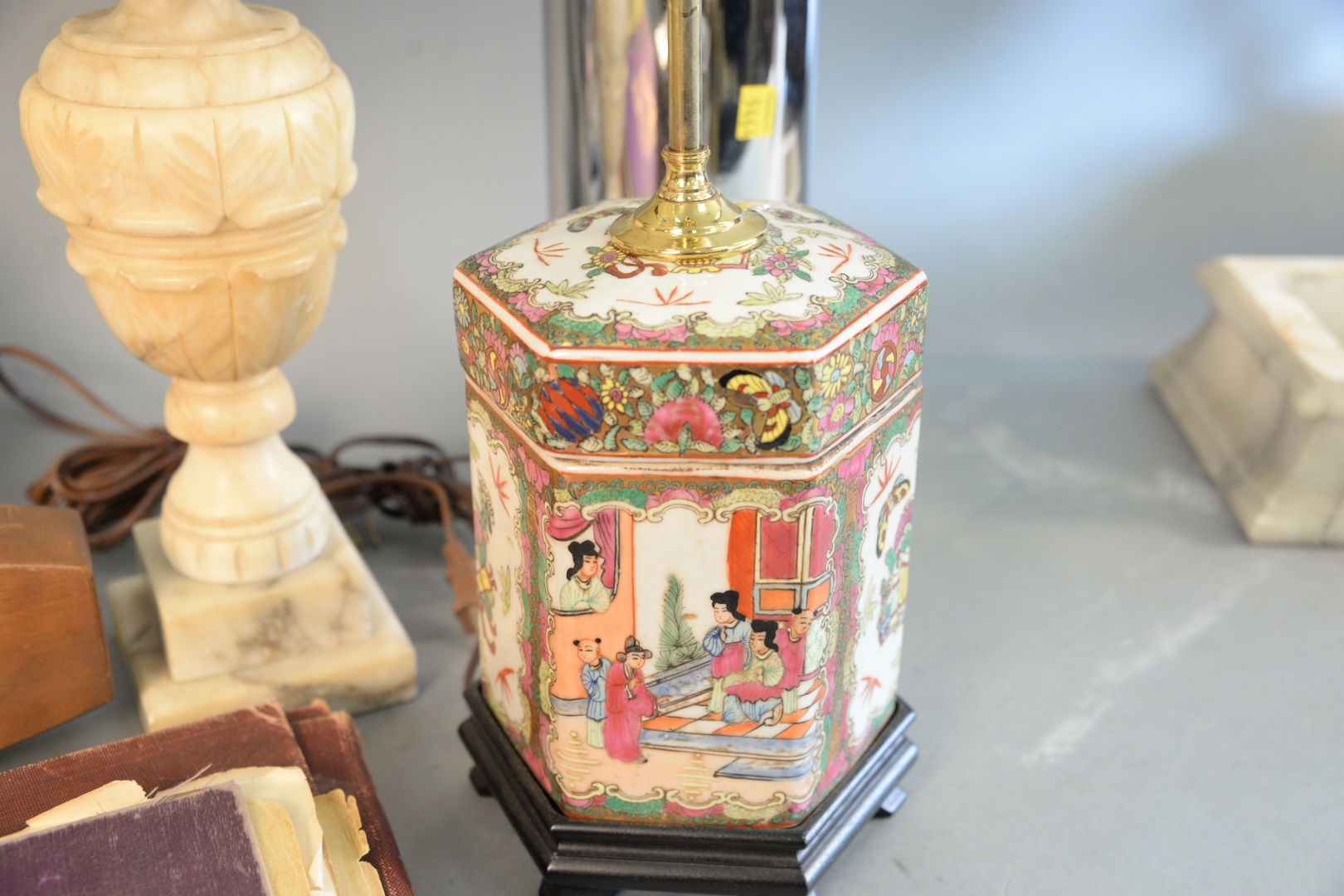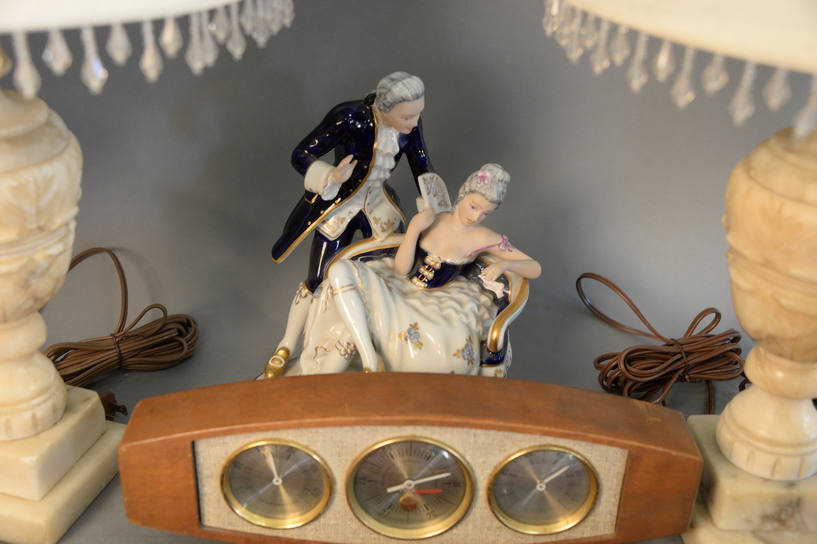 Lot 299: Large group of assorted items to include chrome tubular lamp; Japanese satsuma; pair of marble lamps; Royal Dux double figure; Airguide clock; small porcelain lamp; Album Der Casseler Galerie book; crowned masterpieces of paint in section and The Ideal Collection portfolio.