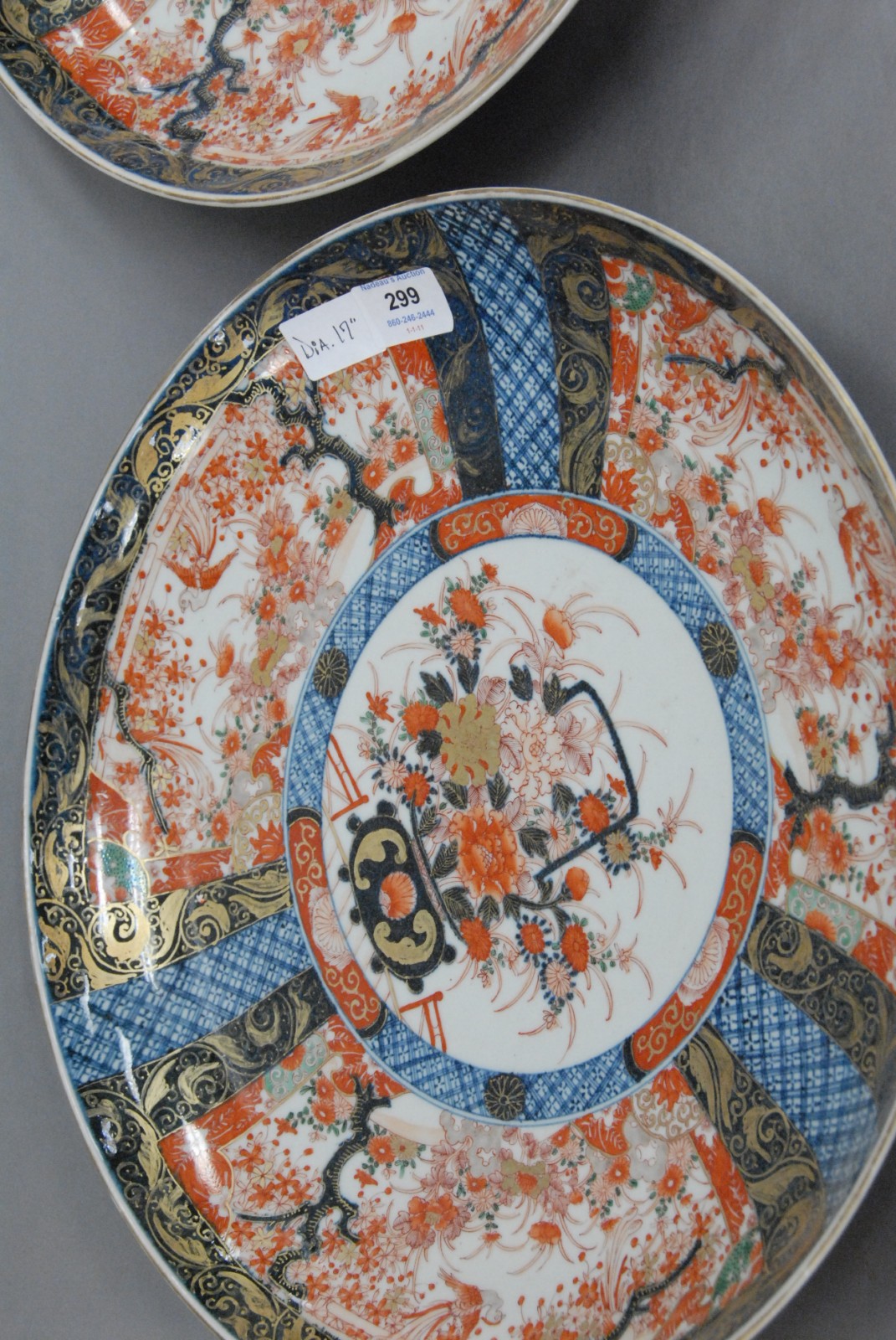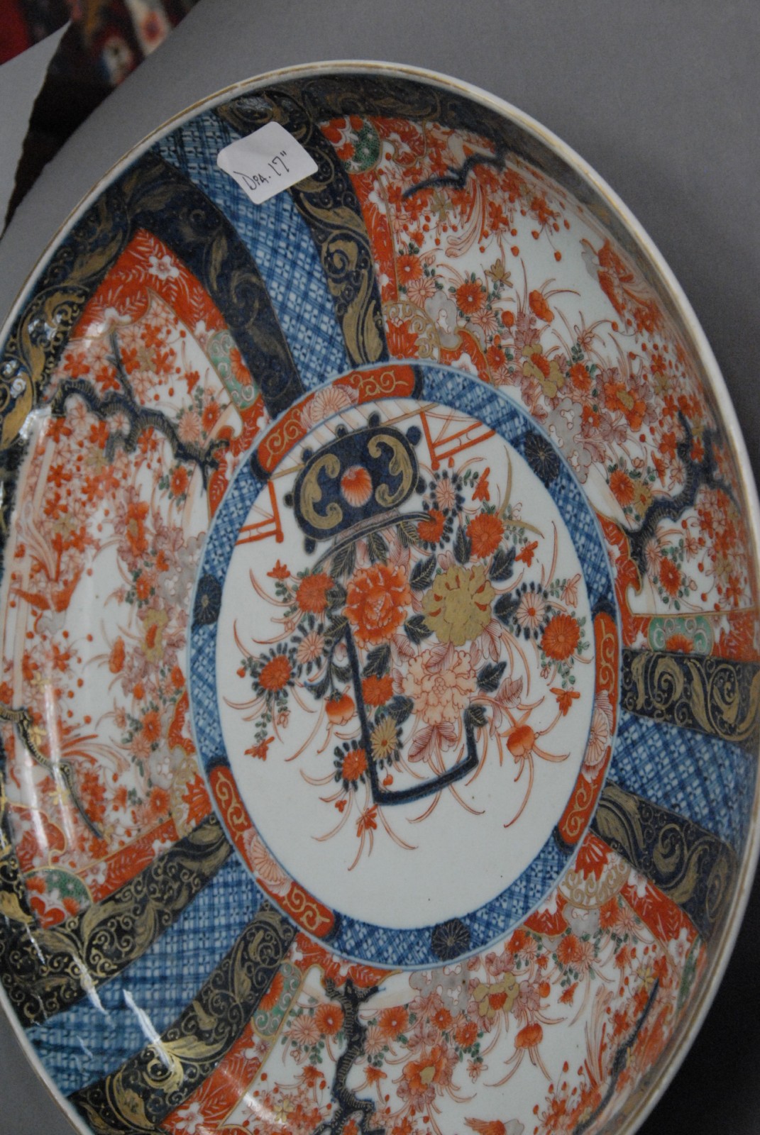 Large pair of Japanese Imari chargers, Meiji/Taisho period, with central floral basket and gilt early 20th century.
