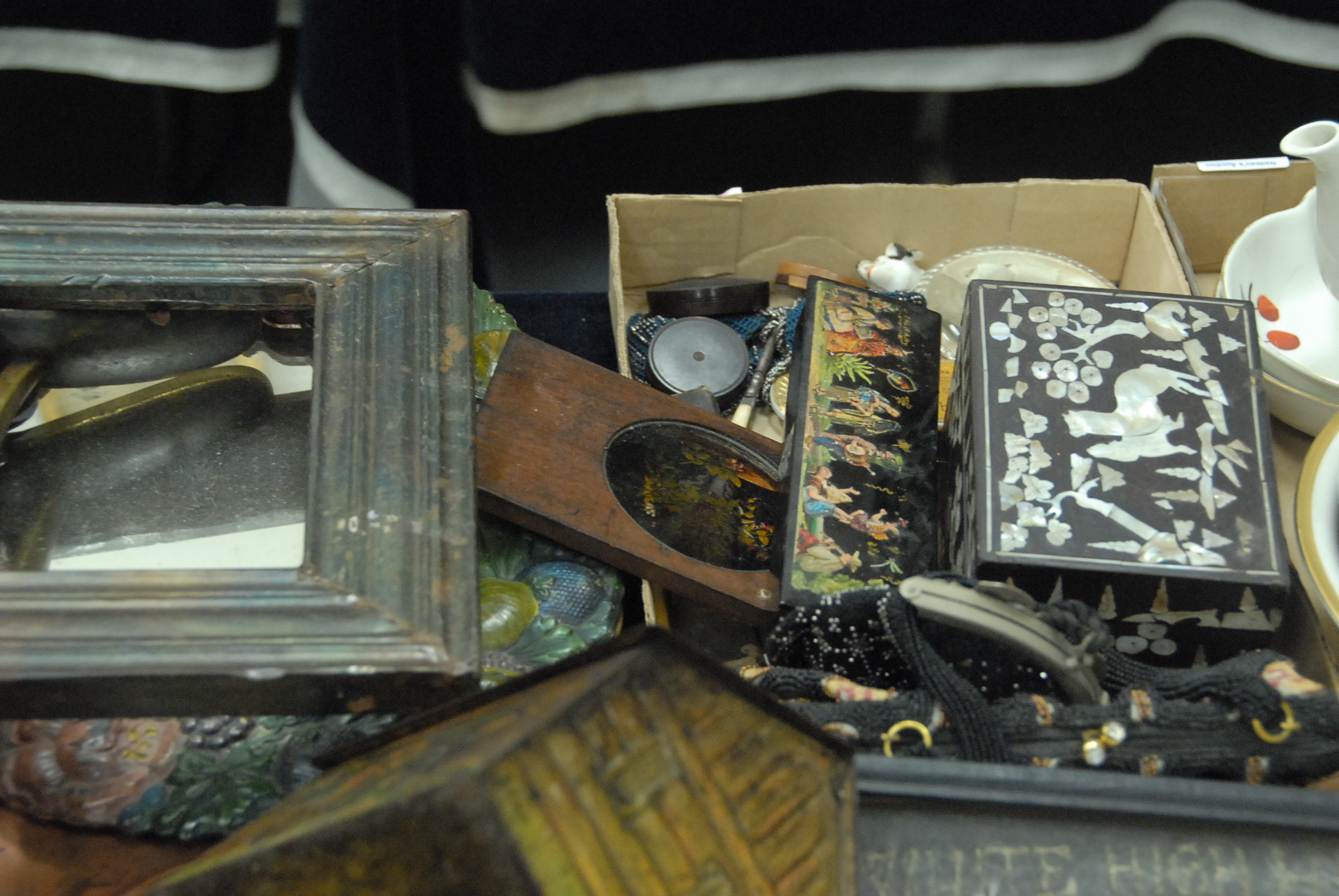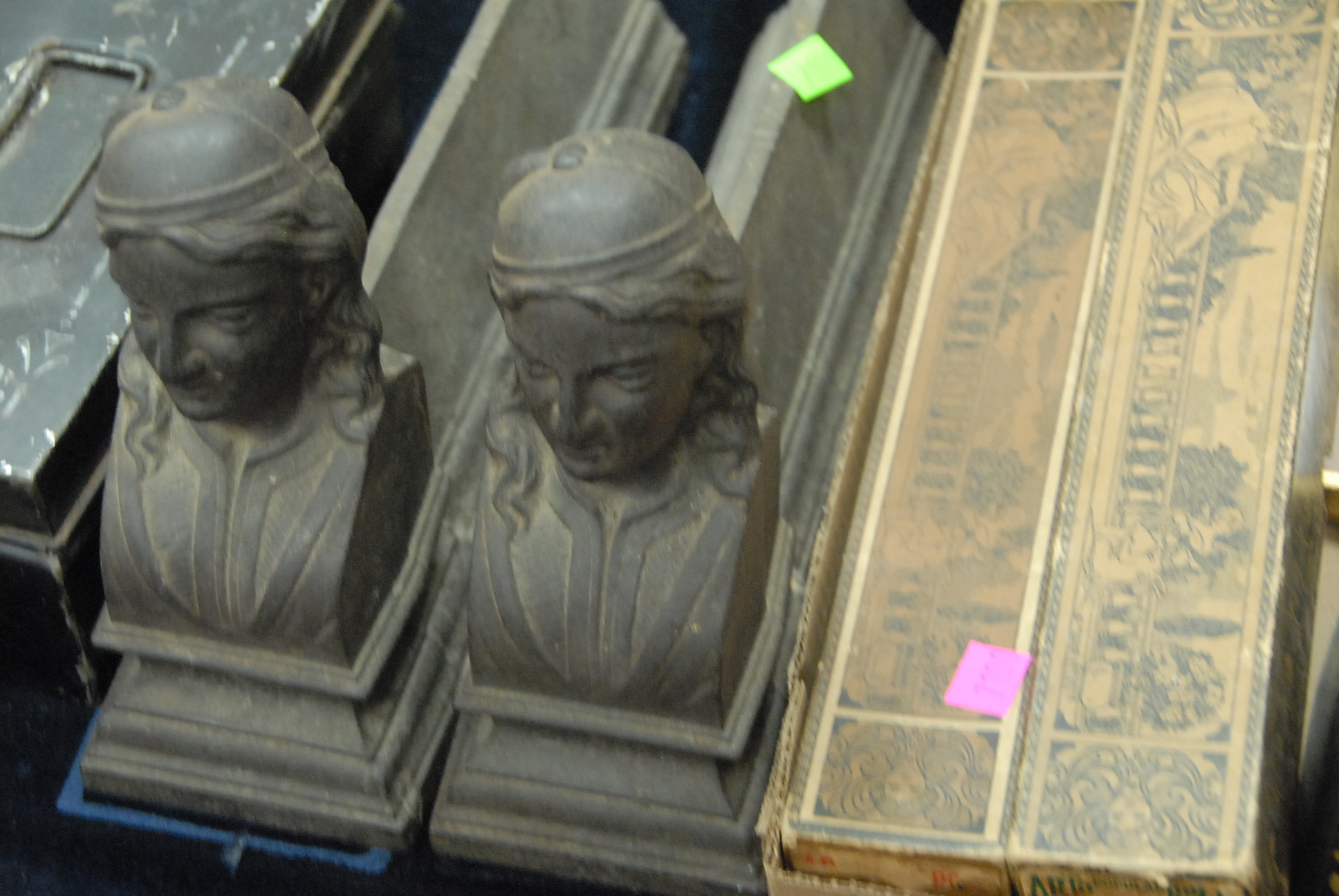 Lot to include three box lots of figural fire dogs, metal framed mirror, brass tray, tin spice box, etc.