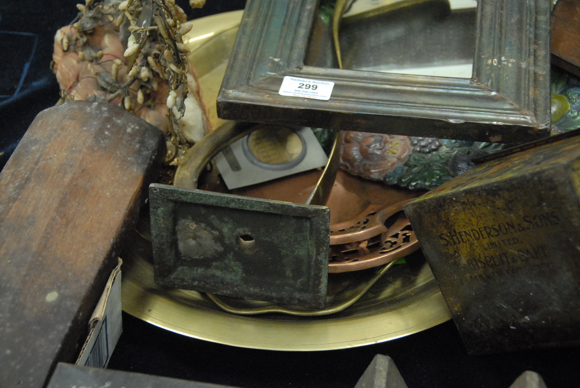 Lot 299: Lot to include three box lots of figural fire dogs, metal framed mirror, brass tray, tin spice box, etc.