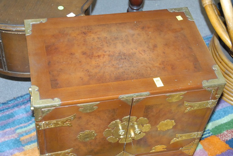 Oriental style two door chest with a drawer and brass mounts, ht. 23.