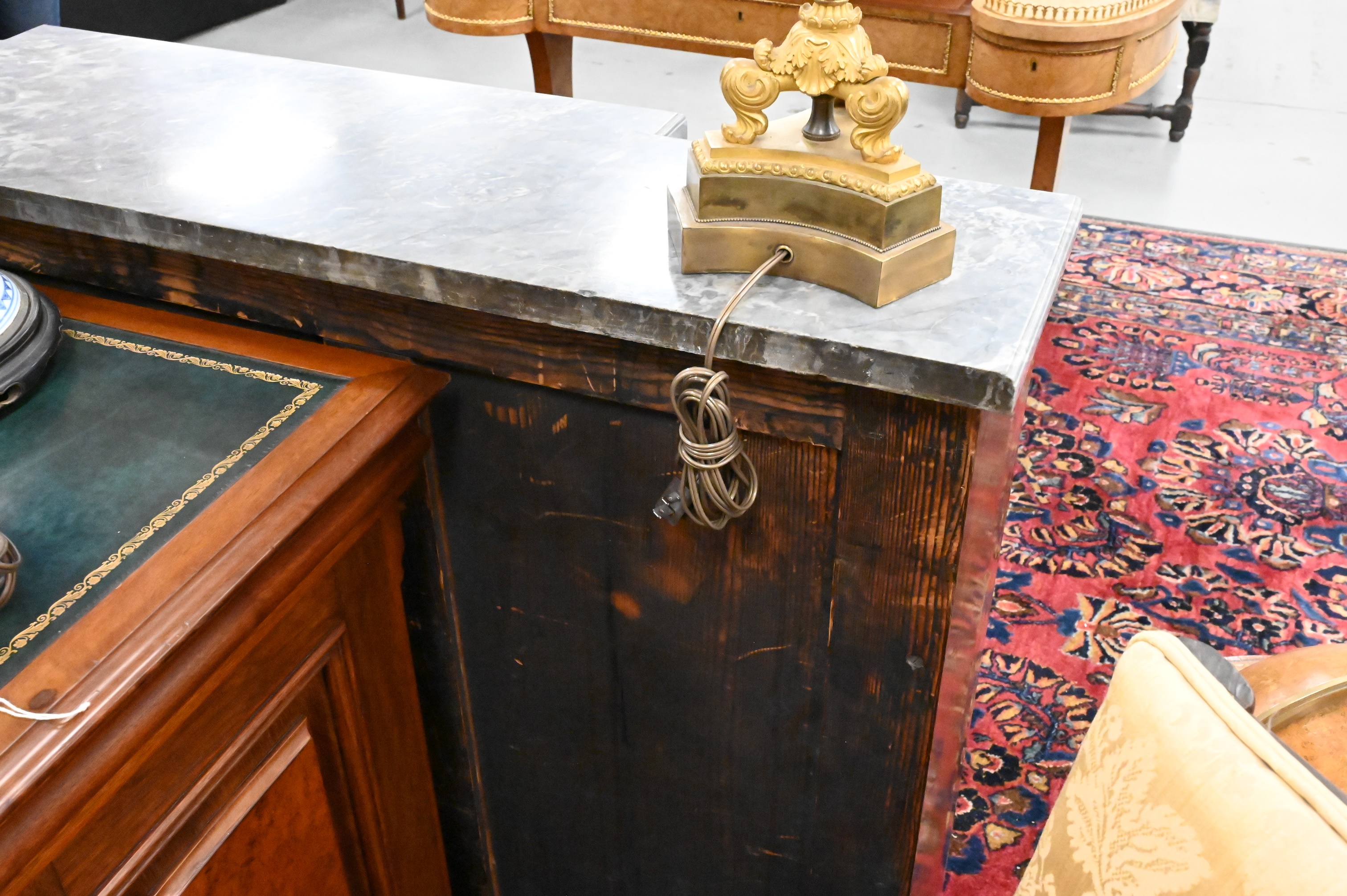 having shaped grey marble top with central grillwork door flanked by completely adjustable shelf interior and adjustable gilt metal mounts on front surfaces, early 19th century