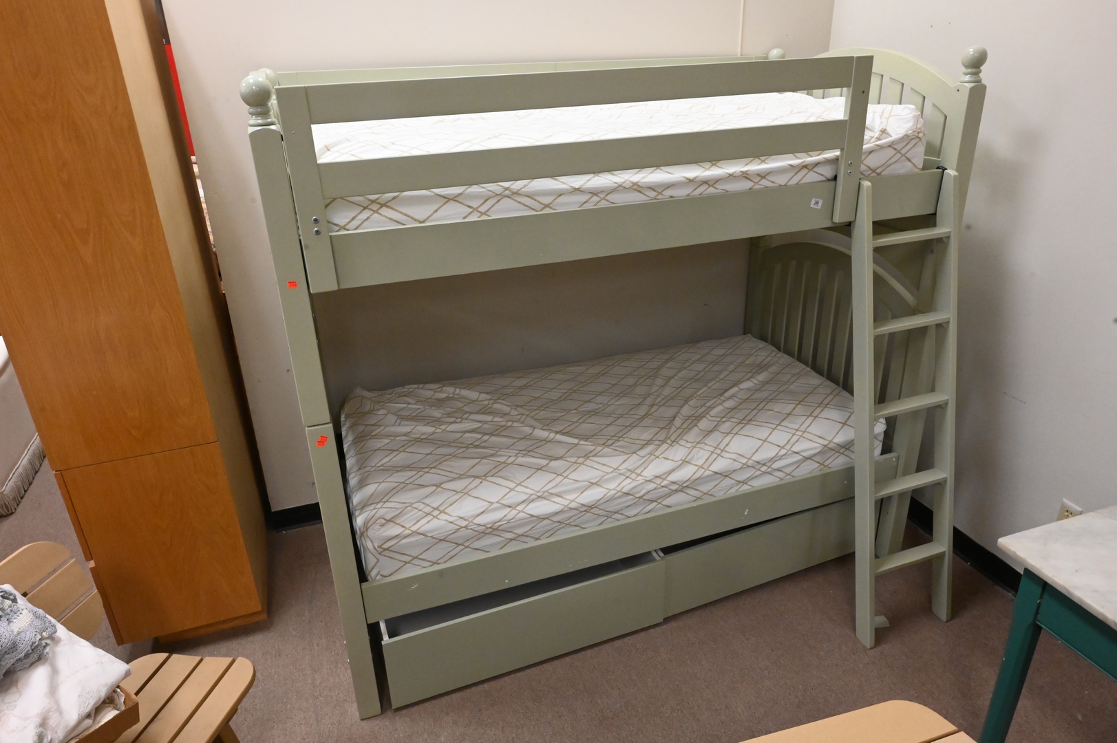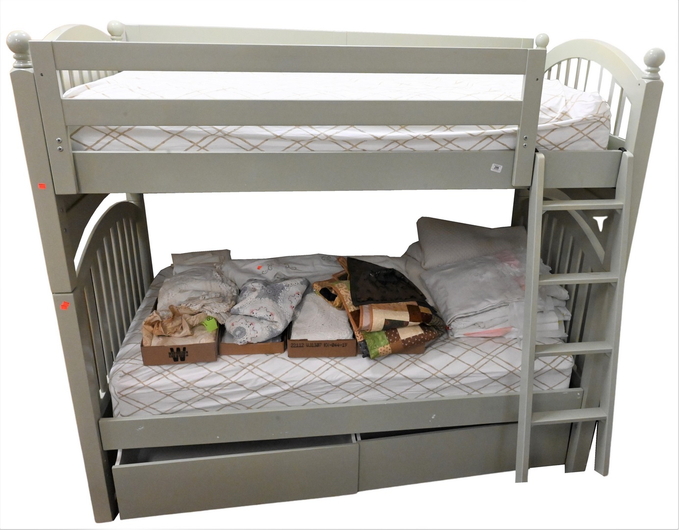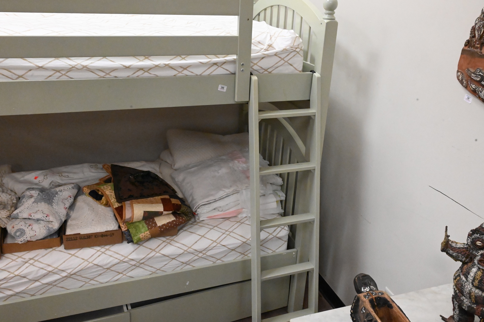 Set of Bunk Beds, complete with mattresses, having drawers in base, height 72 inches, length 82 inches, depth 42 inches.