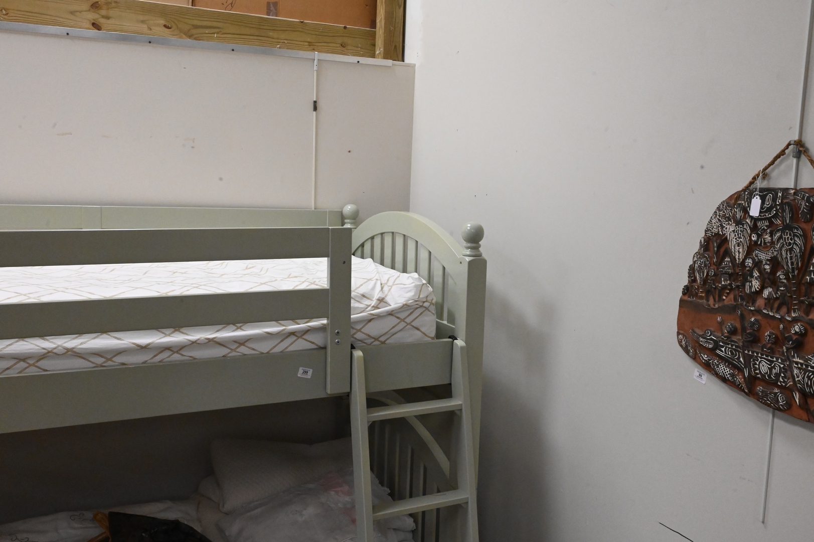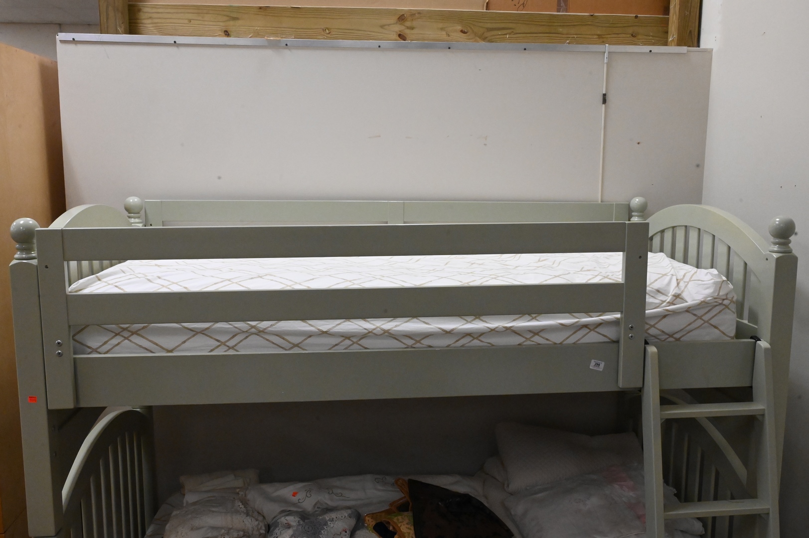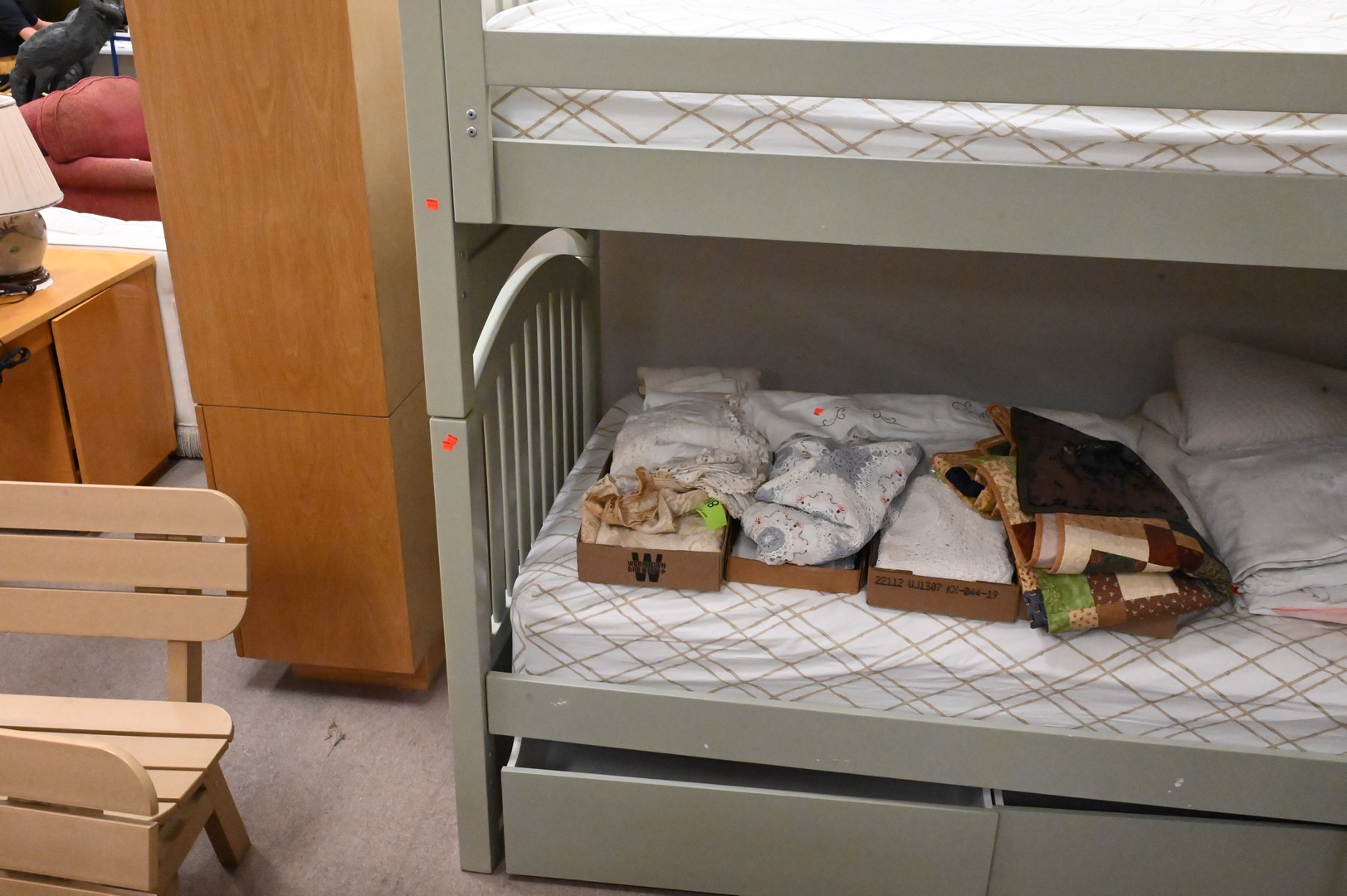 Set of Bunk Beds, complete with mattresses, having drawers in base, height 72 inches, length 82 inches, depth 42 inches.