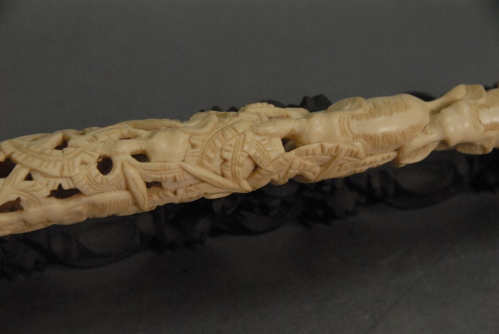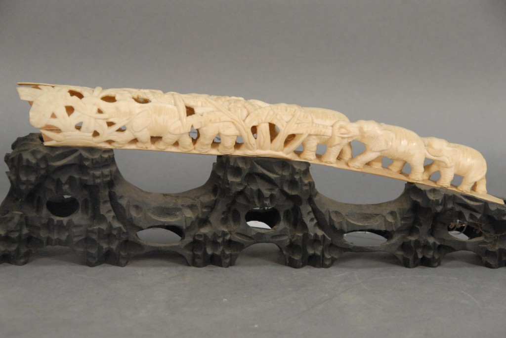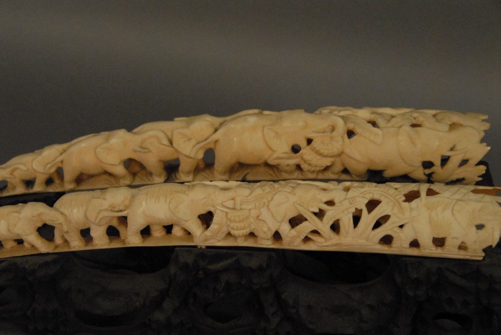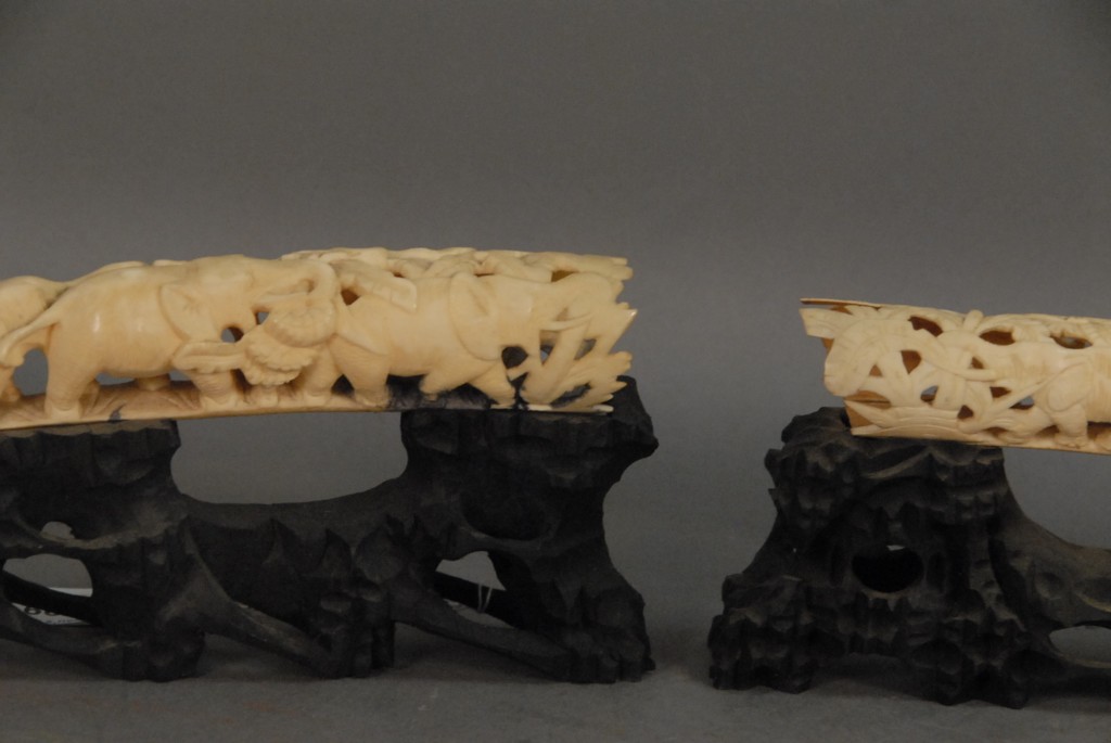 Small pair of carved ivory elephant bridges on carved hardwood bases, lg. 12, ht. 4.