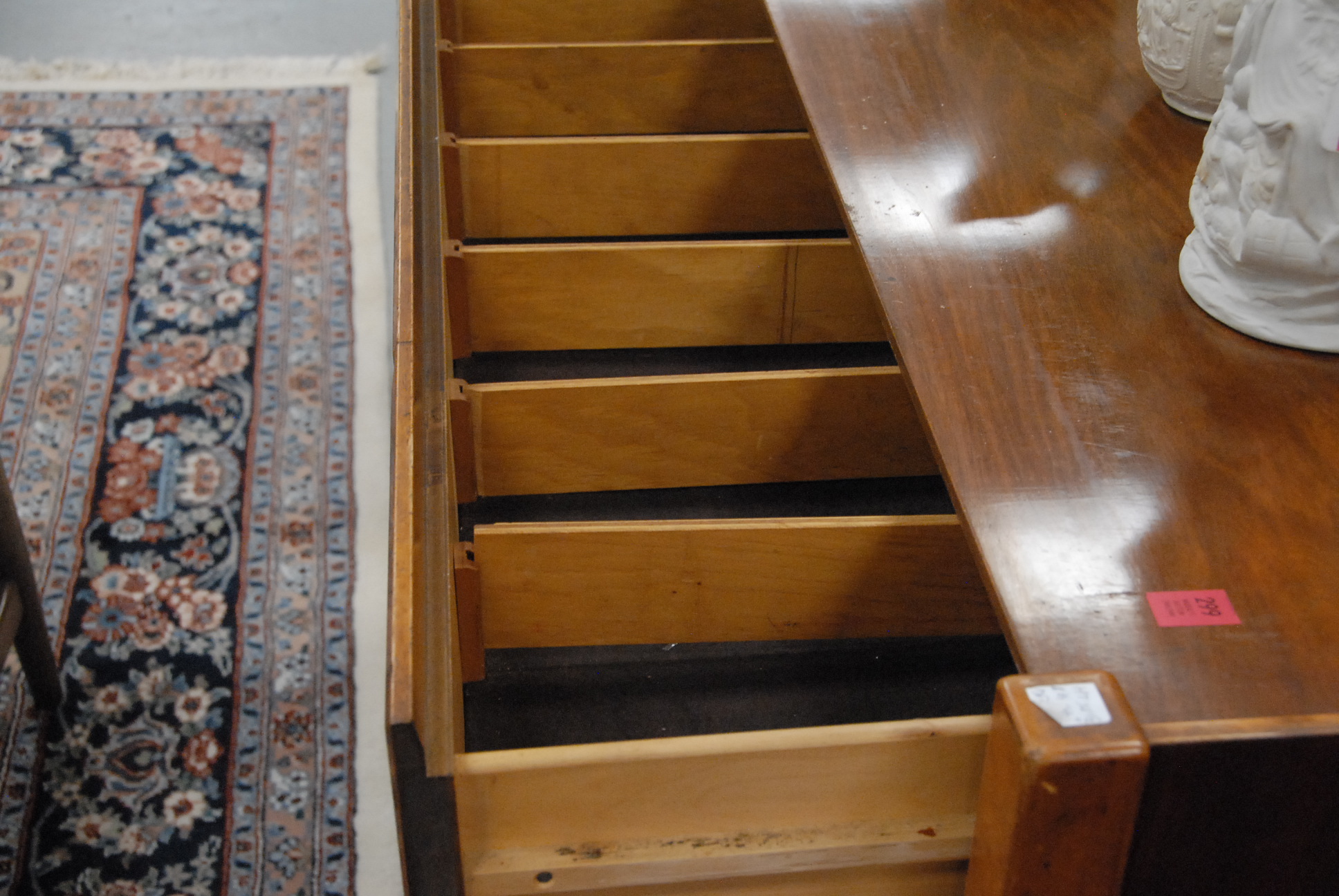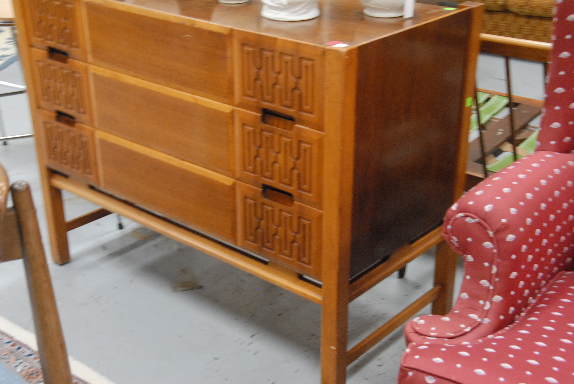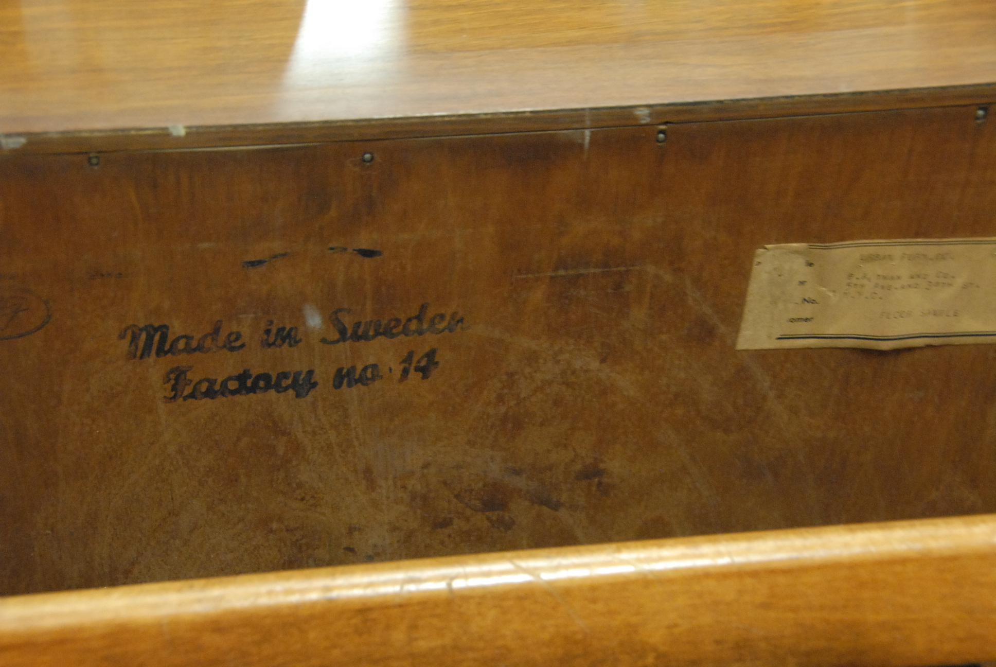 Swedish modern two piece cabinet by the Urban Furniture Company of mixed woods, the upper section with two doors and the lower half with three drawers the reverse of which is marked ‘Made in Sweden, Factory #14, and an indiscernible logo’ as well as a paper label ‘Urban Furn. Co. B. Altman and Co., circa 1949, ht. 32in. wd. 42in.