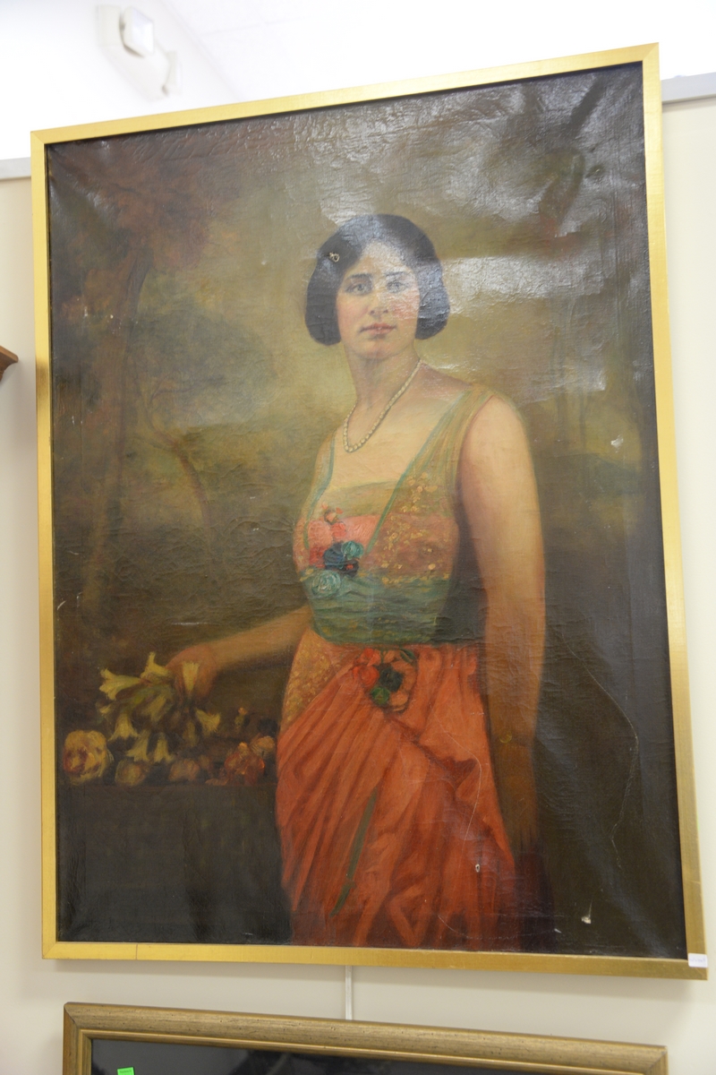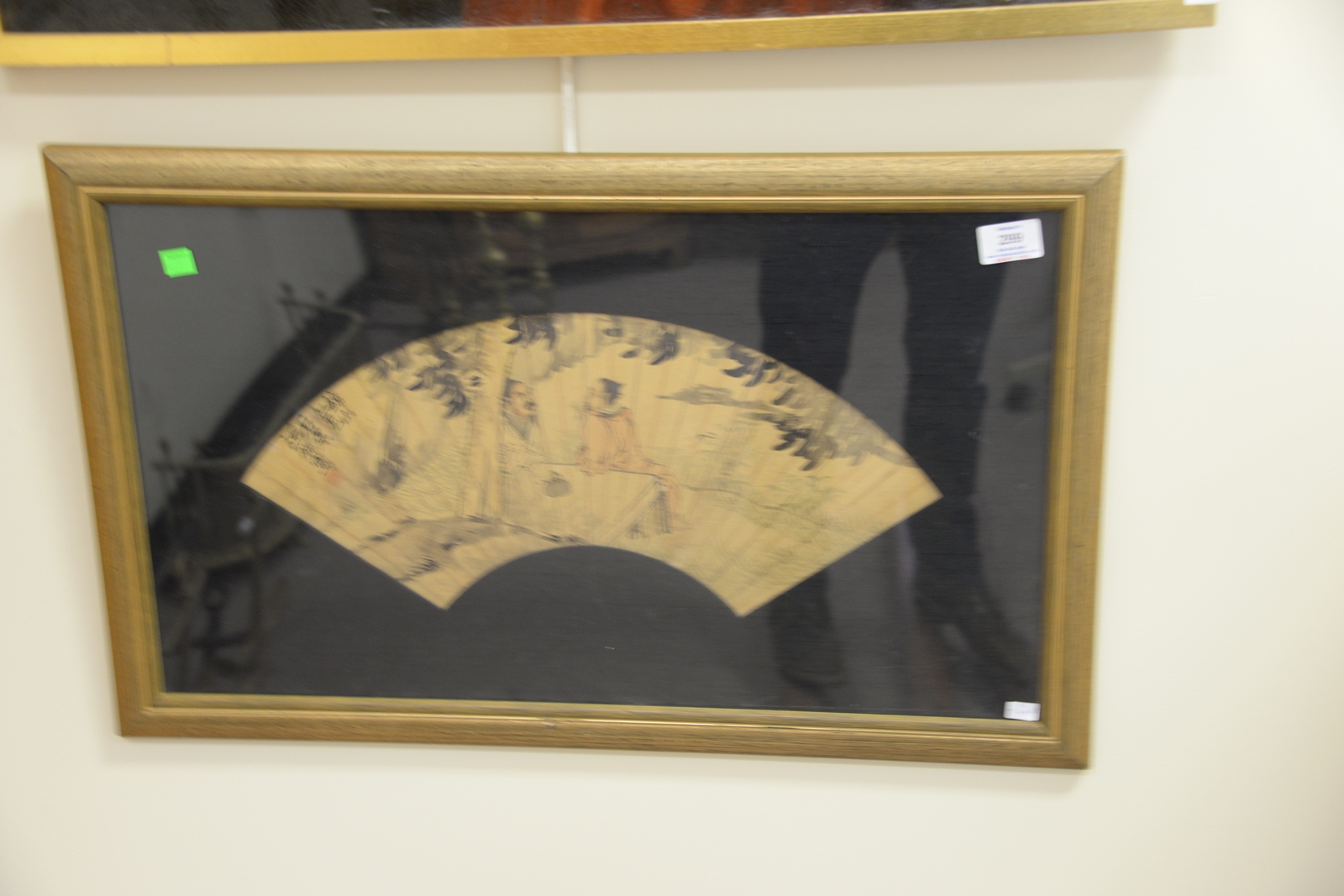 Two framed pieces including an oil on canvas 3/4 length portrait of a woman 40 x 30 and an Oriental framed fan with watercolor of two scrolls sight size 7 x 2.