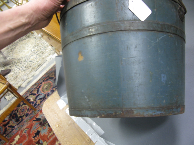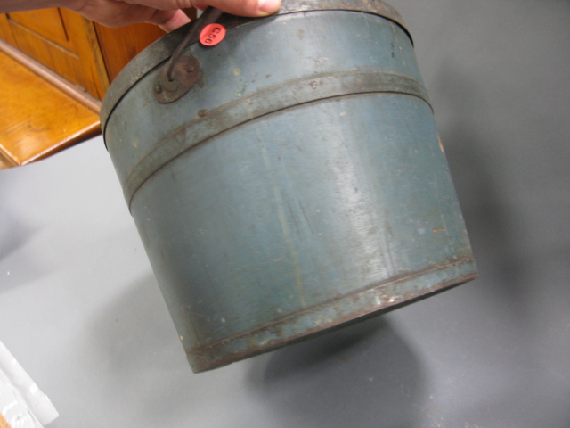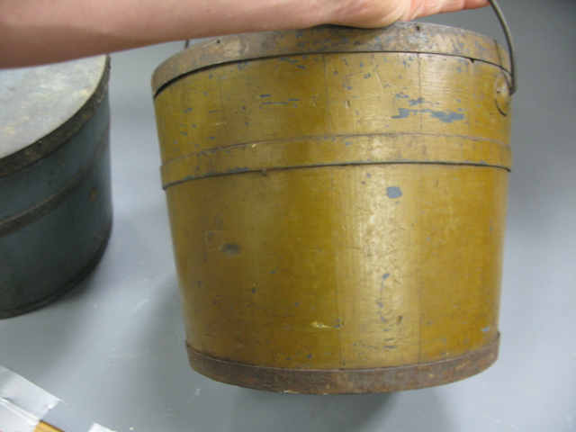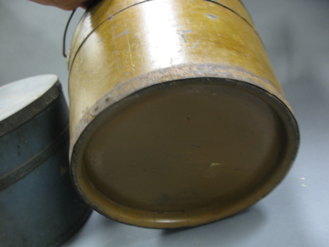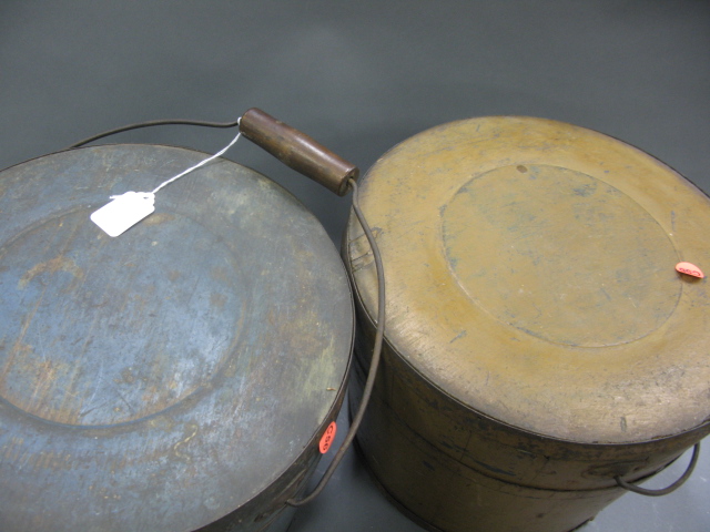 Two primitive covered buckets, one with blue paint, one with brown paint.
