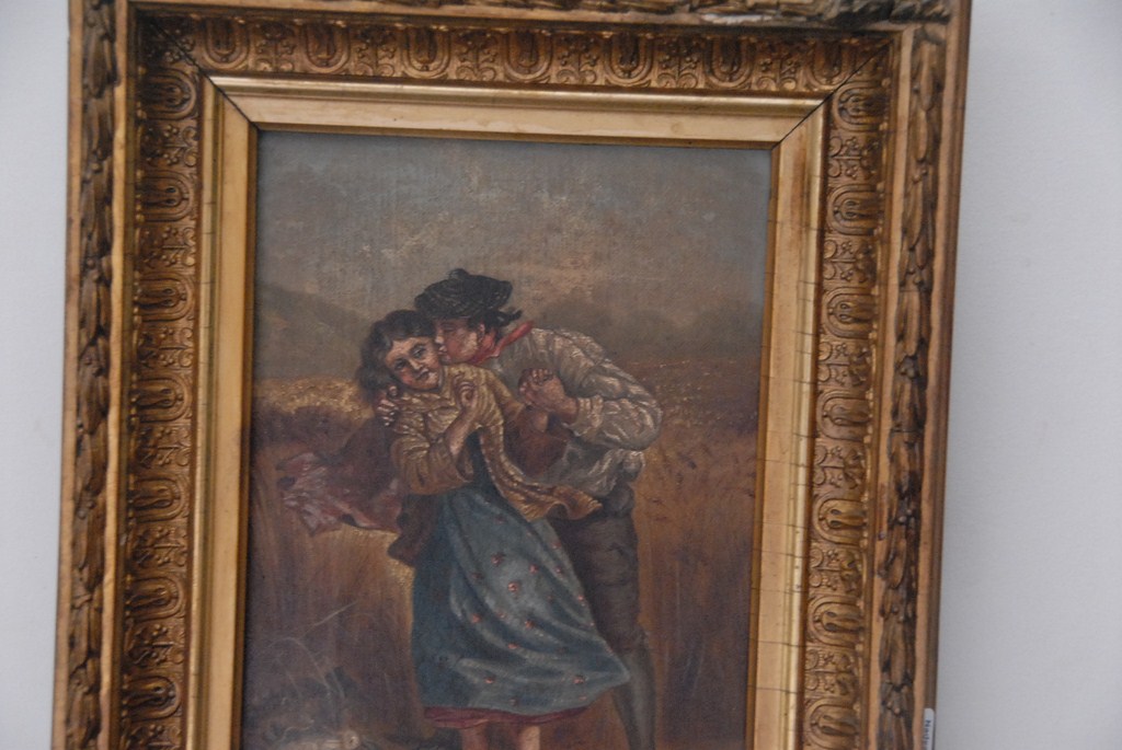 Lot 299: Two small Victorian paintings, one of young man and woman and other with young girl with hat both in Victorian frames.