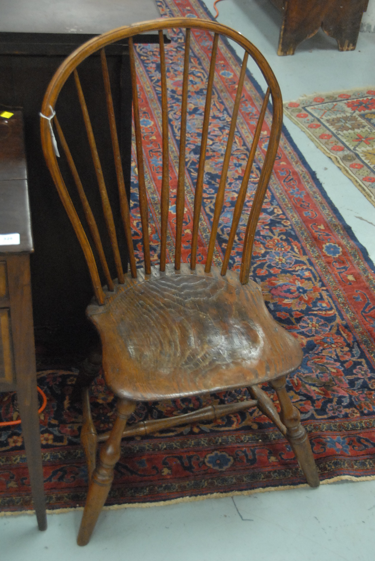 Two Windsor chairs, one bow back side chair signed E. B. Tracy and one continuous armchair. seat ht. 16 1/2 in. & 15 in. Provenance: Property from the Estate of Elizabeth and Edward Wallace of The Tracy House in Meriden, Connecticut.