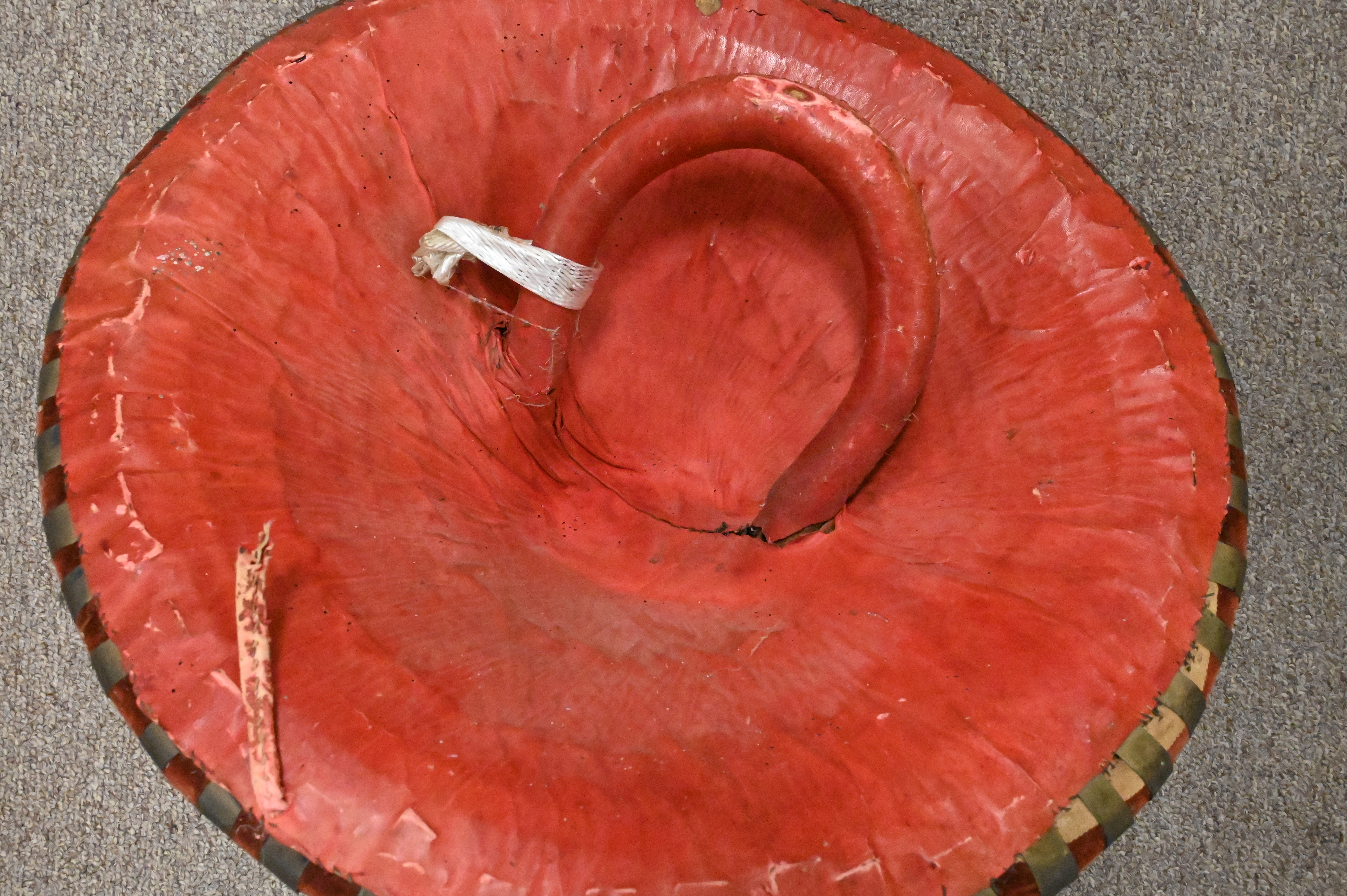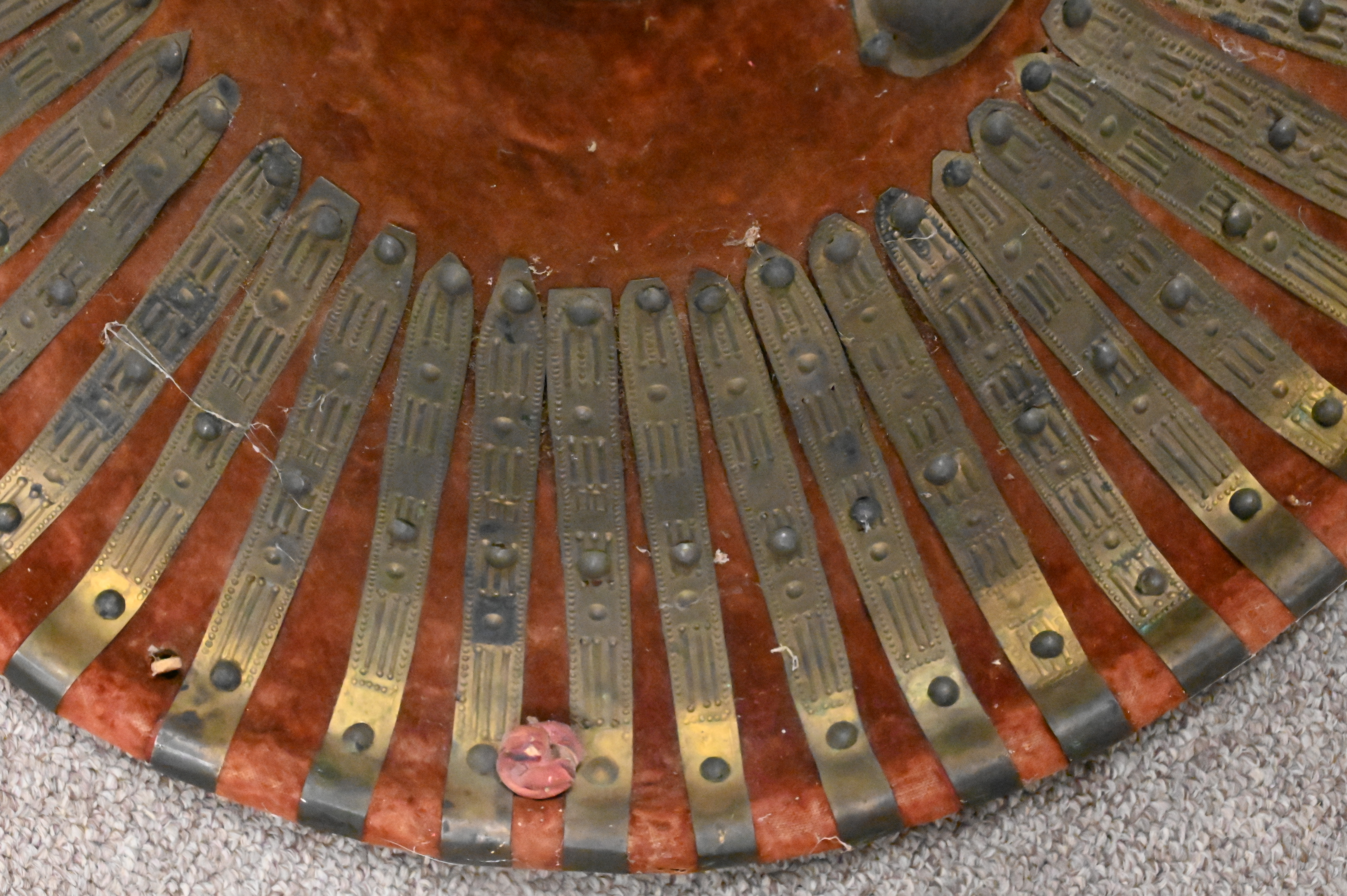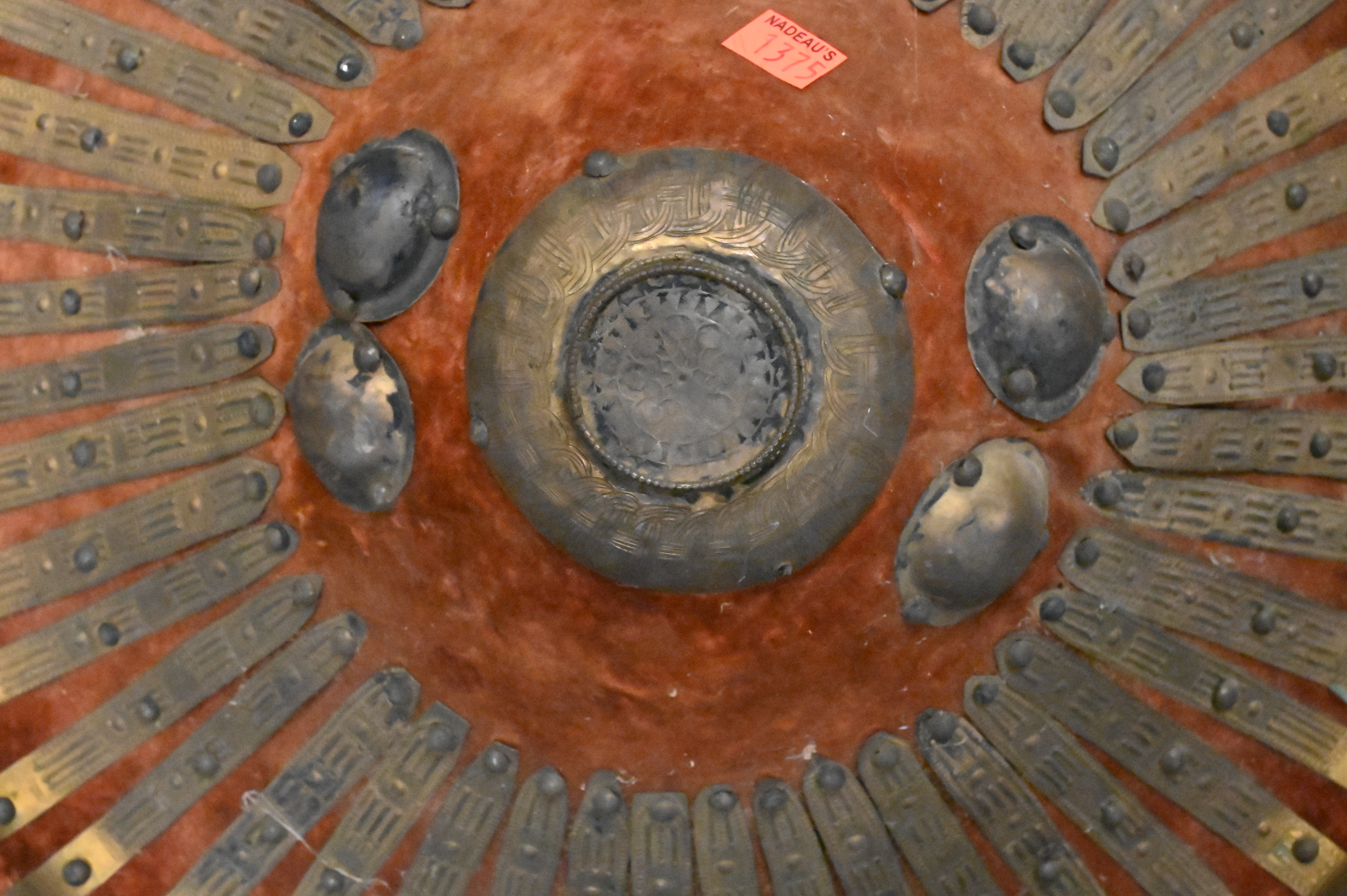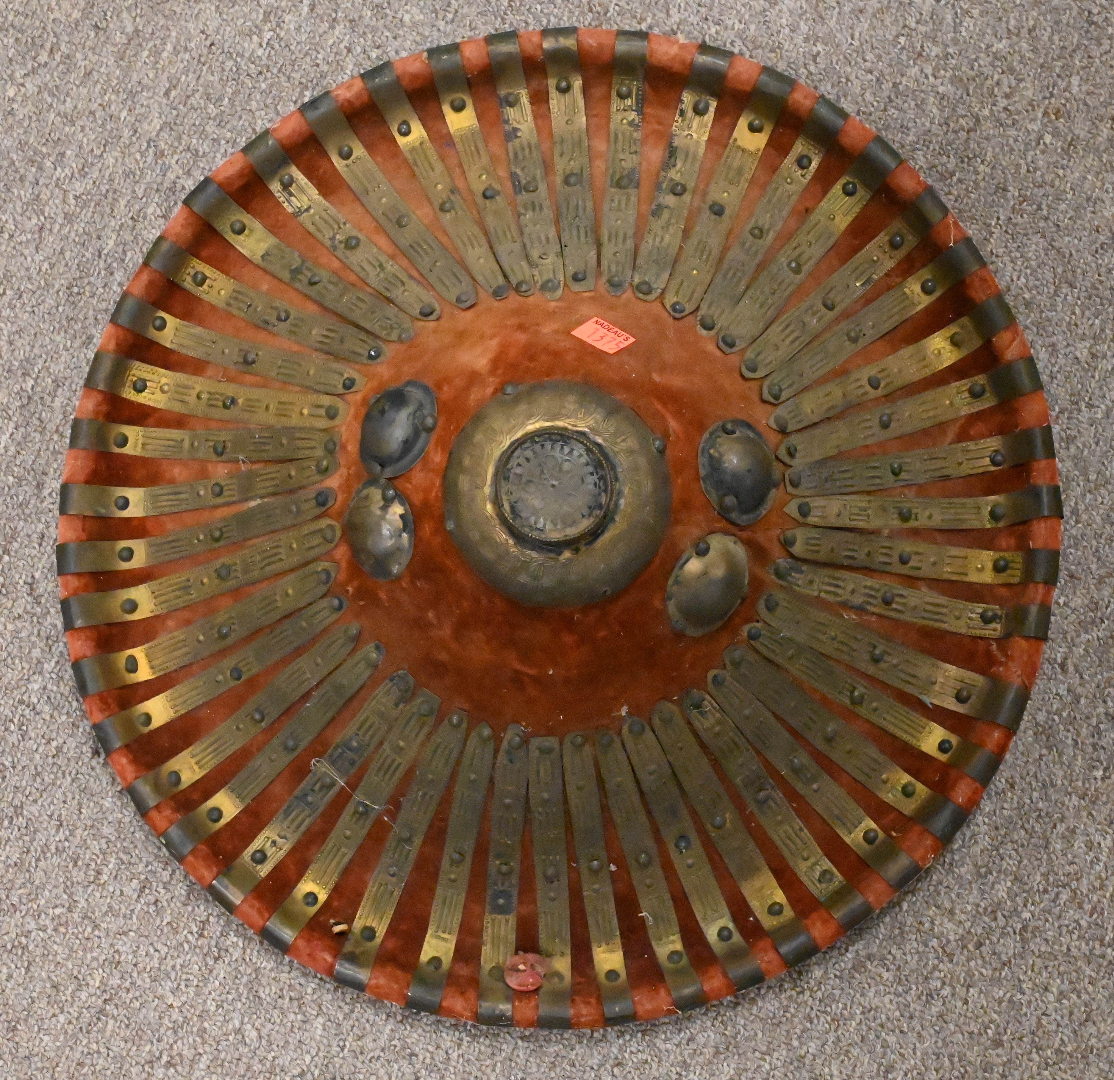 Brass Mounted Shield, having hyde interior and velvet exterior having embossed brass, diameter 17 inches.