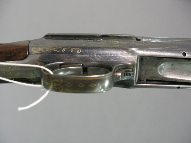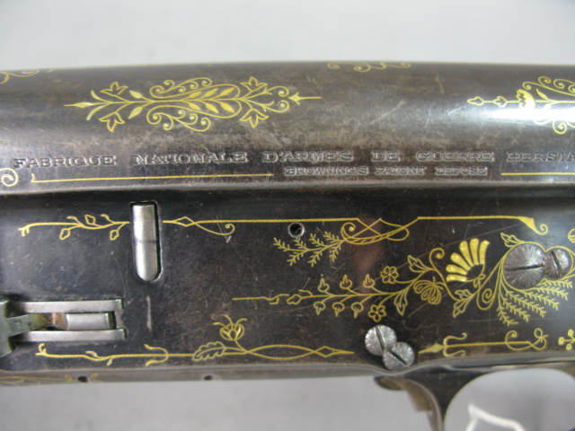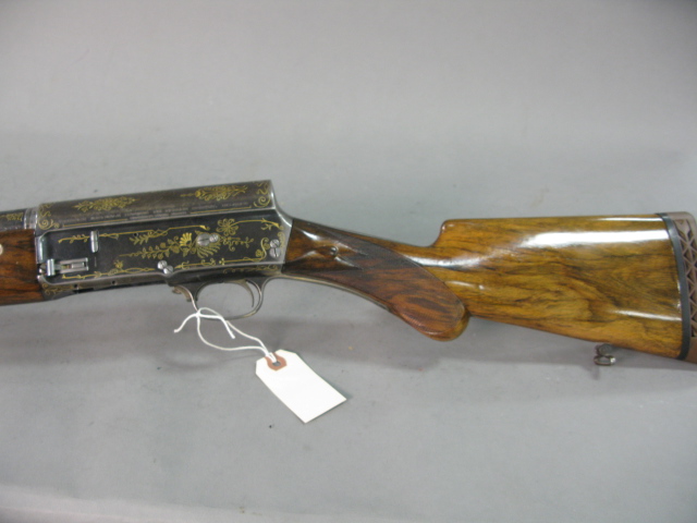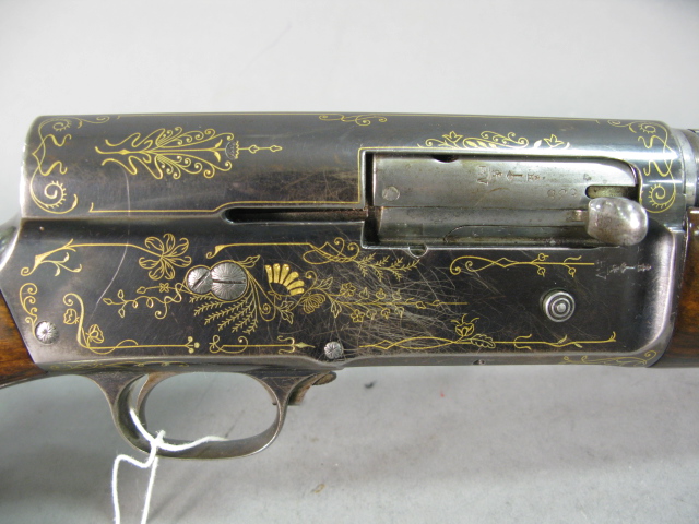 Belgium Browning Auto-5 G4, 16 gauge, semi-automatic shotgun, 28 barrel, gold wash vine decoration on the action, beginning of barrel and trigger guard, with walnut checkered stock and pistol grip. Serial# 48638, code 37