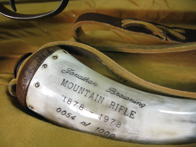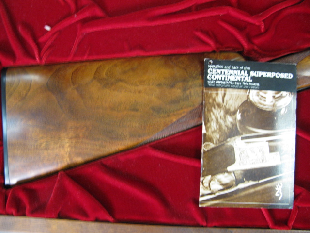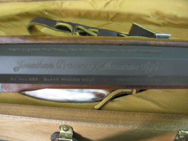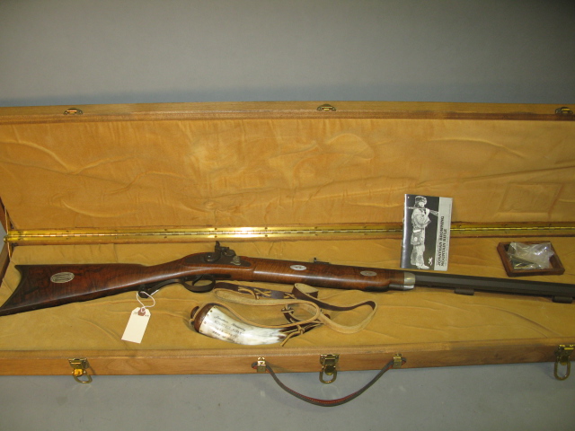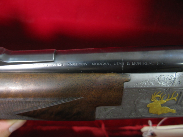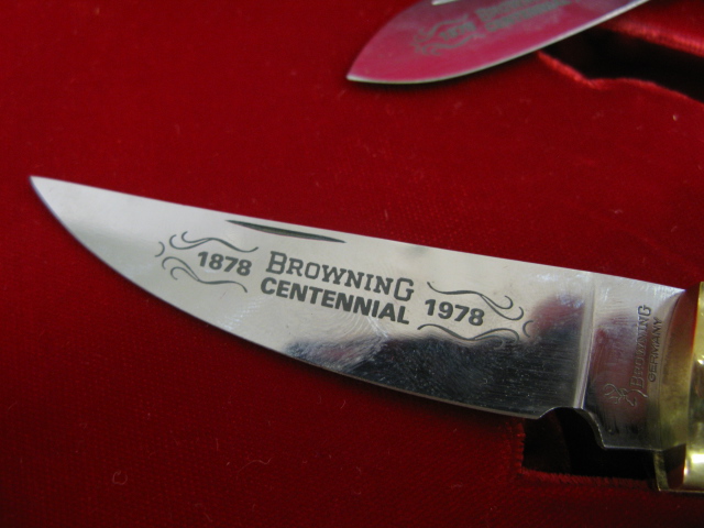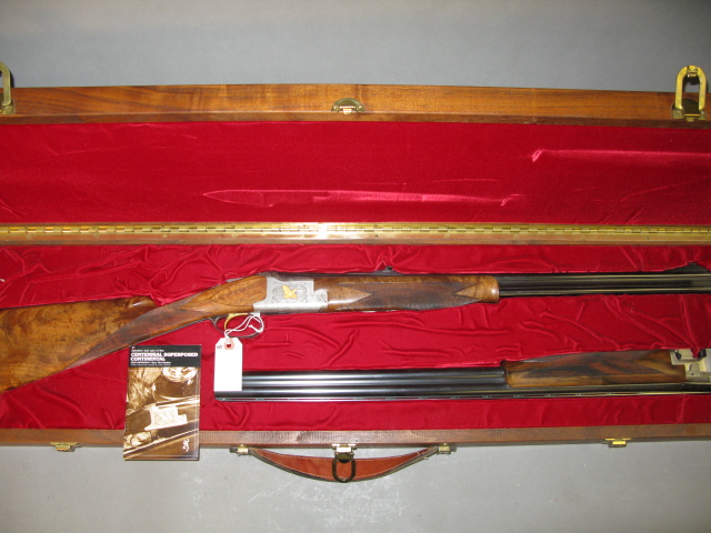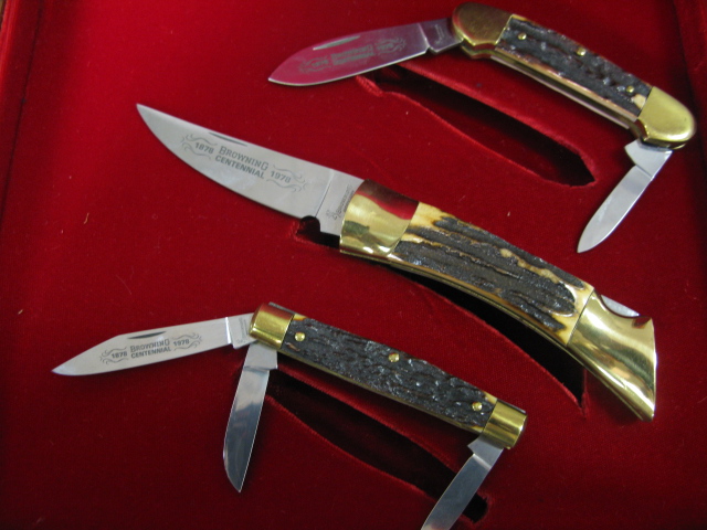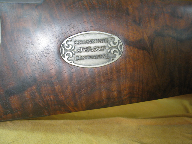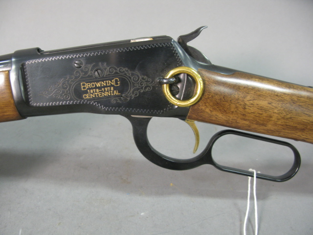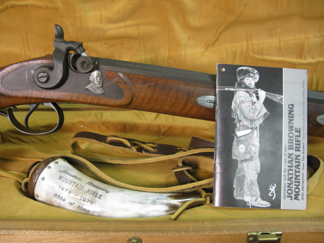 Browning Centennial set, all with matching serial numbers, consisting of: A Browning superposed over/under 30-06 model, 24 with ramp fixed sights, 26 1/2 shotgun barrels with vent rib, single bead sight, 3 chamber, having French gray receiver scroll engraved with gold inlaid grouse on right side, 10 point buck on the left side, and under side marked with a bust of John Browning and Browning Centennial, with gold washed trigger, Serial # 1878C-0054. B Browning model B.92, .44 caliber rifle, lever action, with gold washed trigger and ring, lightly inscribed action with gold washed Browning 1878 – 1978 Centennial on the right side, Serial# 1878B-0054. C Jonathan Browning Mountain Rifle, .50 caliber black powder, walnut stock with pewter forearm cap, iron crescent butt plate, comes with wood cleaning ram rood, commemorative powder horn, all in fitted case, Serial # 1878A-0054. D Along with a polished nickel 9mm luger single action automatic pistol with fixed sights, gold plated trigger with presentation case, three Browning folding knives in presentation case, Serial # 1878D-0054. Serial#’s: A 1878C-0054, B 1878B-0054, C 1878A-0054, D 1878D-0054, E set of 3 matching buck knives, serial # 0054, codes 38, 39, 40 and 41