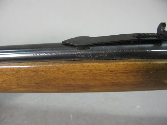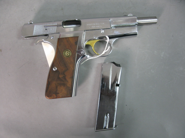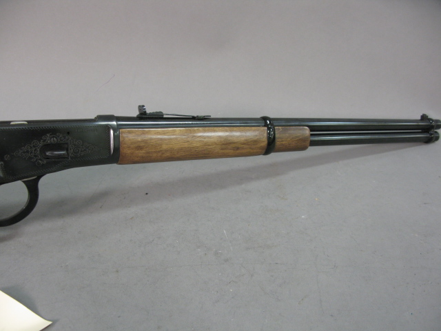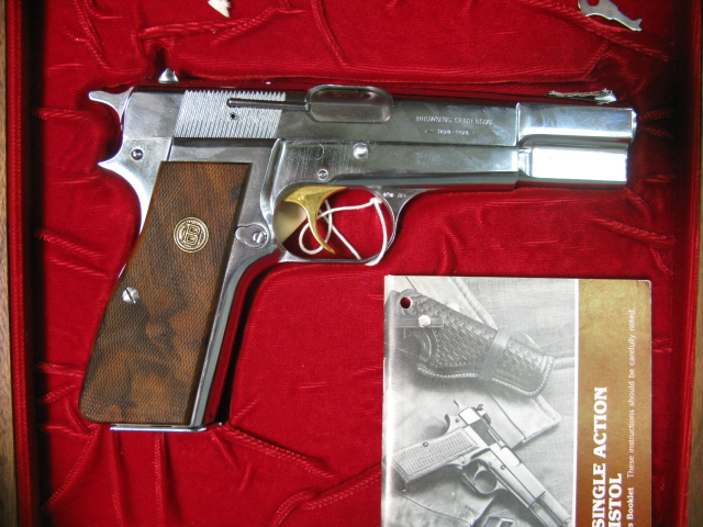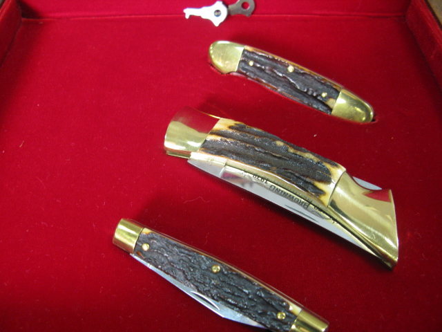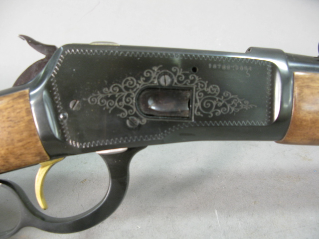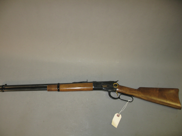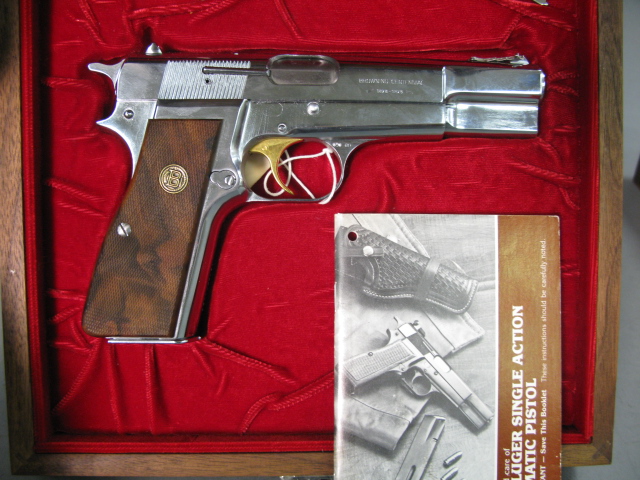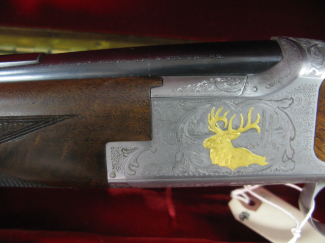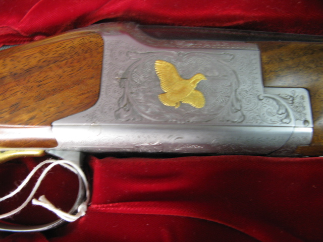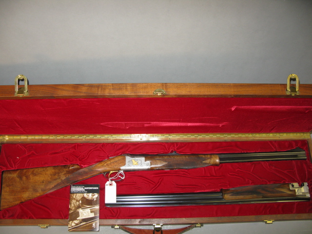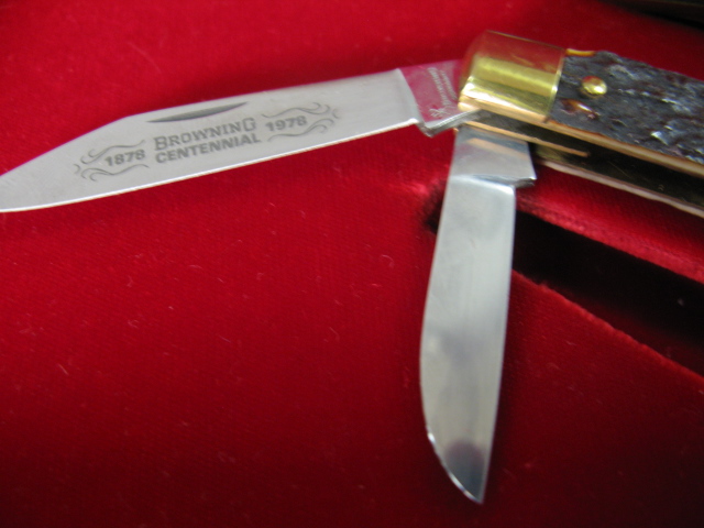 Browning Centennial set, all with matching serial numbers, consisting of: A Browning superposed over/under 30-06 model, 24 with ramp fixed sights, 26 1/2 shotgun barrels with vent rib, single bead sight, 3 chamber, having French gray receiver scroll engraved with gold inlaid grouse on right side, 10 point buck on the left side, and under side marked with a bust of John Browning and Browning Centennial, with gold washed trigger, Serial # 1878C-0054. B Browning model B.92, .44 caliber rifle, lever action, with gold washed trigger and ring, lightly inscribed action with gold washed Browning 1878 – 1978 Centennial on the right side, Serial# 1878B-0054. C Jonathan Browning Mountain Rifle, .50 caliber black powder, walnut stock with pewter forearm cap, iron crescent butt plate, comes with wood cleaning ram rood, commemorative powder horn, all in fitted case, Serial # 1878A-0054. D Along with a polished nickel 9mm luger single action automatic pistol with fixed sights, gold plated trigger with presentation case, three Browning folding knives in presentation case, Serial # 1878D-0054. Serial#’s: A 1878C-0054, B 1878B-0054, C 1878A-0054, D 1878D-0054, E set of 3 matching buck knives, serial # 0054, codes 38, 39, 40 and 41