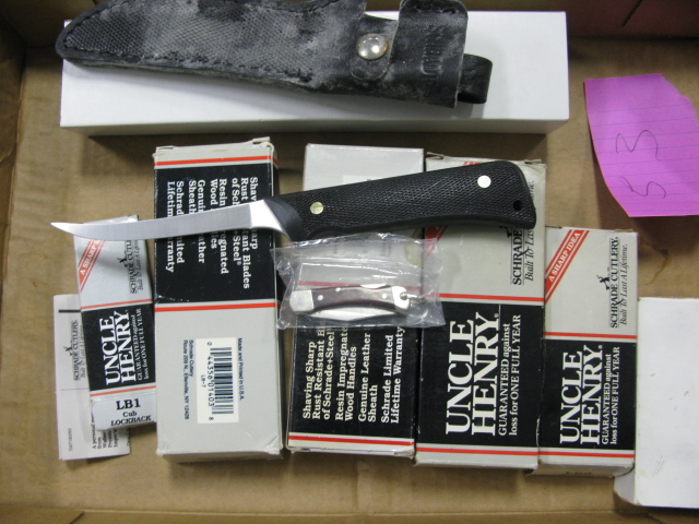Group of 7 schrade knives, 3 are LB-7, 1 LB-5 smokey, 1 LB-3, 1 LB-1 cub, and 1 GF-45 littlemouth.