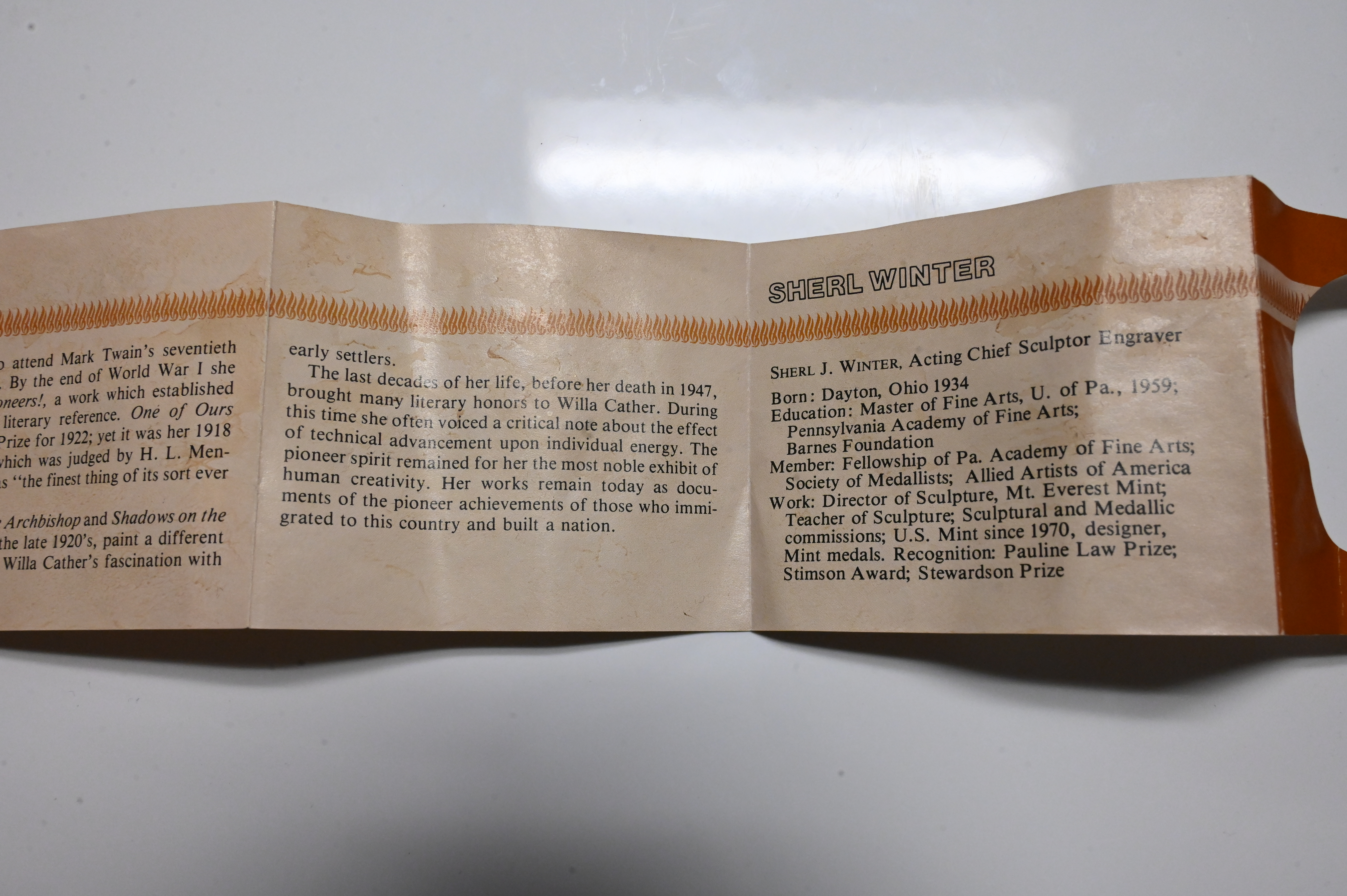 Lot 2H: 1981 Gold Willa Cather 1/2 OZ Pure Gold 21.6K American Arts Medallion