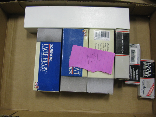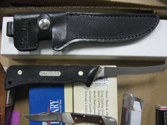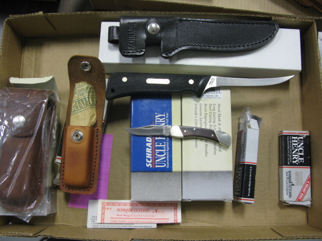 Group of schrade knives, 3 are LB-7, 1-LB5, 1 LB-3, 1 LB-1 cub, and 1 GF-45 littlemouth.