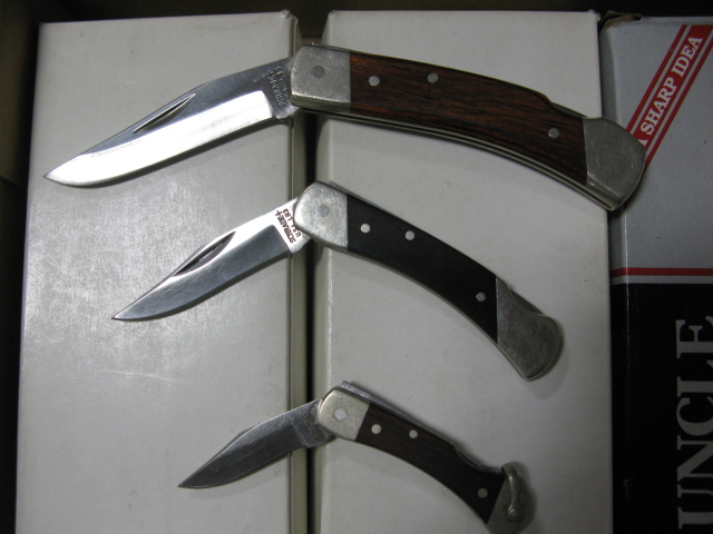 Group of 7 schrade knives 3 LB-7, 1 LB-5, 1 LB-3, 1 LB-1 and a filet knife.