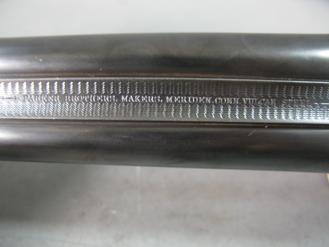 Parker Brothers VHE grade double barrel shotgun, 20 gauge, marked on solid serrated edge Parker Brothers Makers, Meriden, Conn. Vulcan Steel, with brass bead sight, scroll and flower design on action, beginning of the barrel, trigger safety, and break lever, with walnut stock checkered beavertail forearm and pistol grip, excellent condition. Serial# 147976, code 35