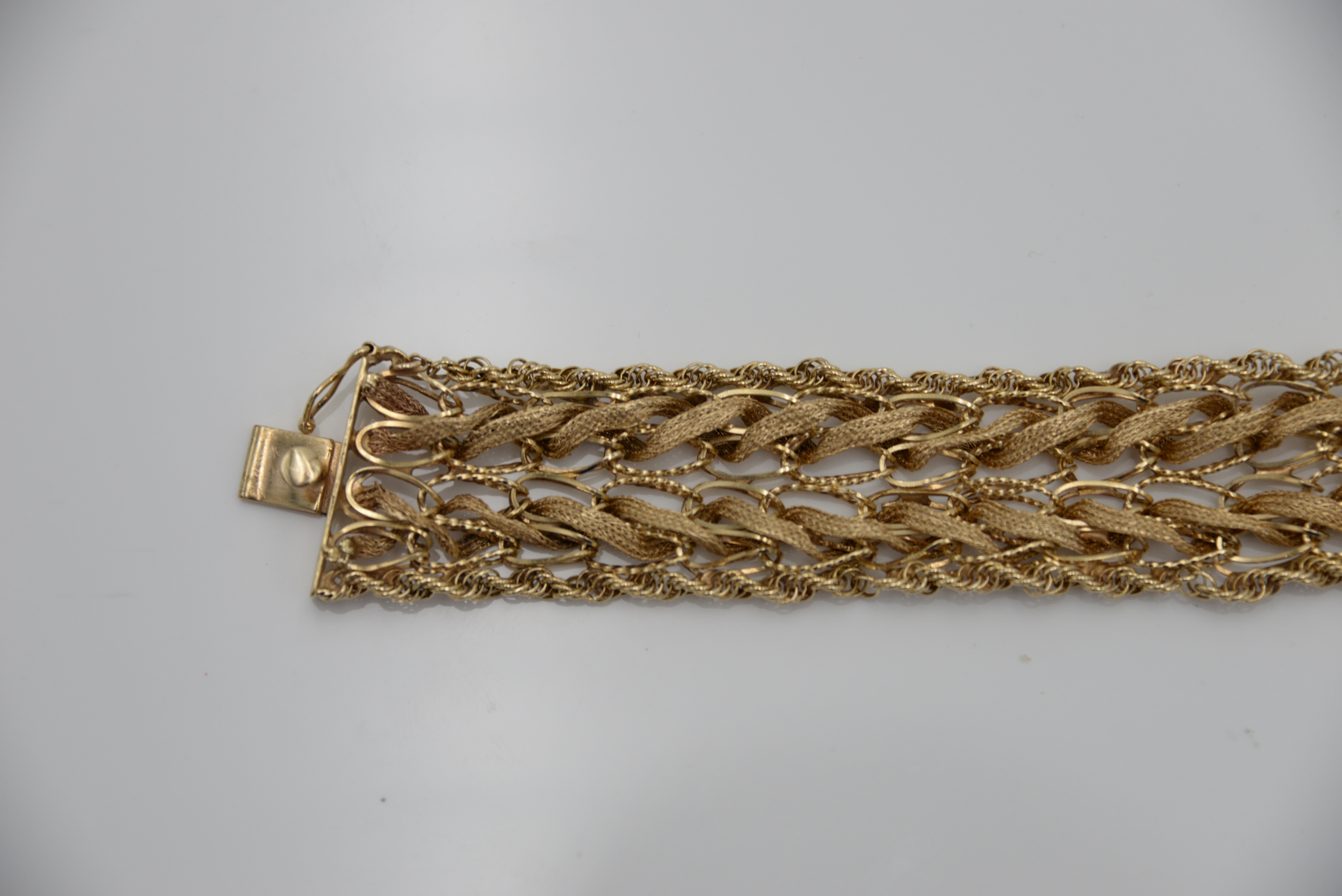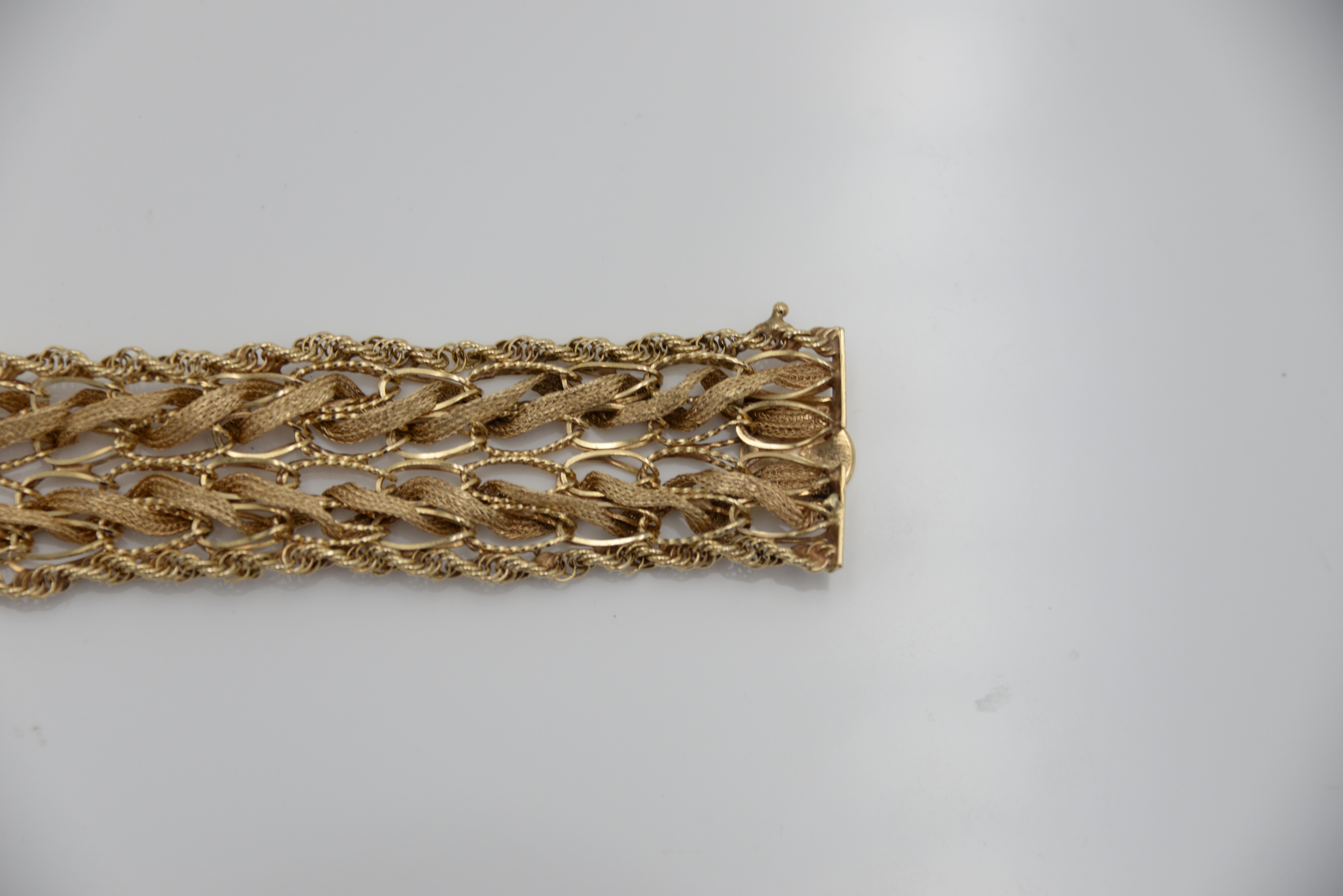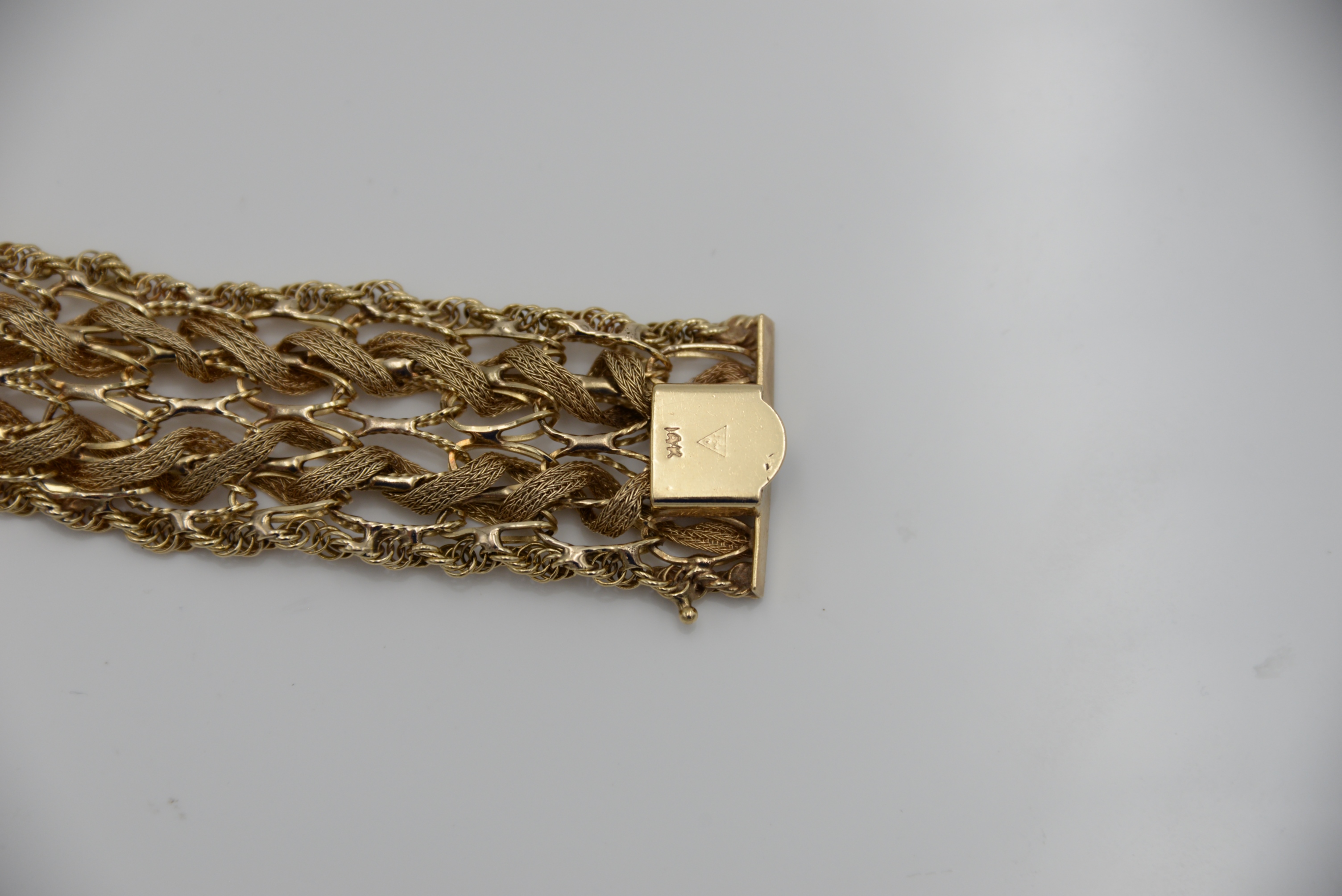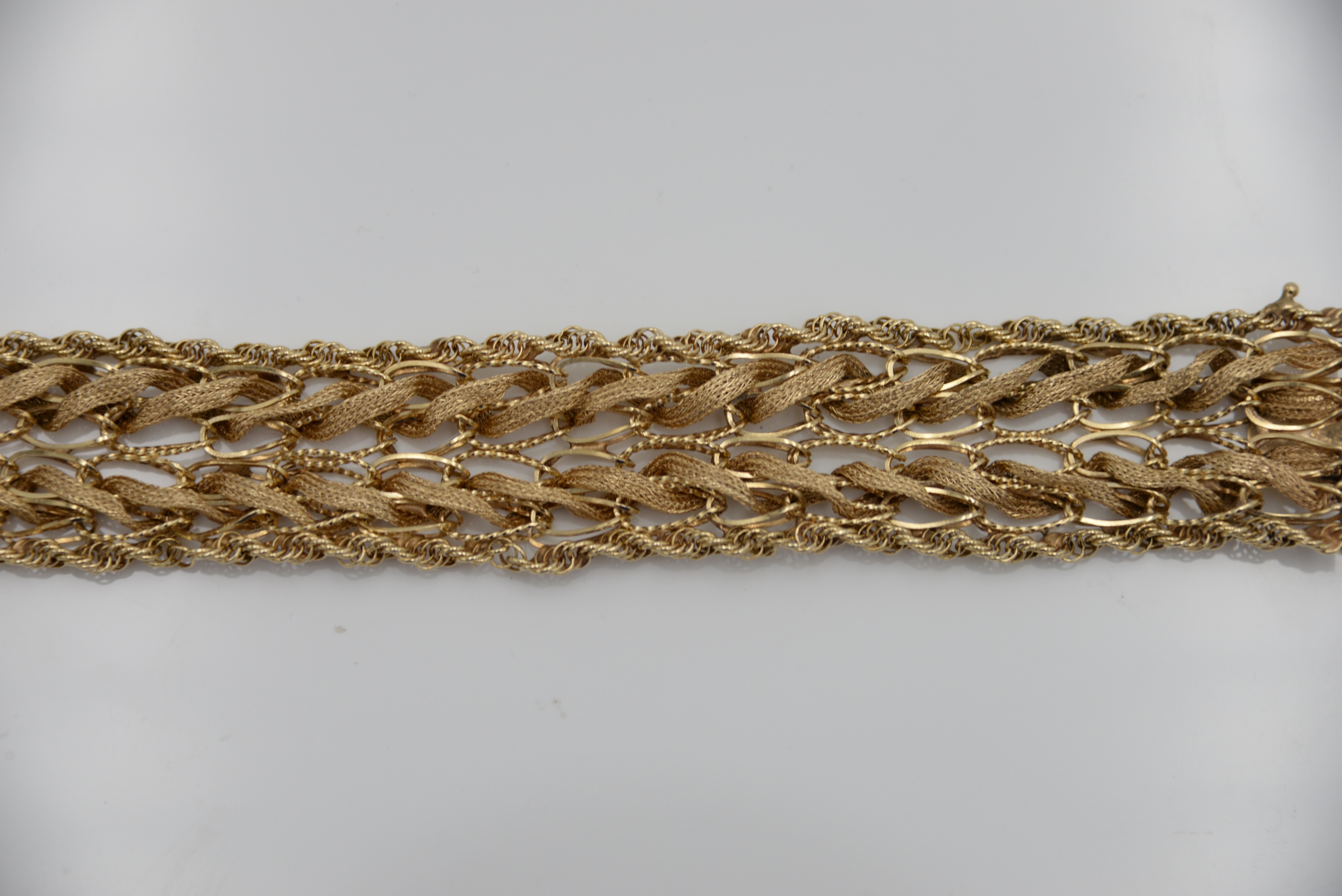 14 Karat Yellow Gold Woven Bracelet having various weaves length 6 3/4 inches, width 1 inch, 37 grams.