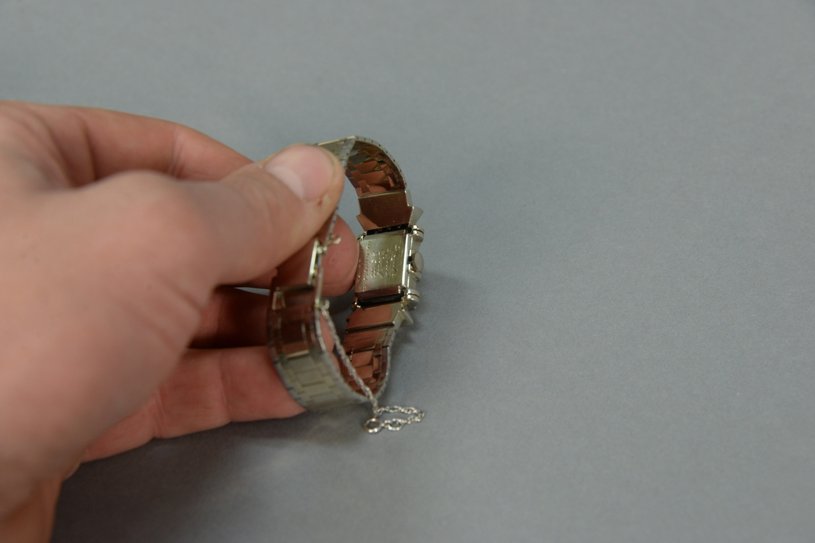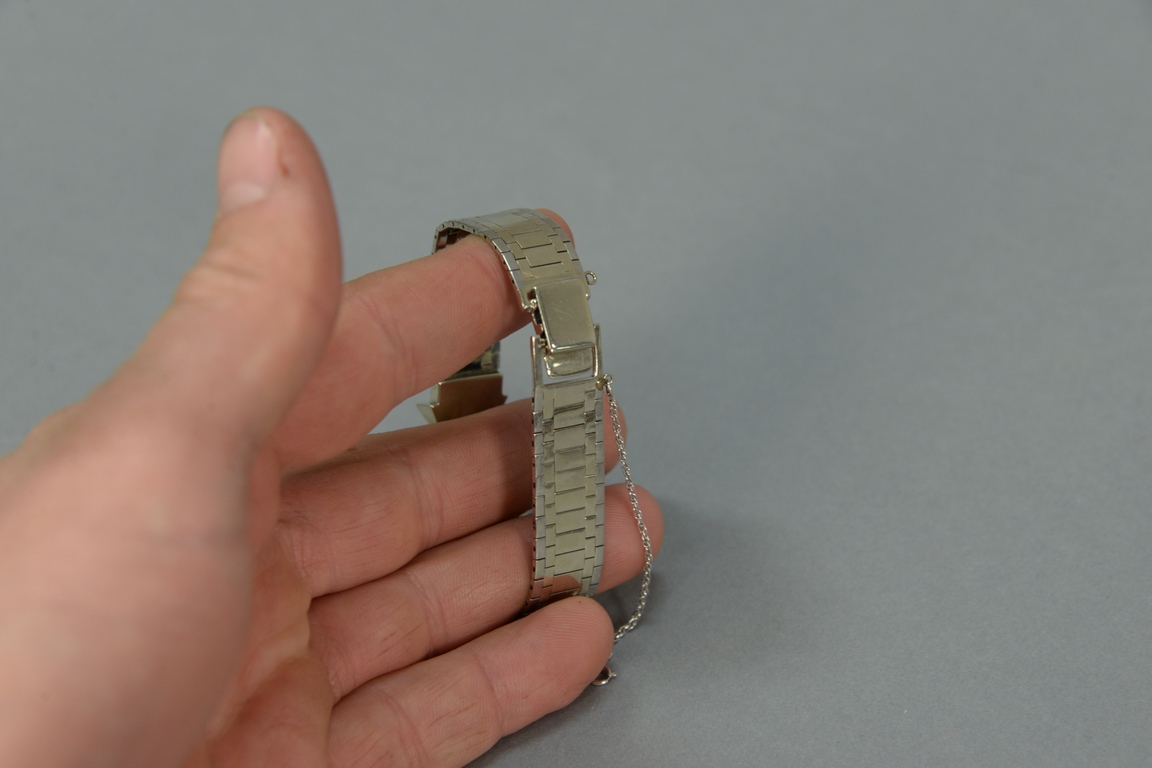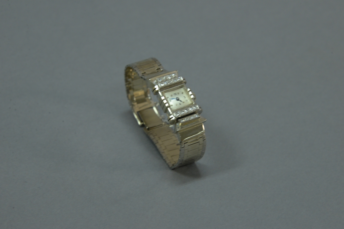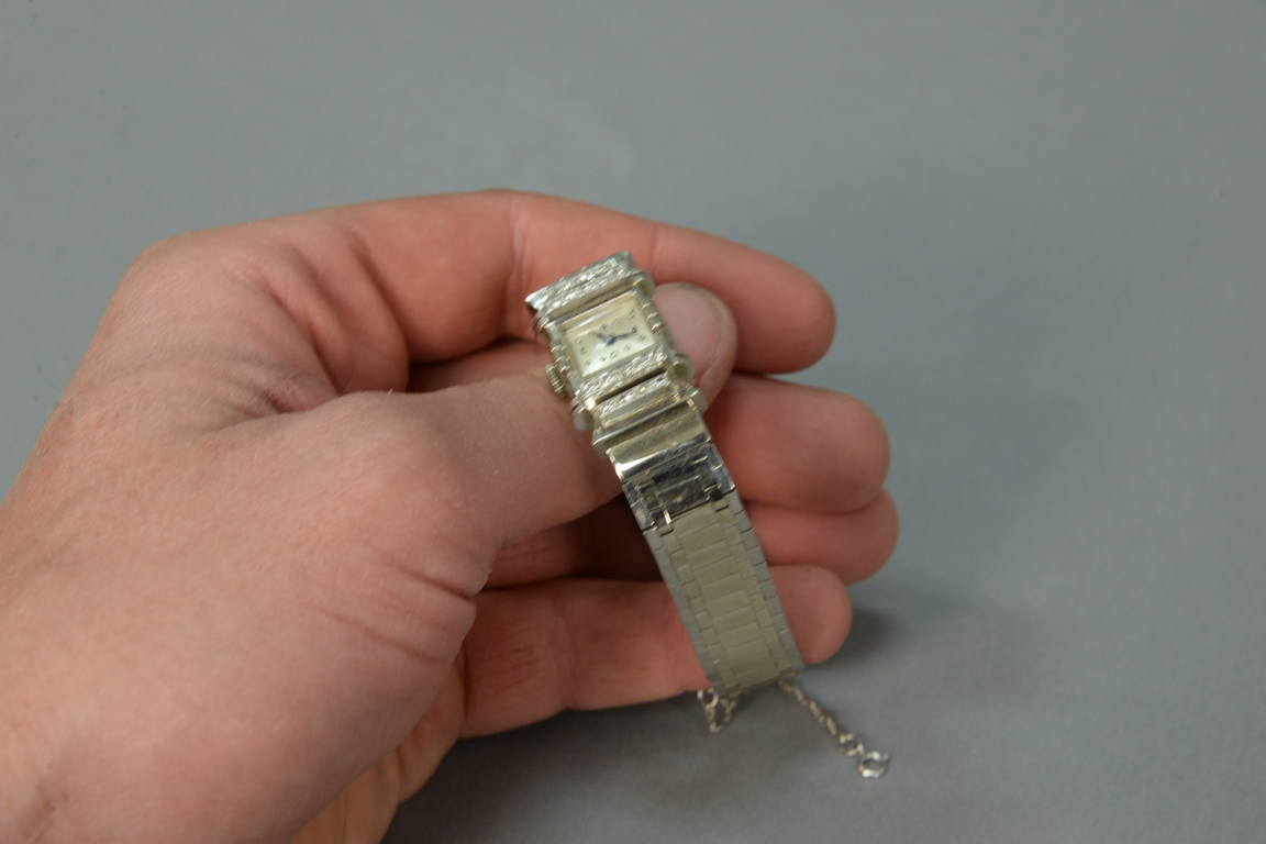 Lot 3: 14K white gold ladies wristwatch, mesh band and square face set with 18 diamonds. total weight 41.2 grams, lg. 6 1/2in.