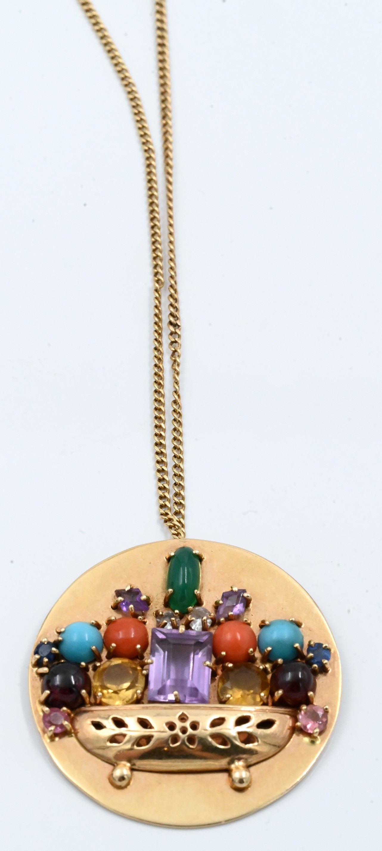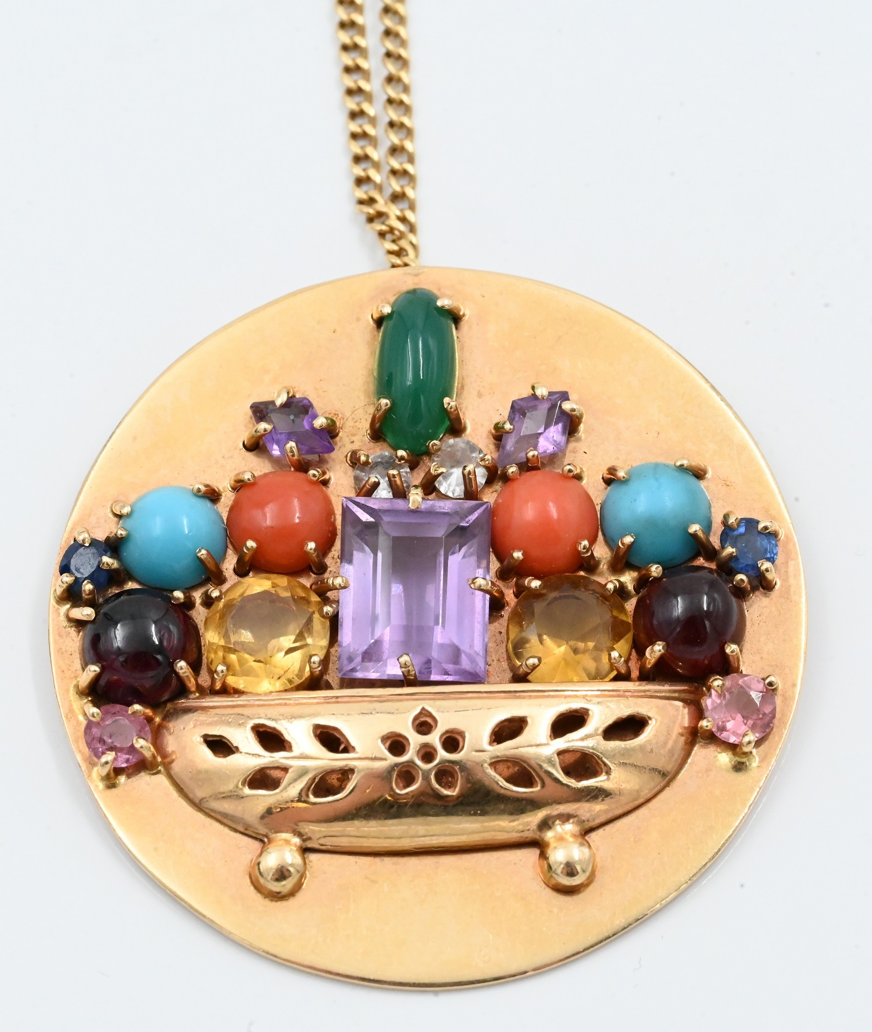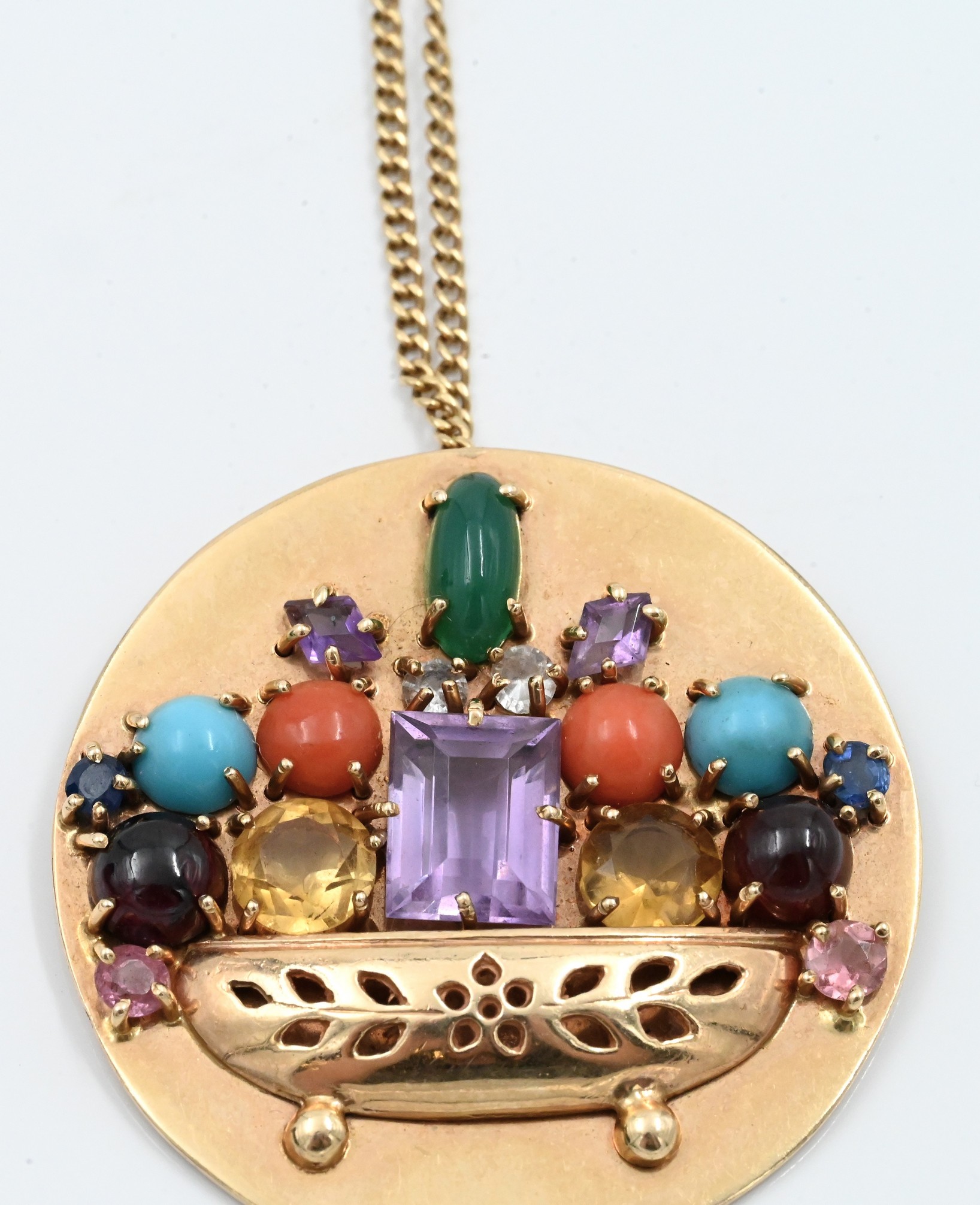 pendant set with multi colored gemstones in the form of a bushel of flowers