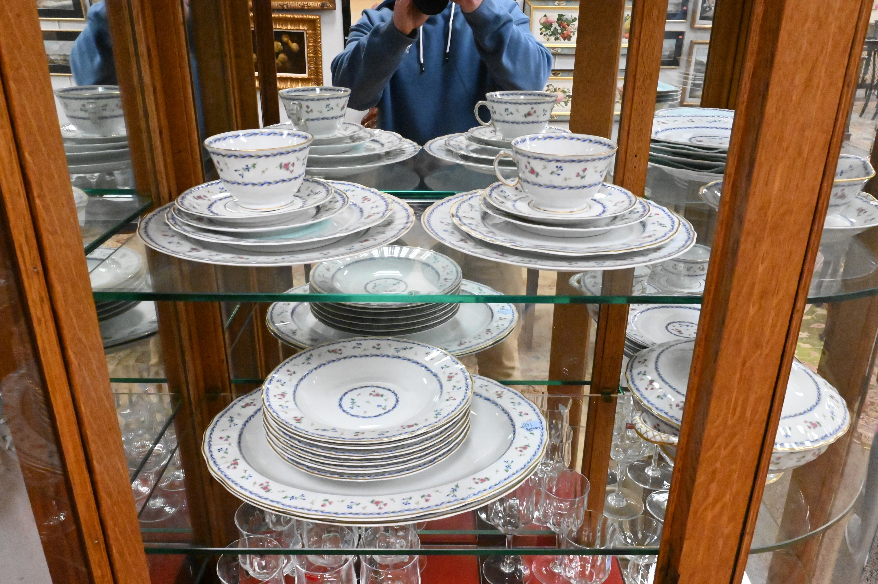 elegant porcelain dinner service for 12 in the Artois bleu pattern, decorated after the Manufacture du Comte d’Artois, late 18th century, each piece with scattered floral sprigs, blue laurel banding, and gilt rims, includes full place settings for 12: dinner plate, salad plate, bread and butter plate, soup bowl, tea cups and saucers, together with serving pieces, teaware, and additional accessories, all marked Bernardaud Limoges France – Artois bleu – Harrods London, porcelain with gilt decoration