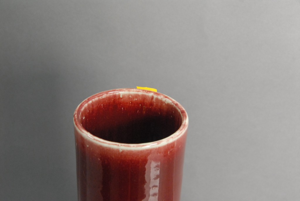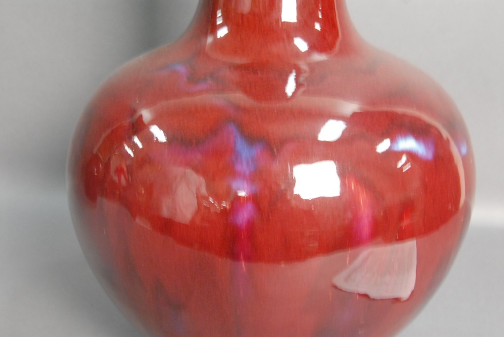 Lot 3: A large red flamb glazed bottle vase, having bulbous body and tall neck, covered in a dark rich red glaze with purple swirled areas…