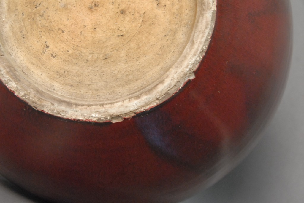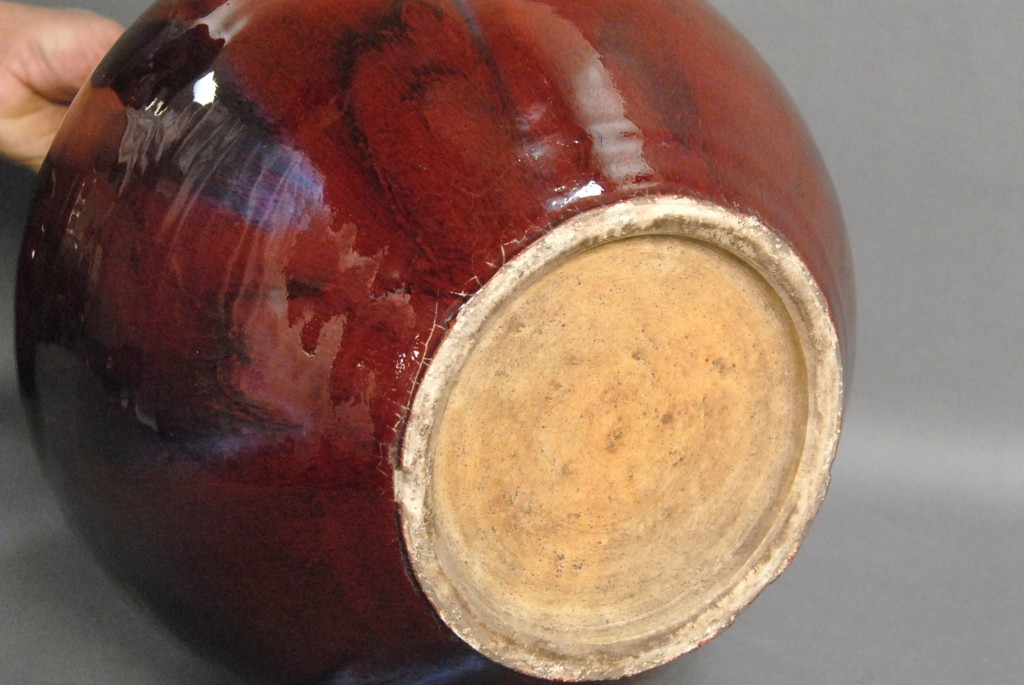A large red flamb glazed bottle vase, having bulbous body and tall neck, covered in a dark rich red glaze with purple swirled areas, thinning up to the top rim, 18th – 19th century, ht 21.
