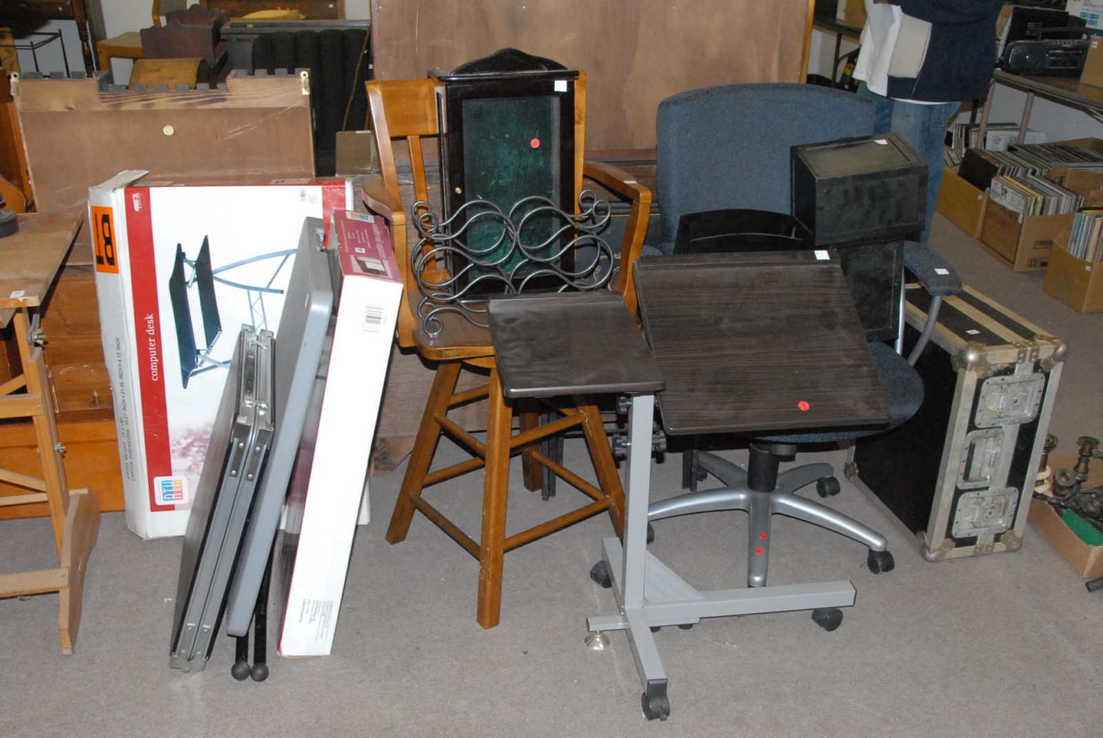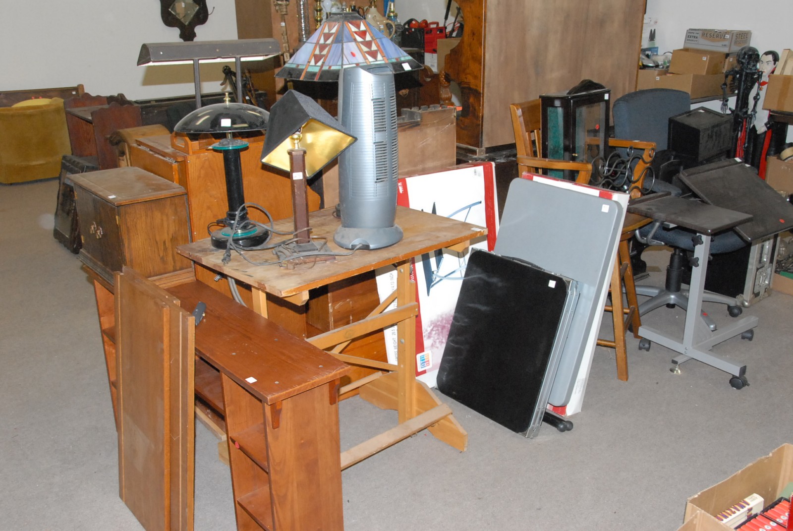 Large group lot of furniture to include office chair, small folding table, drafting table, drawered cabinets, hutch, lamps, and misc