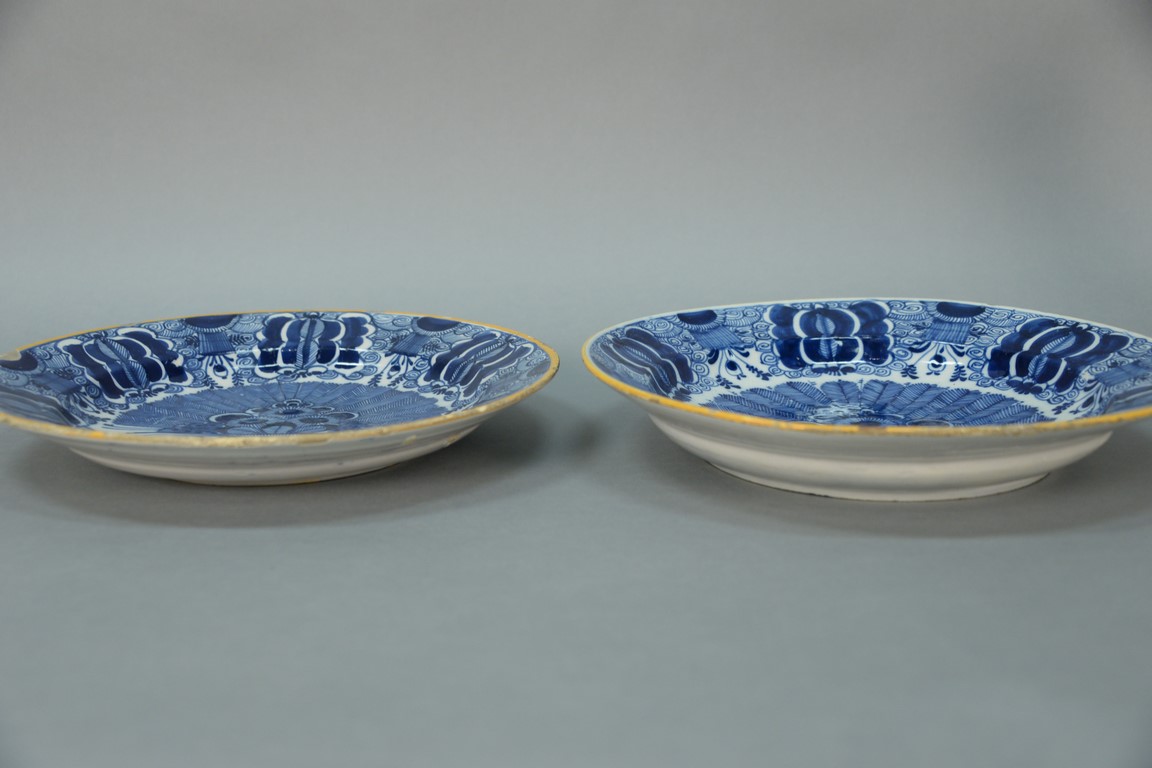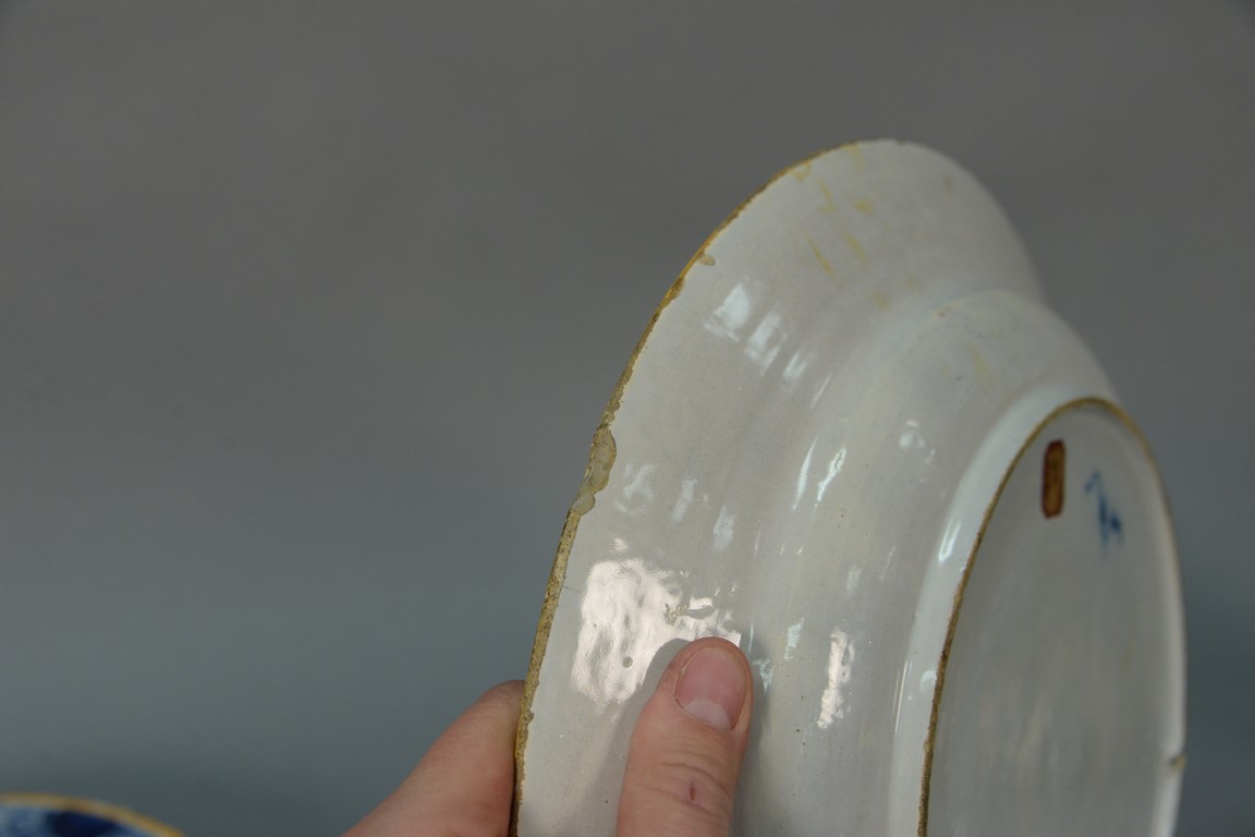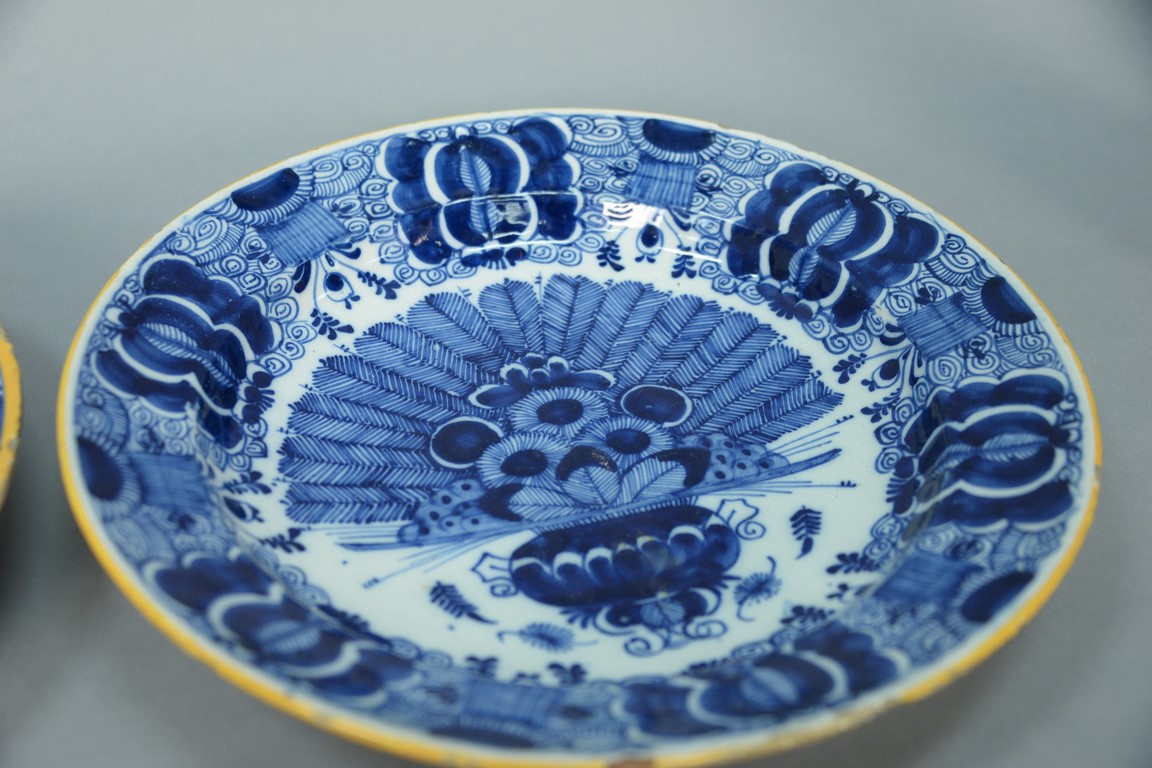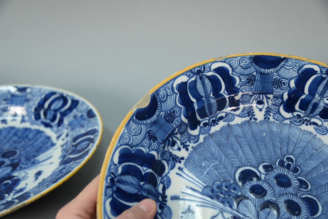 Pair of Delft tin glazed deep chargers, each with yellow rims, probably 18th century.